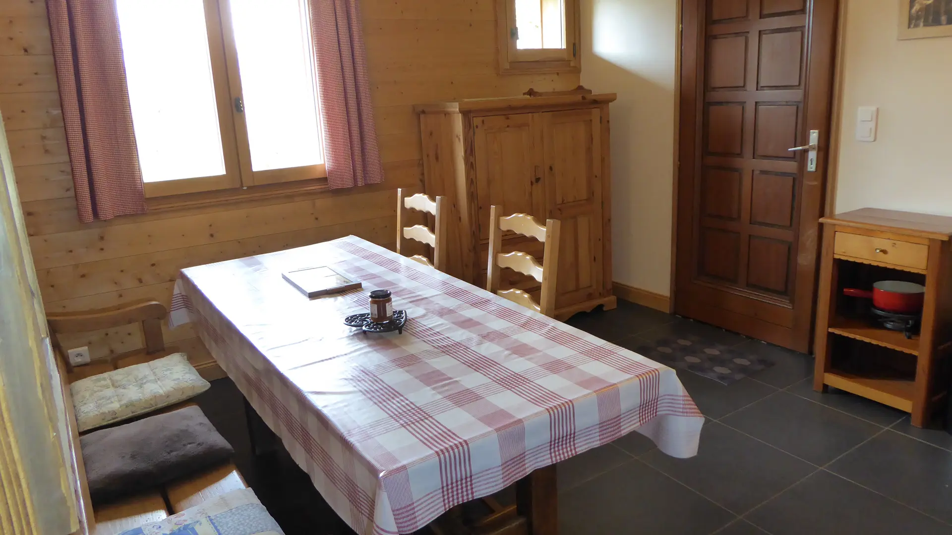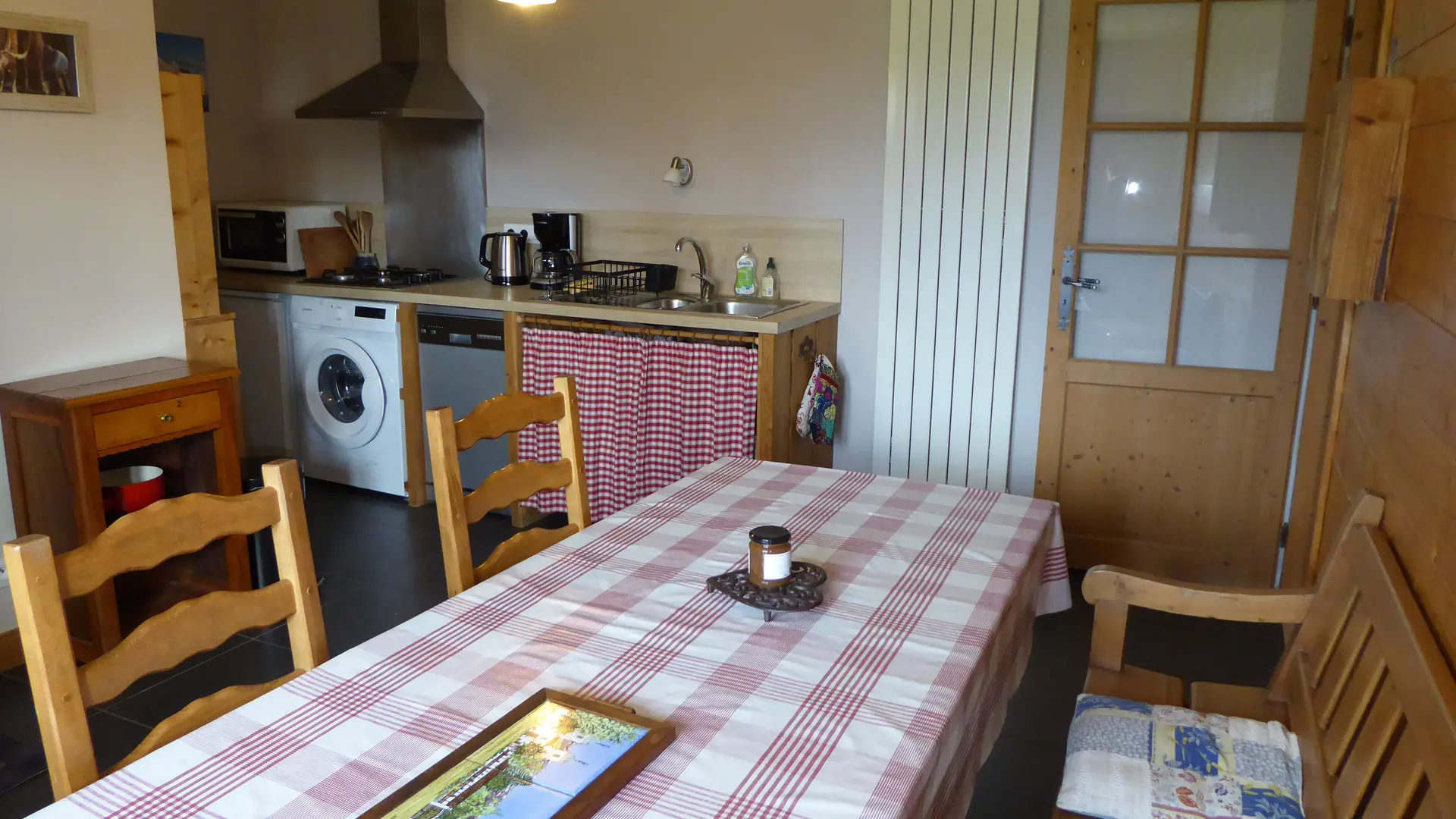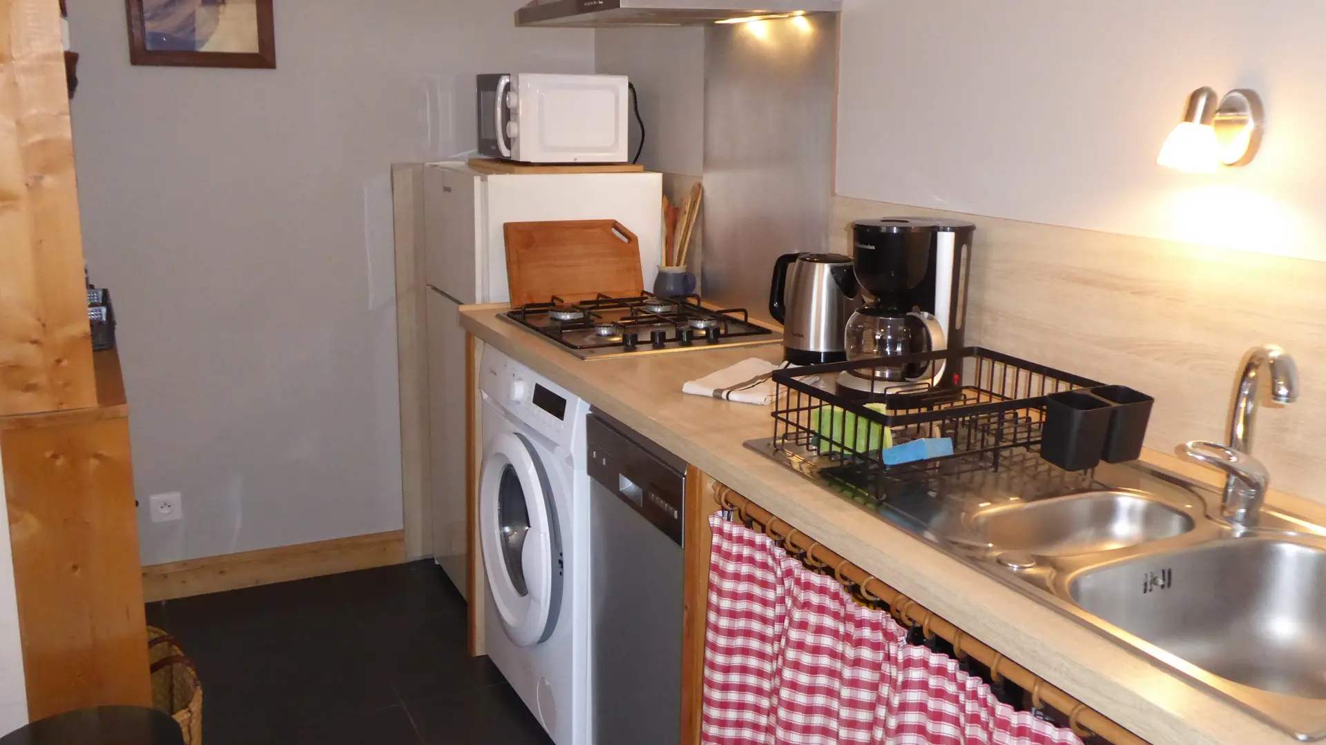 4 feux gaz, 1 mini four, lave vaisselle, réfrigérateur avec compartiment congélation, micro-ondes, lave linge, bouilloire et cafetière électriques, appareil à raclette, poëlon à fondue, mini-crêpes party, vaisselle courante.