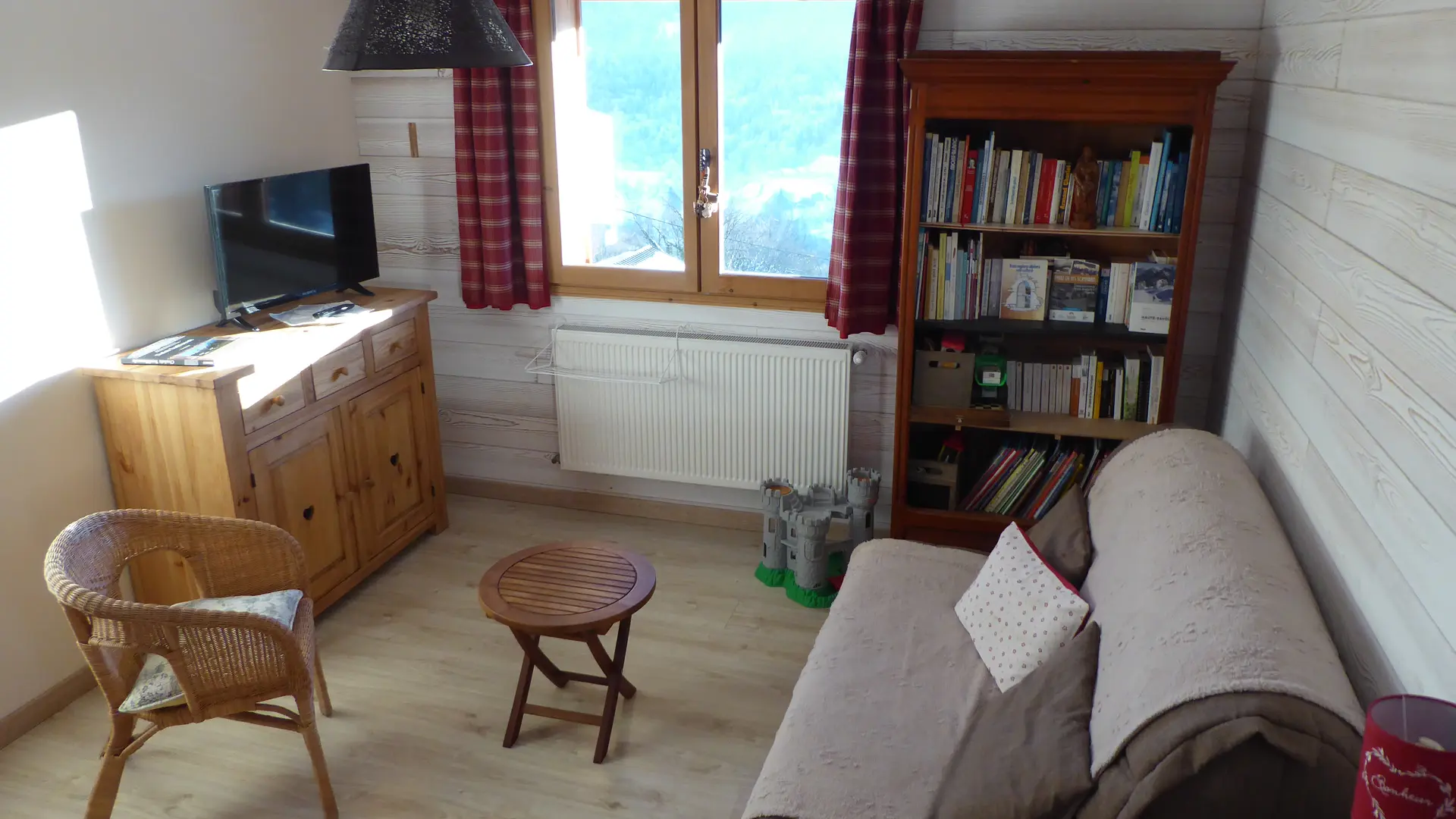 bureau, rangement, téléviseur, bibliothèque, jeux de société.