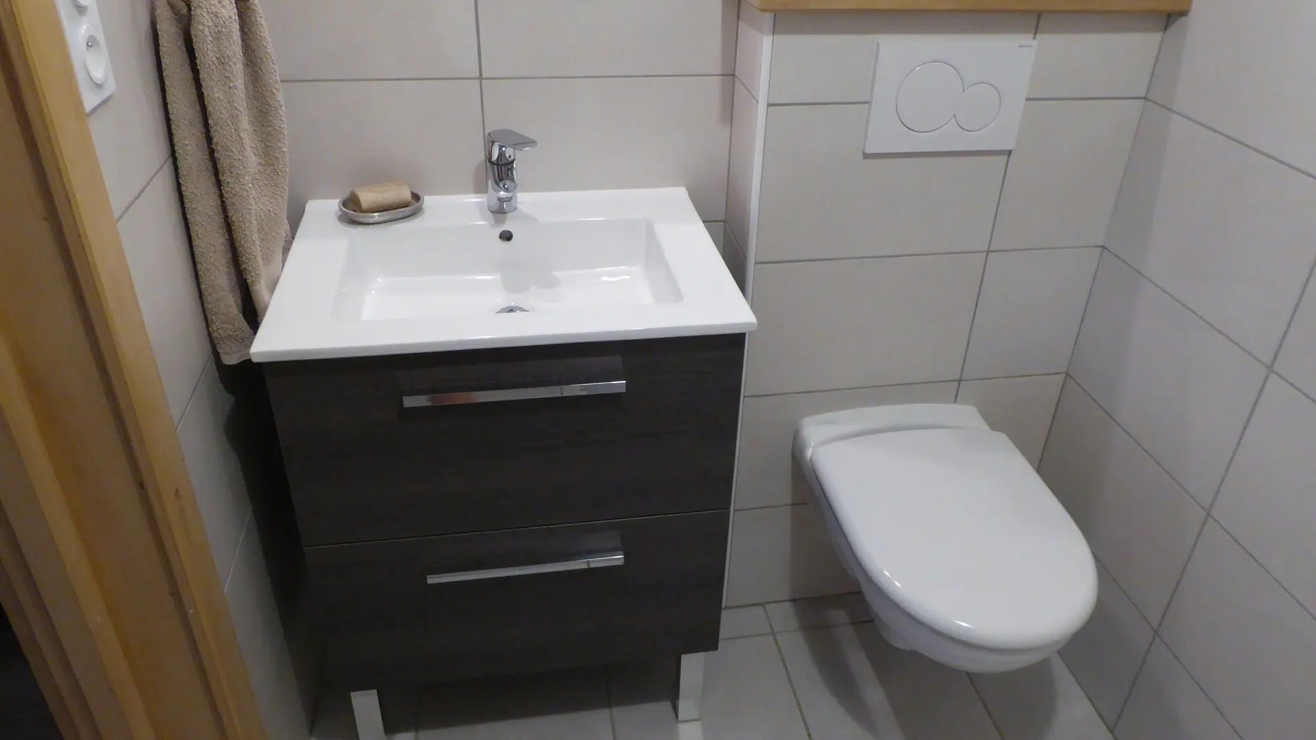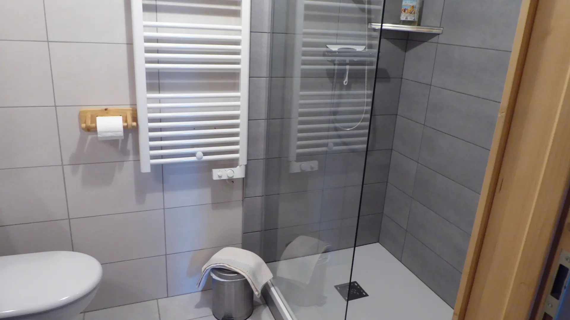 Lavabo, rangement, douche italienne, WC, sèche cheveux, sèche serviettes électrique.