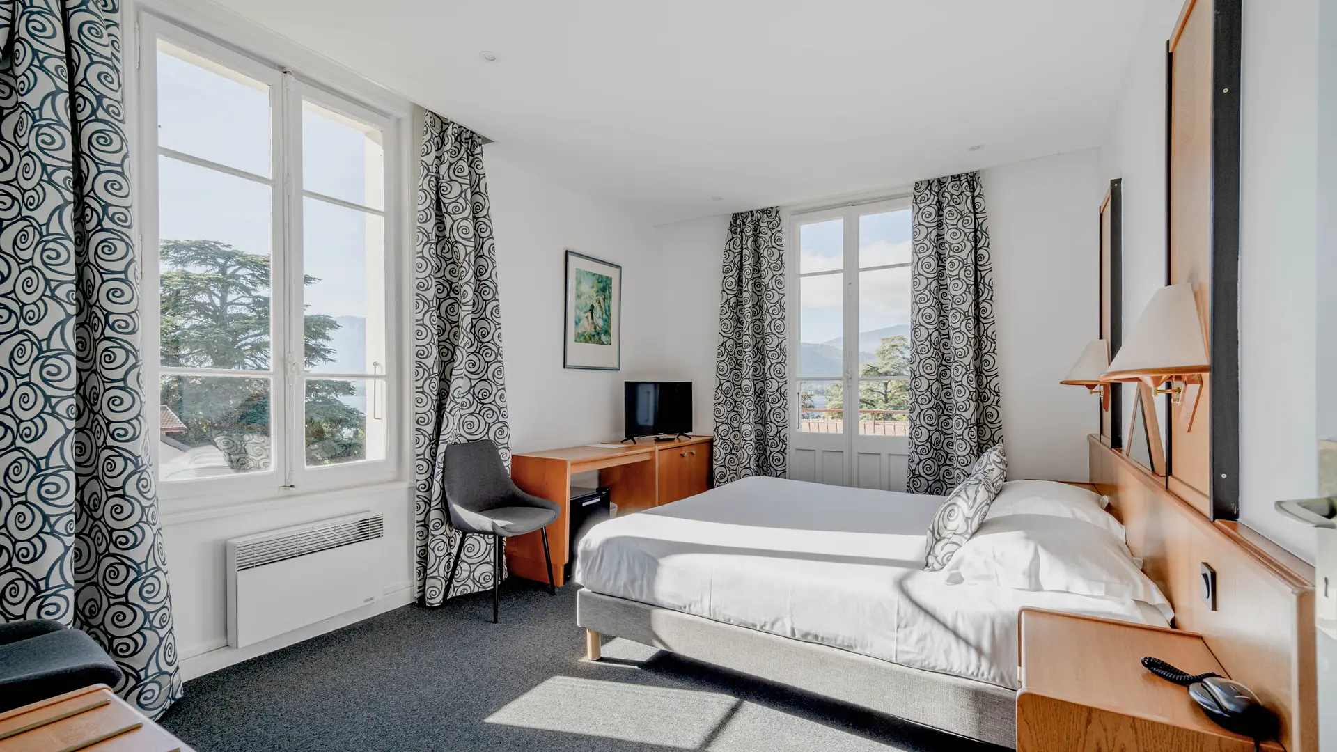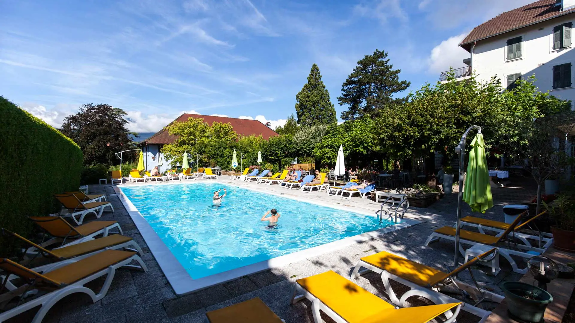 38 chambres et 4 junior suite. Le petit déjeuner buffet est servi à partir de 7h30 jusqu'à 11 heures. Il vous permettra de vitaminer votre journée. Détendez vous au bord de la piscine ou à l'ombre des catalpas, ou profitez de la plage de Talloires en contrebas dont l'accès vous est gracieusement offert par l'hôtel.
