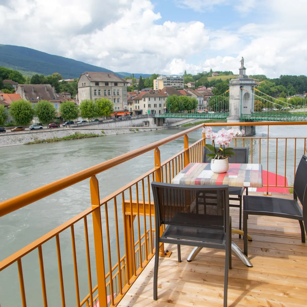 Hôtel-restaurant avec vue imprenable sur le Rhône et le vieux pont de Seyssel. Venez profiter de chambres avec balcon ou terrasse sur le Rhône.