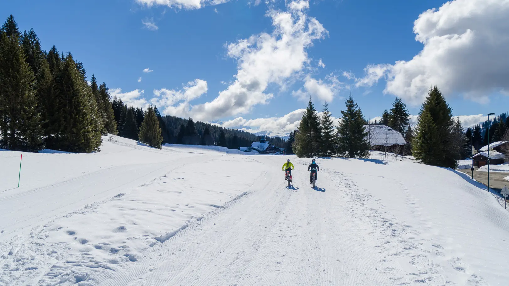 Réseau de voies piétonnes et raquettes damées et balisées ouvertes au Fat Bike ! Ces voies blanches permettent de relier entre elles les différentes pistes du centre du Praz de Lys.