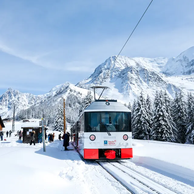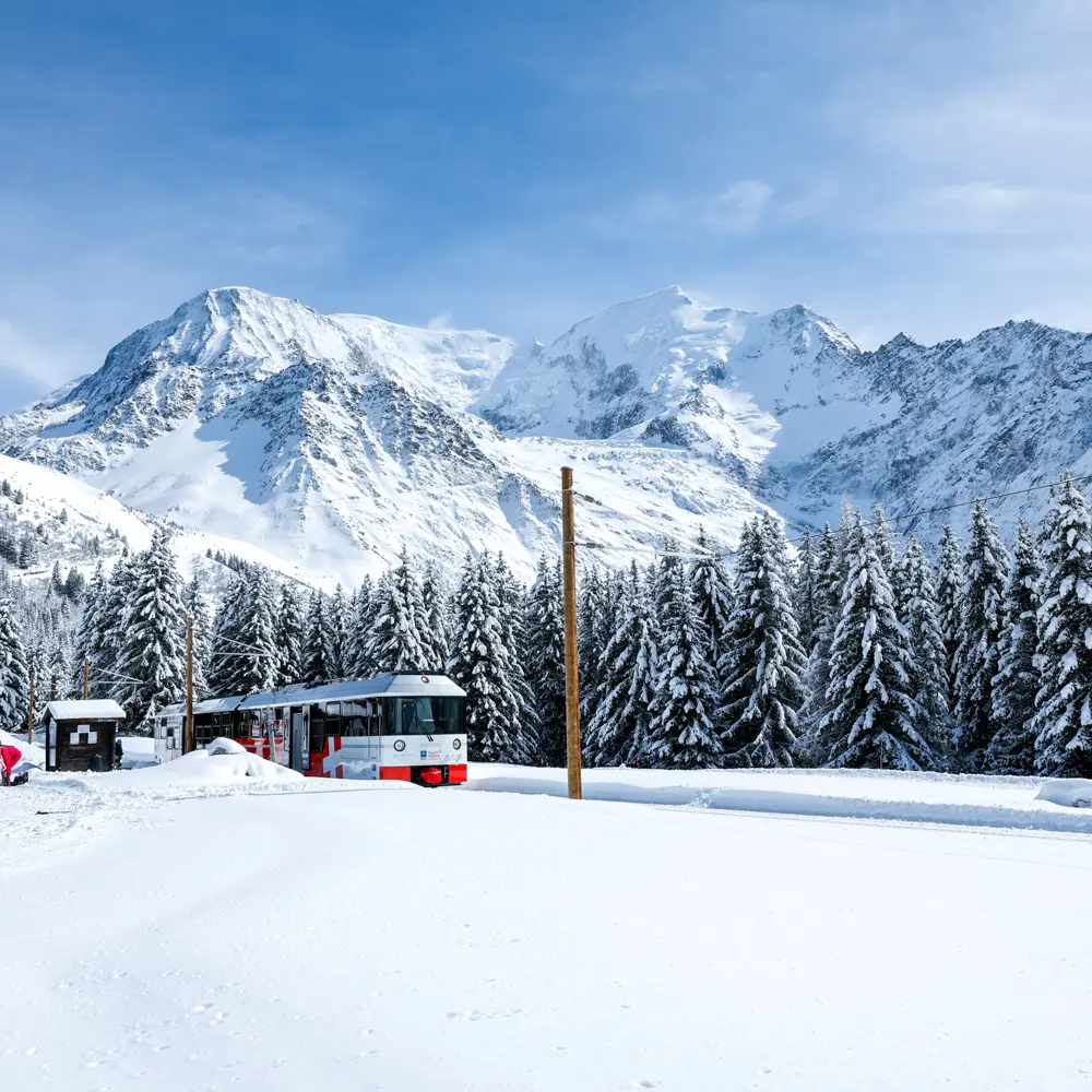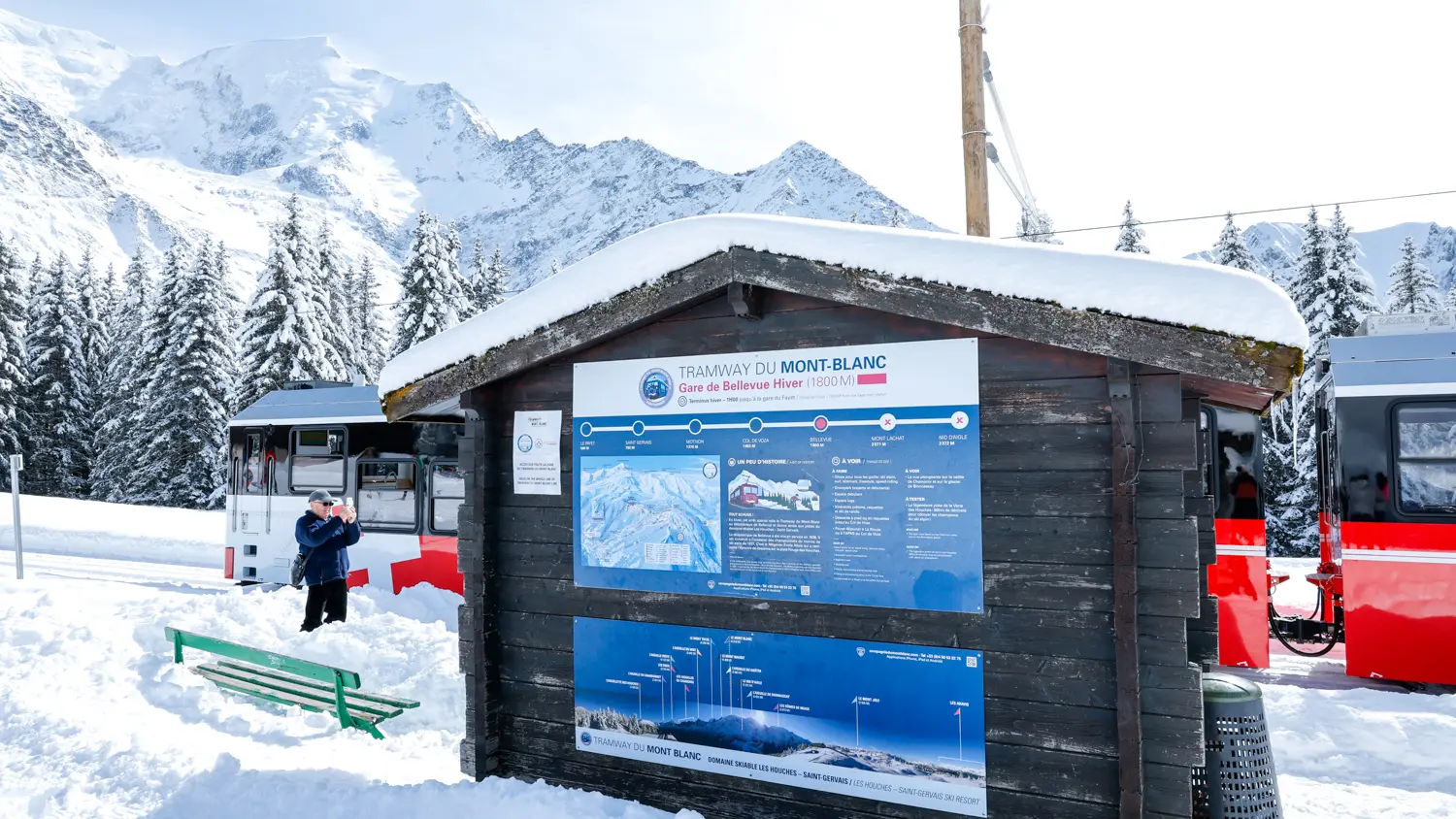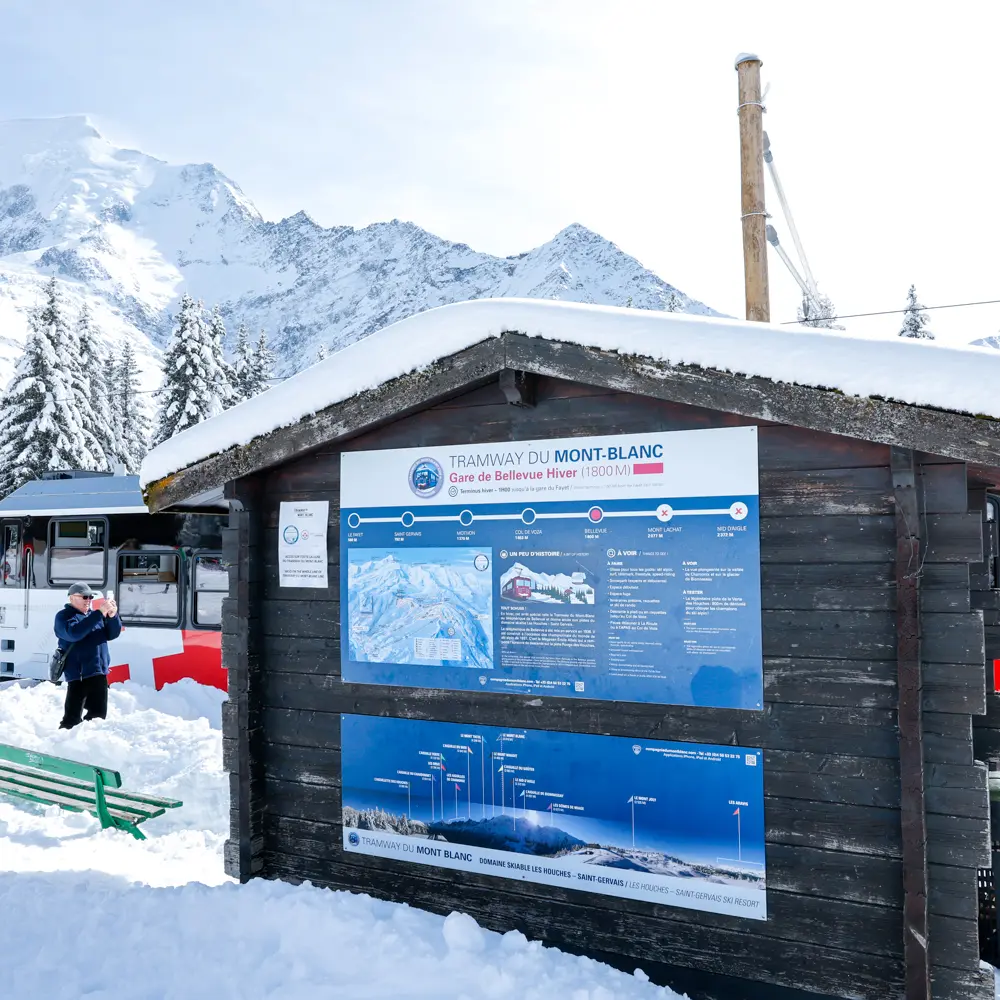 Suivre le chemin longeant la voie du train pour arriver à la table d'orientation de l'ancien hôtel Bellevue : vue sur la vallée de Chamonix, puis continuer jusqu'à Bellevue et l'arrivée du téléphérique venant des Houches.
