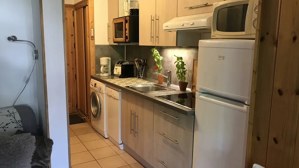 Cuisine neuve avec réfrigérateur + petit congélateur, plaques vitrocéramiques, four, four micro-ondes, lave linge et lave-vaisselle.