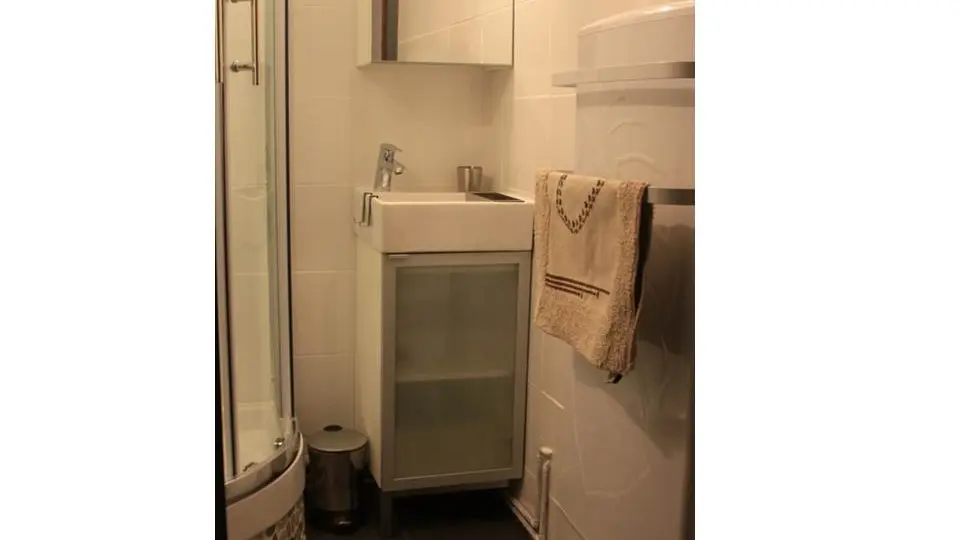 Salle de bains avec douche, 2 lavabos et radiateur sèche-serviettes. Toilettes séparées.