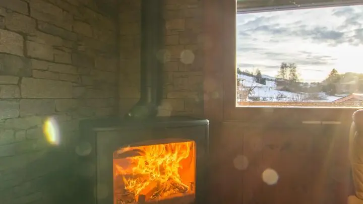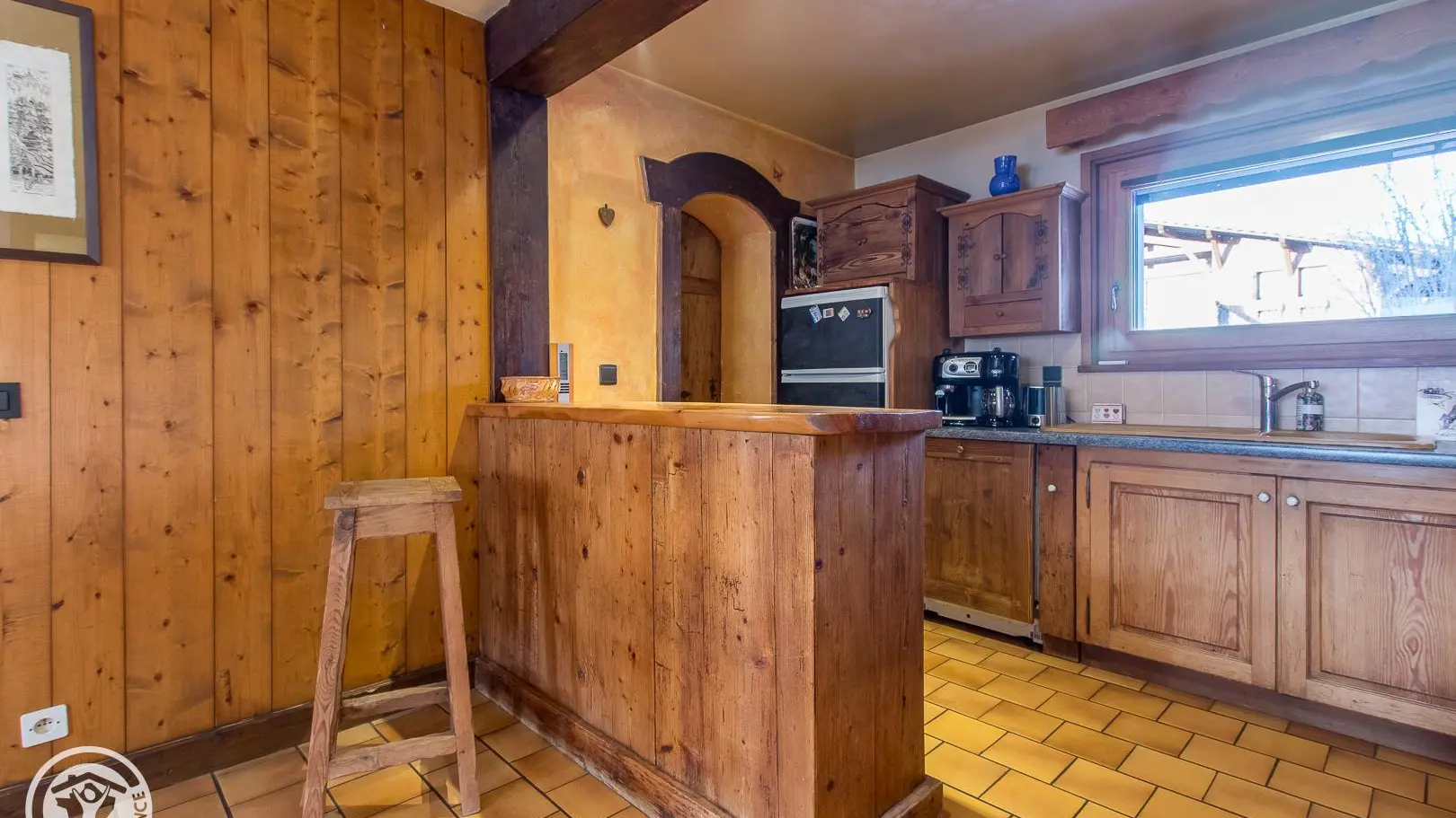 Cuisine intégrée ouverte sur le salon (canapé, Tv, poêle à bois) et l'espace repas (table et chaise).