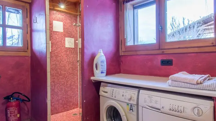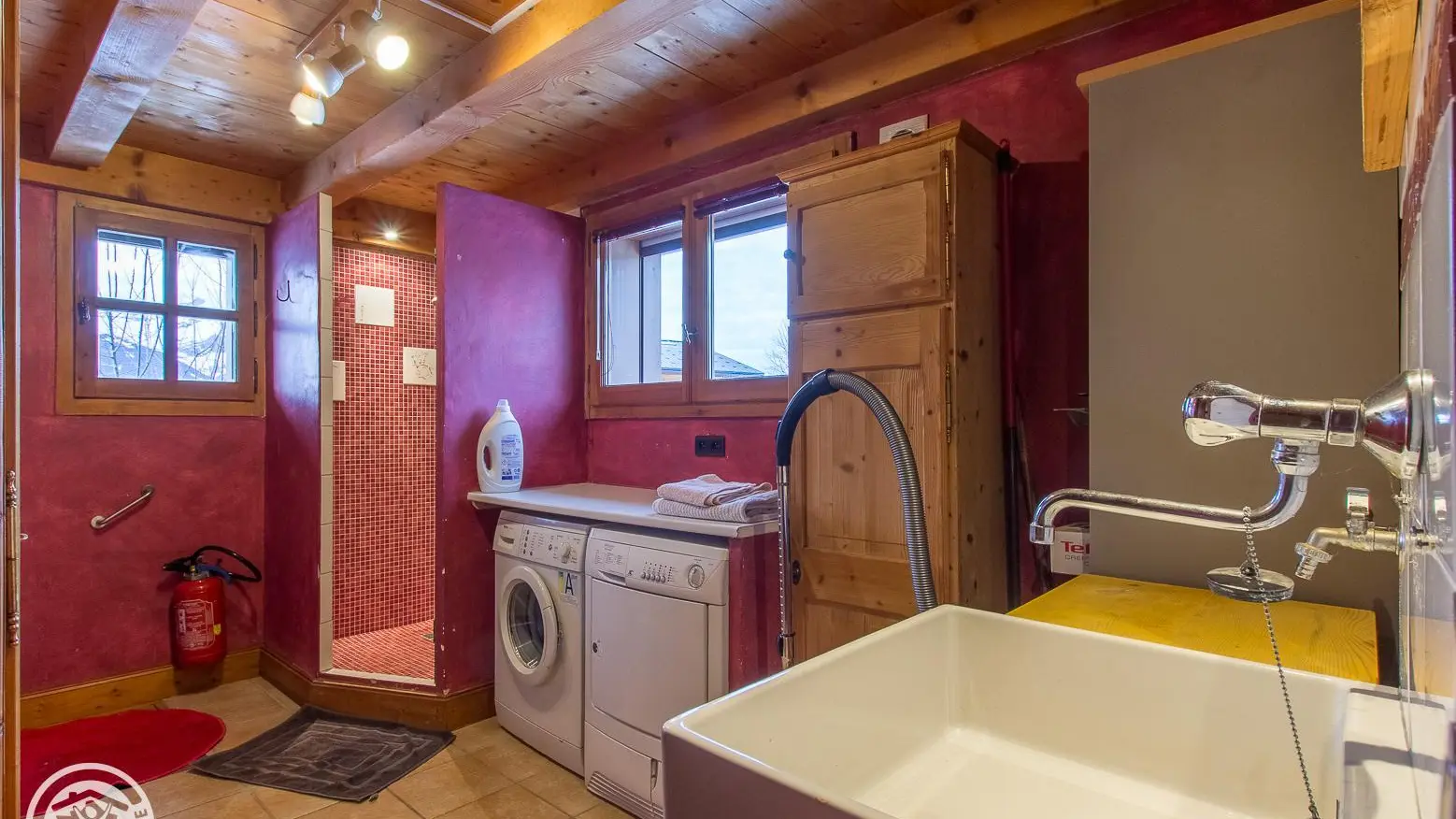 Buanderie équipée accessible depuis la cuisine (rangement, douche d'appoint, lave-linge et sèche-linge).