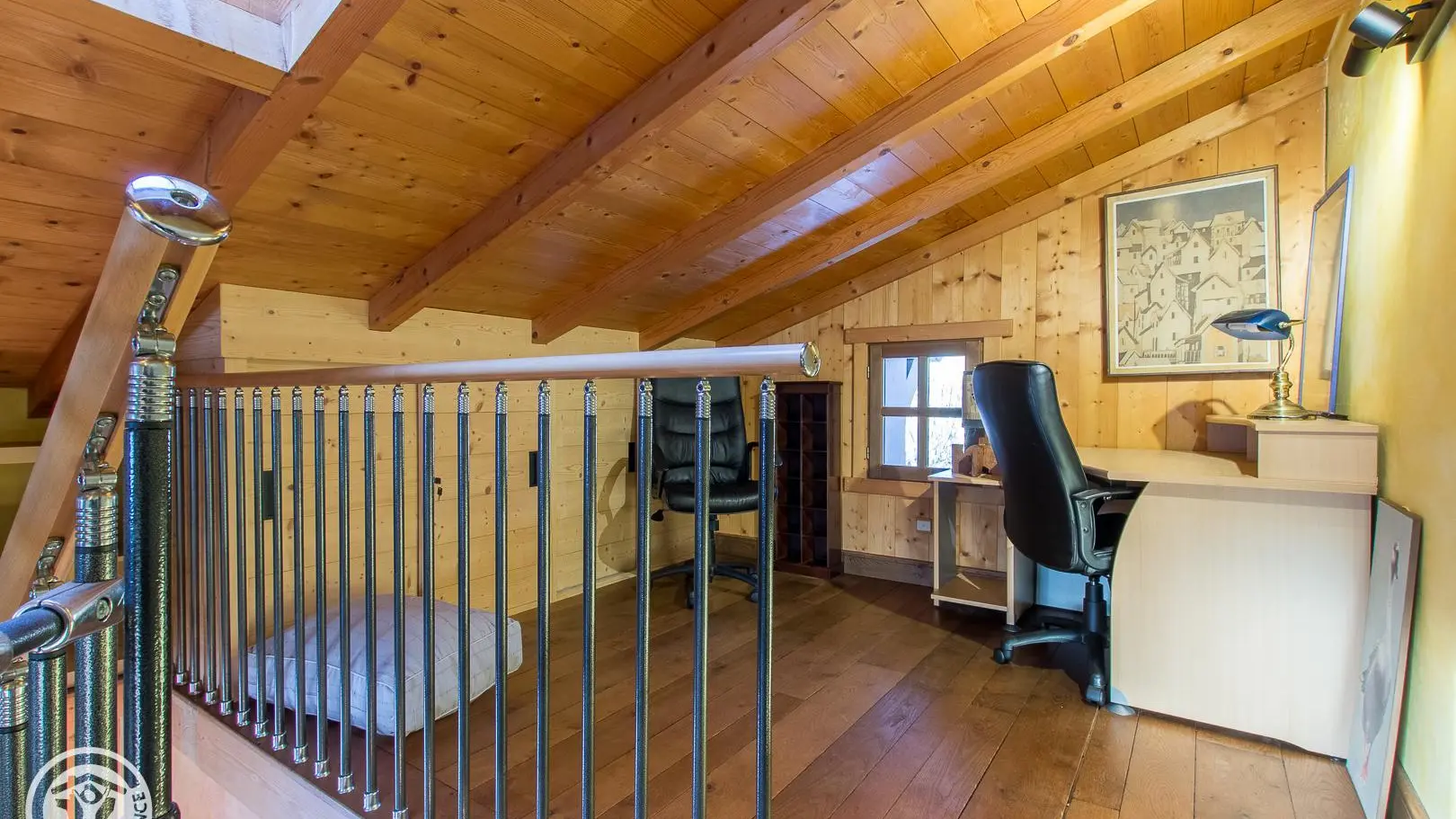 L'espace repas donne accès à une mezzanine avec un bureau et espace jeux enfants.