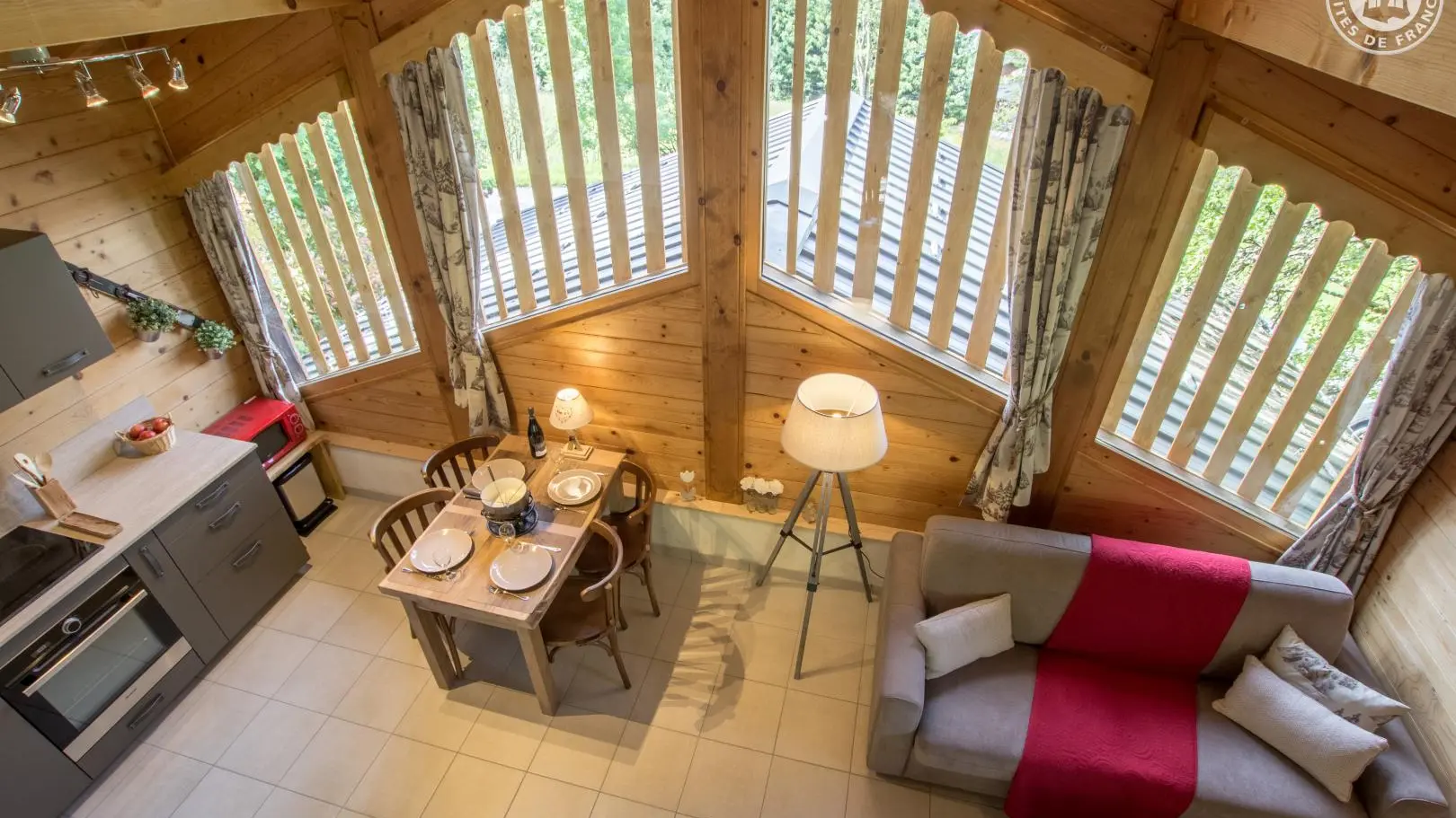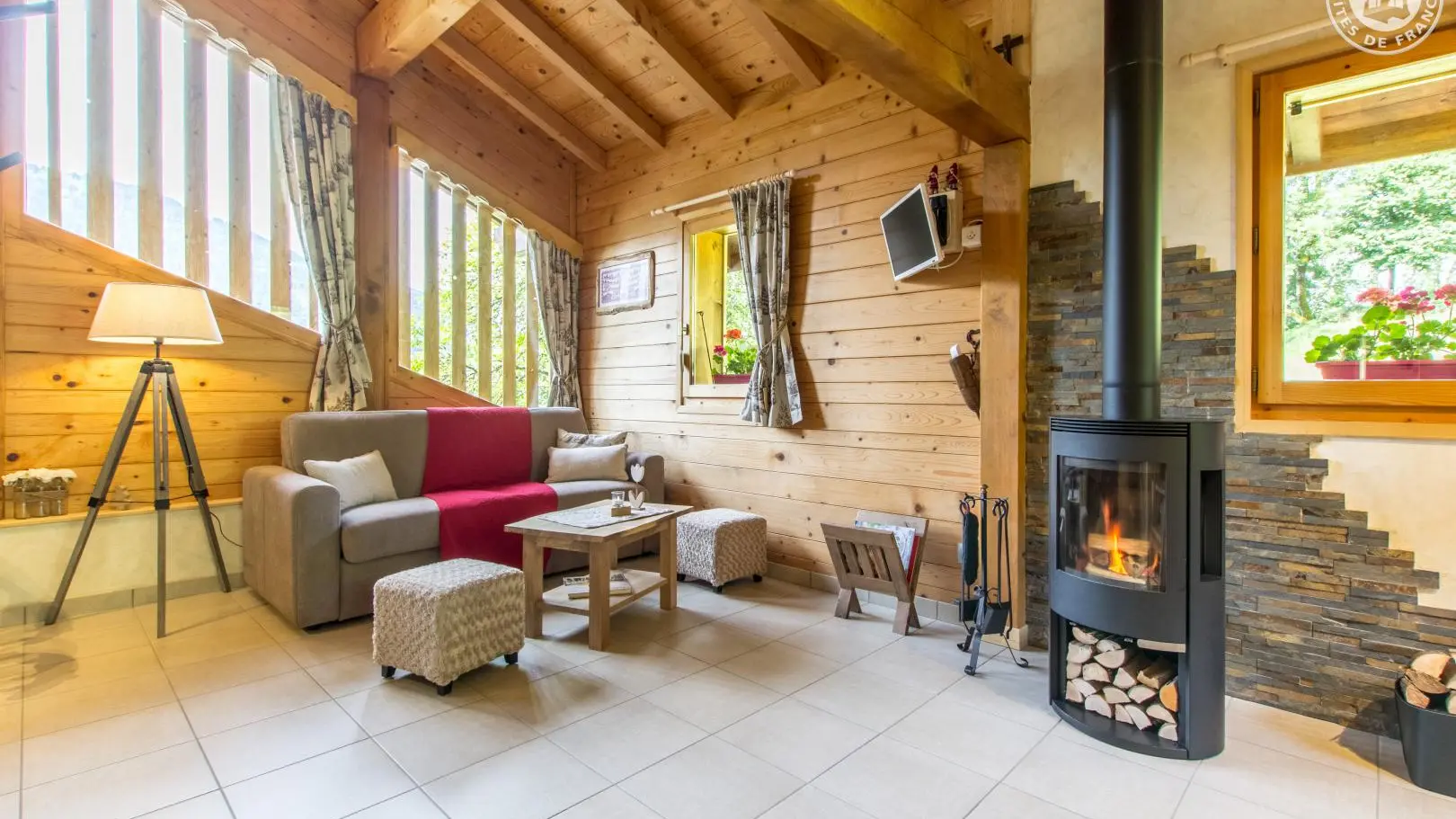 Pièce à vivre avec coin salon avec poêle à bois et TV, canapé. Cuisine intégrée ouverte sur le coin repas.