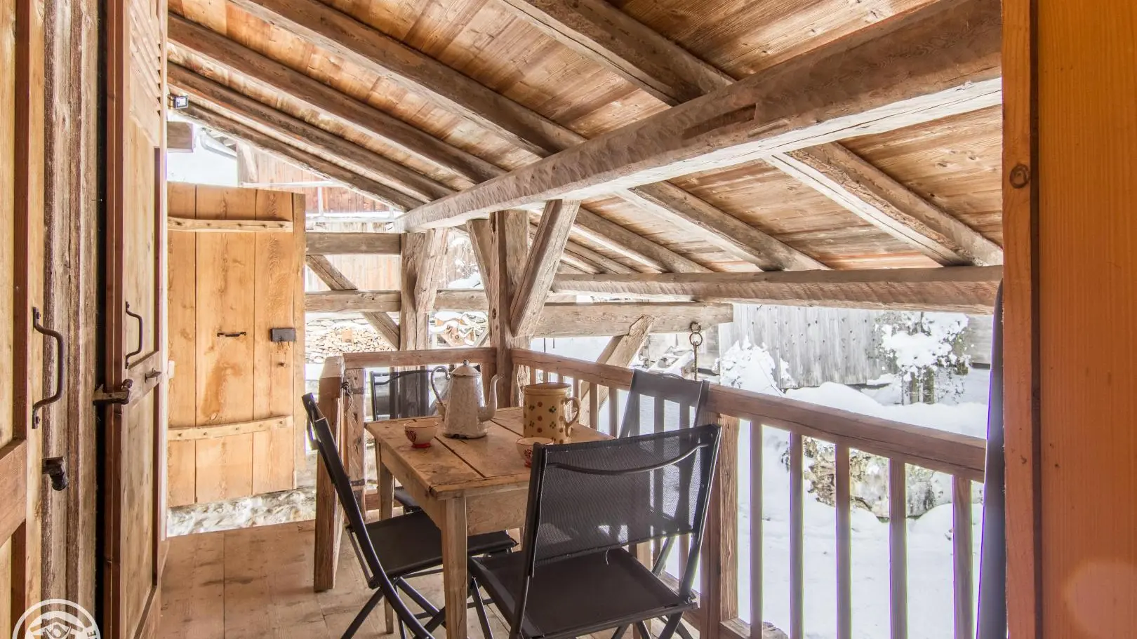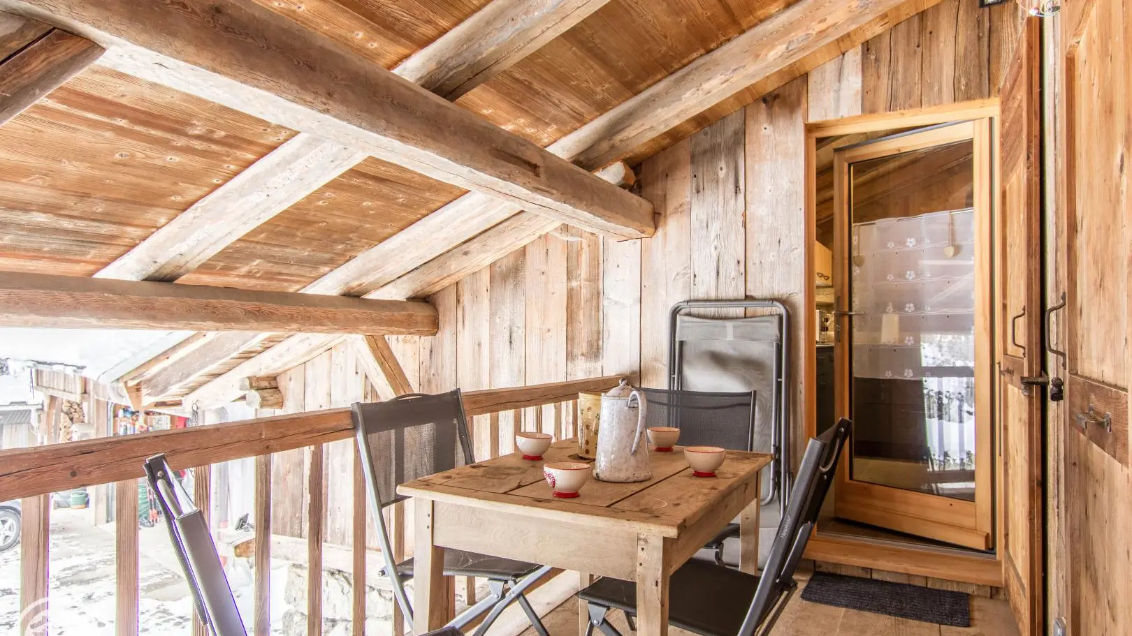 Balcon, petite terrasse couverte à l'entrée du gîte avec table et chaises.