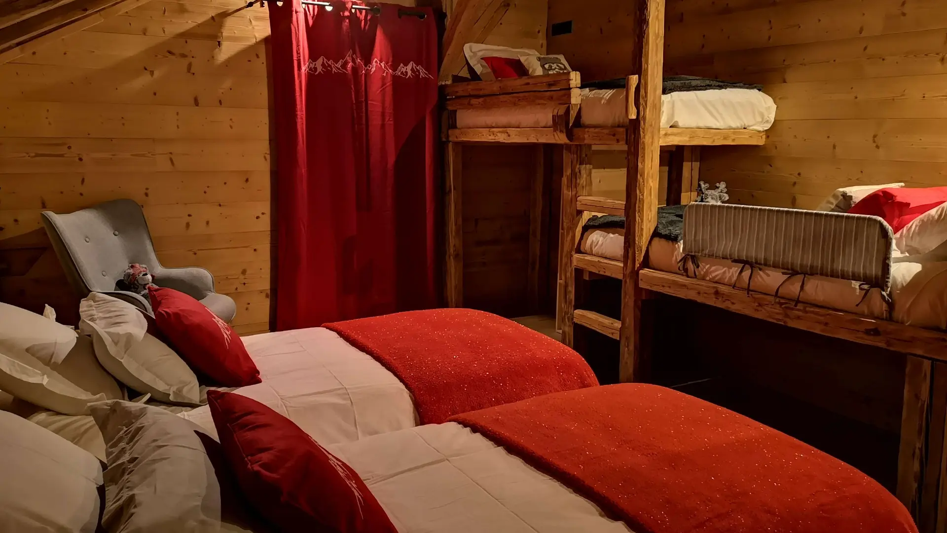 1 chambre de 4 personnes et 2 chambres de 2 personnes.