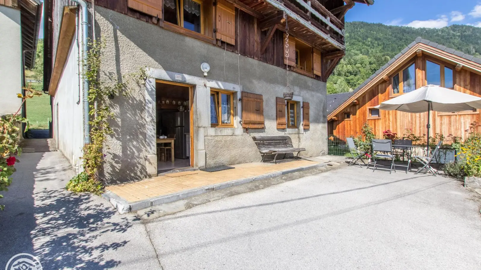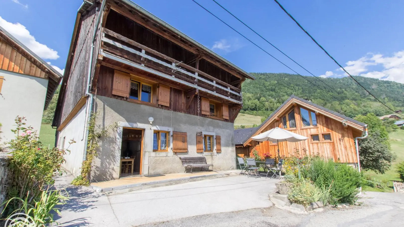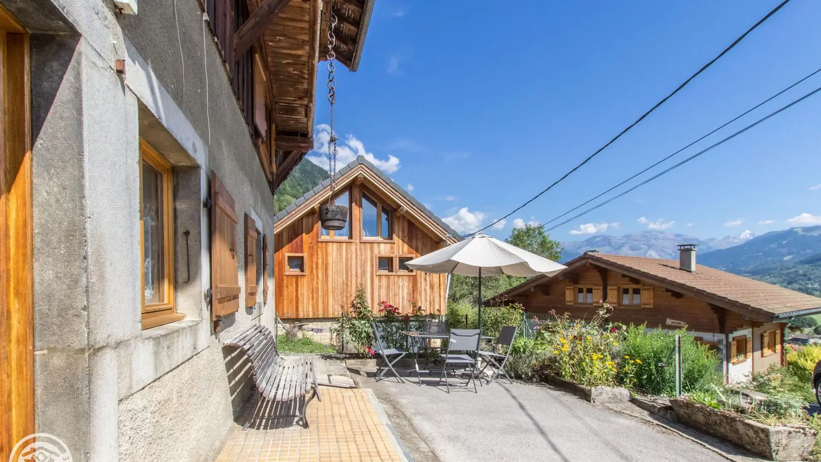 Espace terrasse privatif devant le gîte avec banc, table et chaises, parasol. Centre village de Taninges, commerces et Office de Tourisme à 1,5km.
