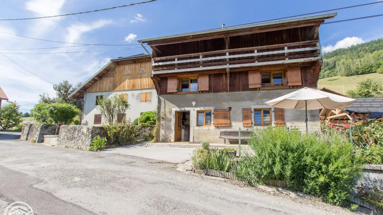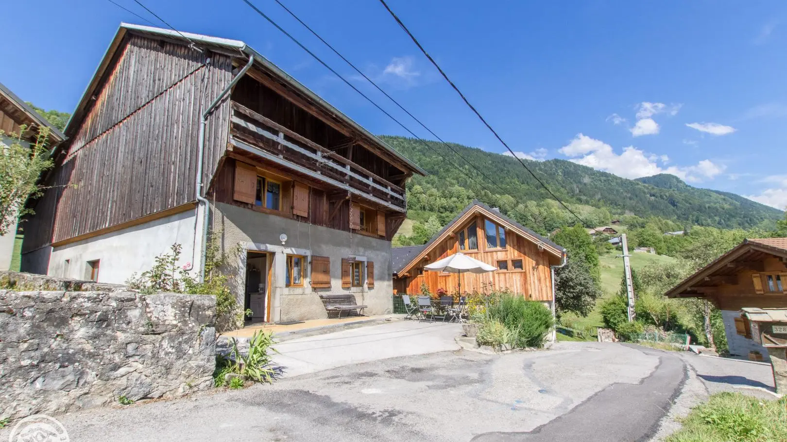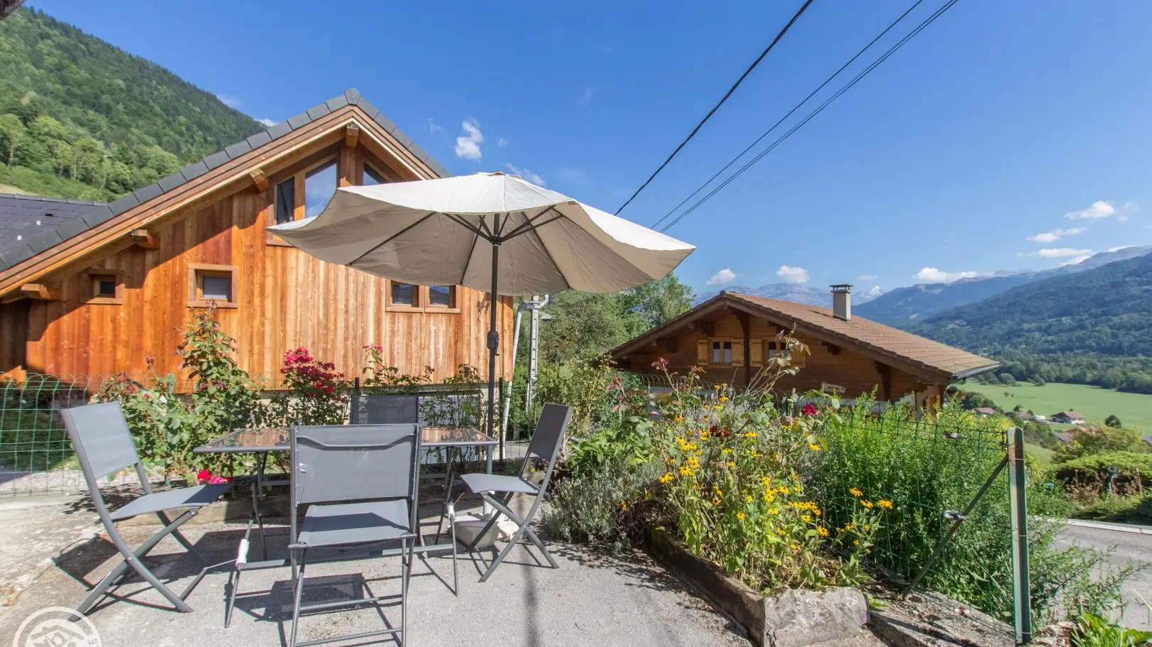 Espace terrasse privatif devant le gîte avec banc, table et chaises, parasol. Centre village de Taninges, commerces et Office de Tourisme à 1,5km.