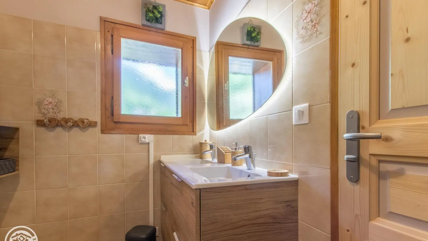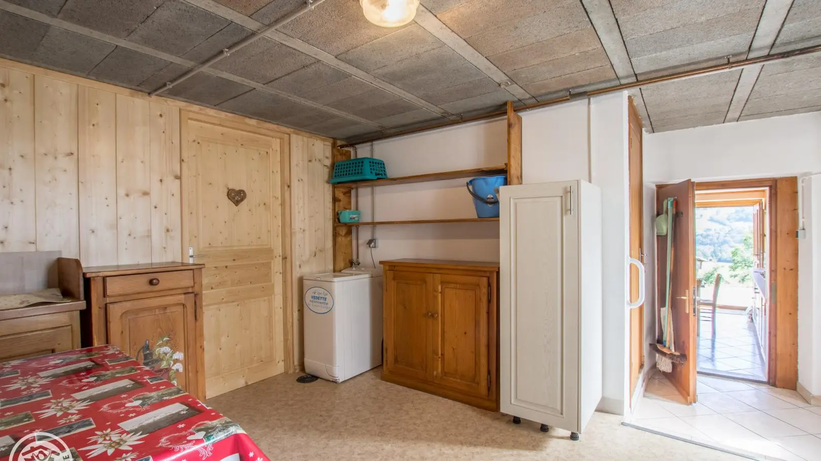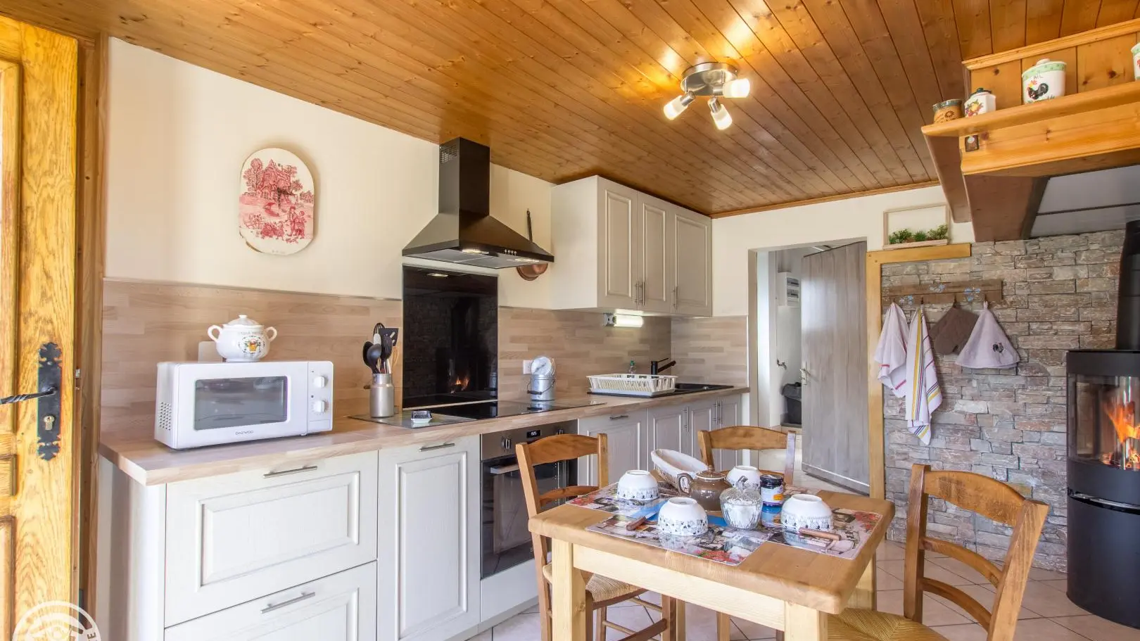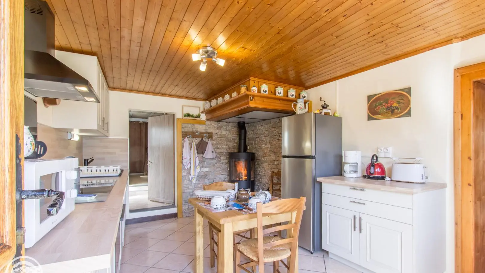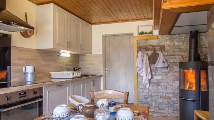 Au rez-de-chaussée: cuisine intégrée indépendante (poêle à bois- bois fourni), salon (Tv, canapé convertible, coin repas), buanderie/salle de stockage.