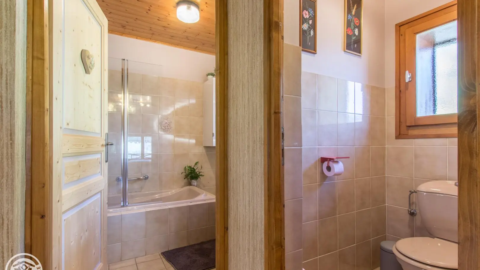 A l'étage : salle de bains (baignoire), WC indépendant, chambre 1 (1 lit 160x200cm), communicante avec la chambre 2 (2 lits 90x190cm).