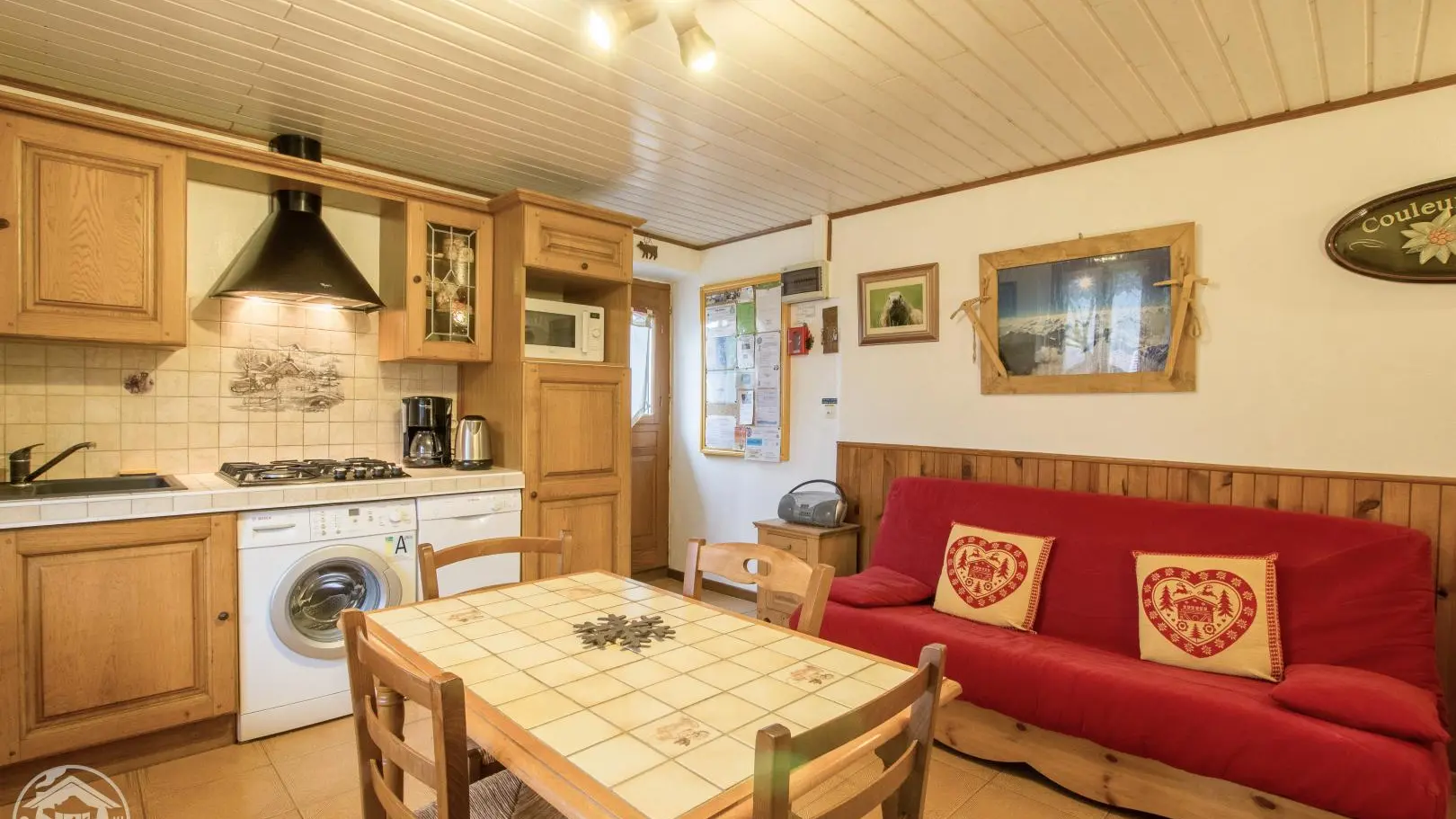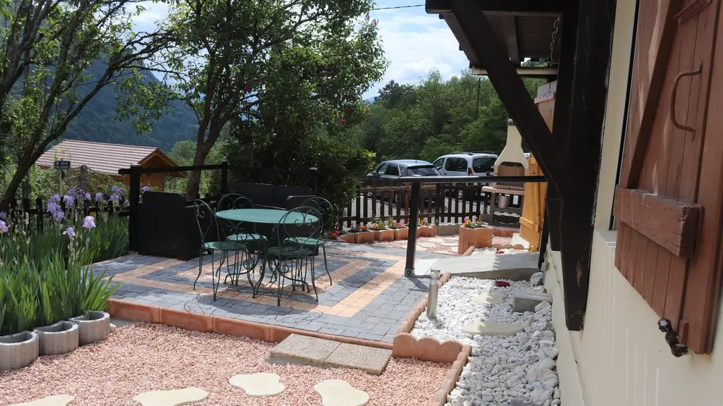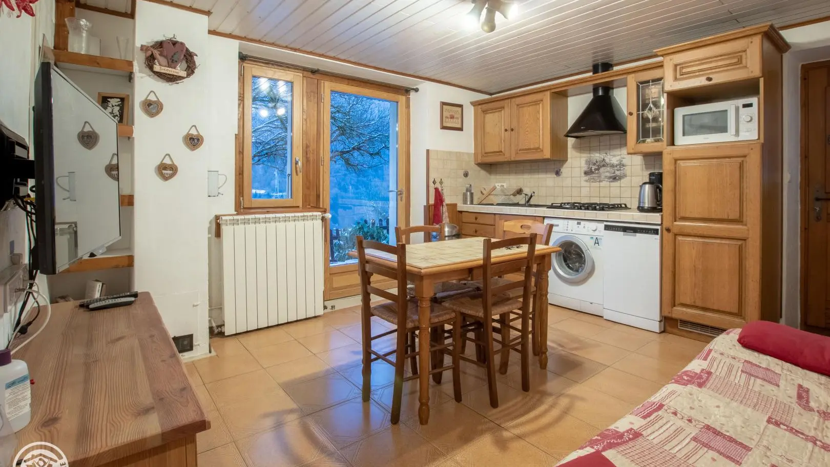 Cuisine intégrée ouverte sur séjour (canapé convertible clic-clac, Tv, dvd, Hifi), chambre (1 lit 140x190cm) donnant accès à la salle d'eau (douche), wc indépendant. Terrasse, jardin clos, salon de jardin, barbecue. Possibilité de louer les draps. Séjour 3 semaines -10%. Gîte non fumeur. Sur place, animaux de basse-cour. Domaine skiable des Brasses 9 km, et Sommand-Praz de Lys 16km. Ville de Genève 30km. Centre de Foire de La Roche-sur-Foron 20km.