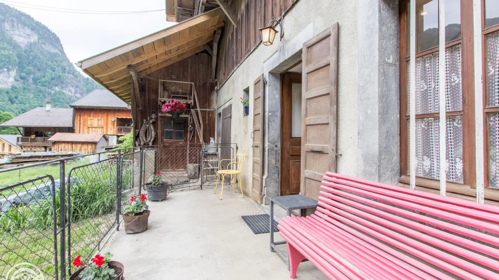 Balcon/terrasse avec table, chaises, parasol et banc. Local à skis. Chauffage au sol.