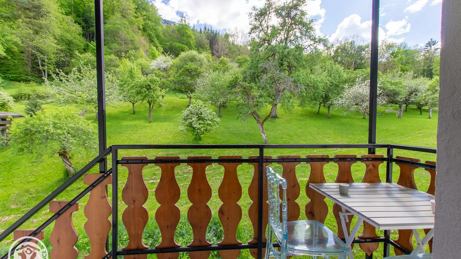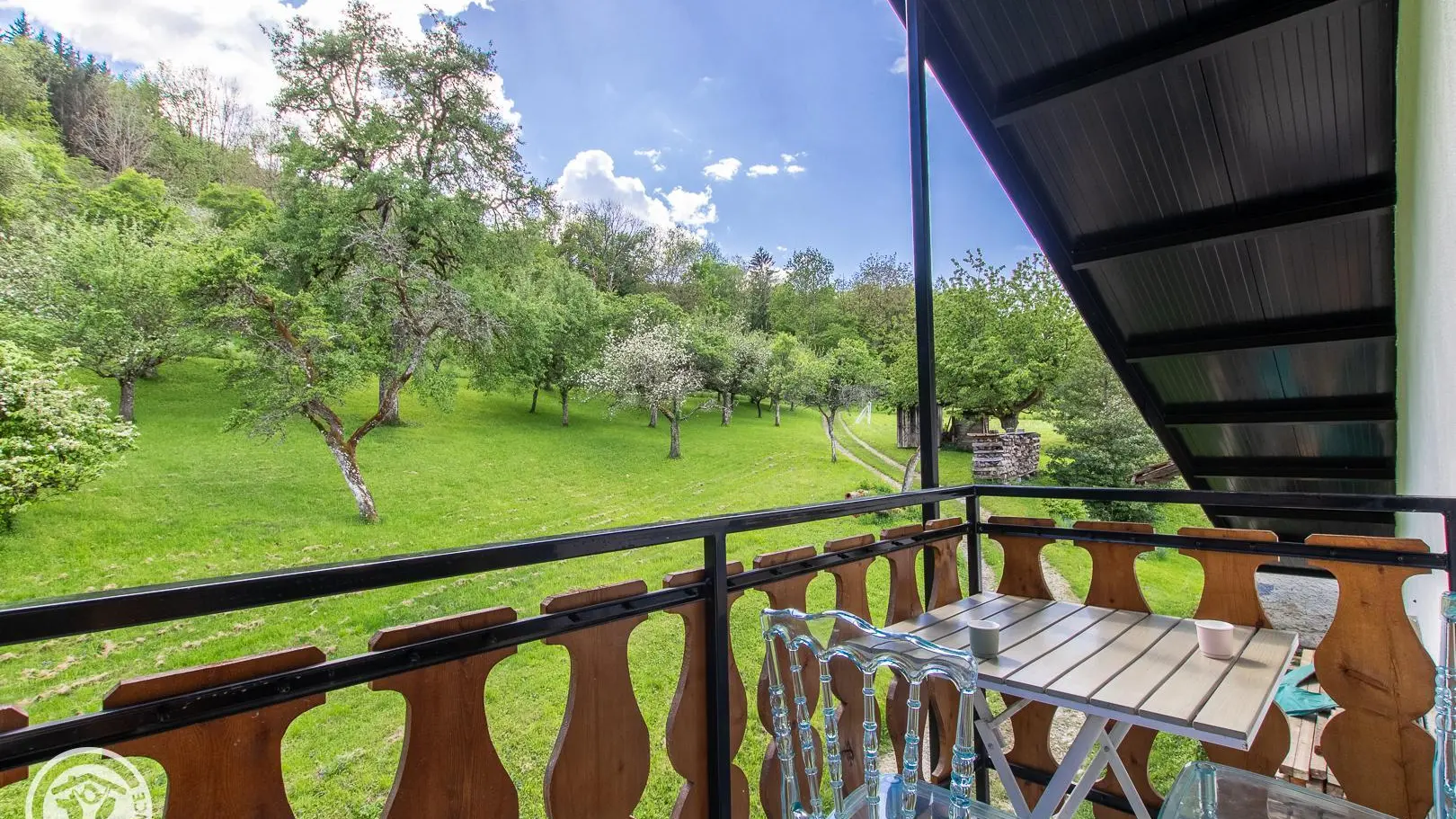 Petit espace balcon devant l'entrée du gîte avec une table et 2 chaises.