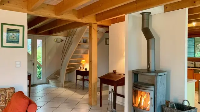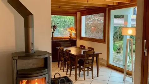 Le logement Au rez-de-chaussée une grande entrée dessert une cuisine ouverte sur une salle à manger, la chambre parentale avec un lit double en 160X200, et le salon cosy au coin de feu.