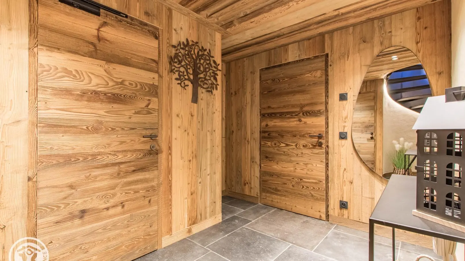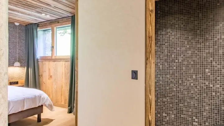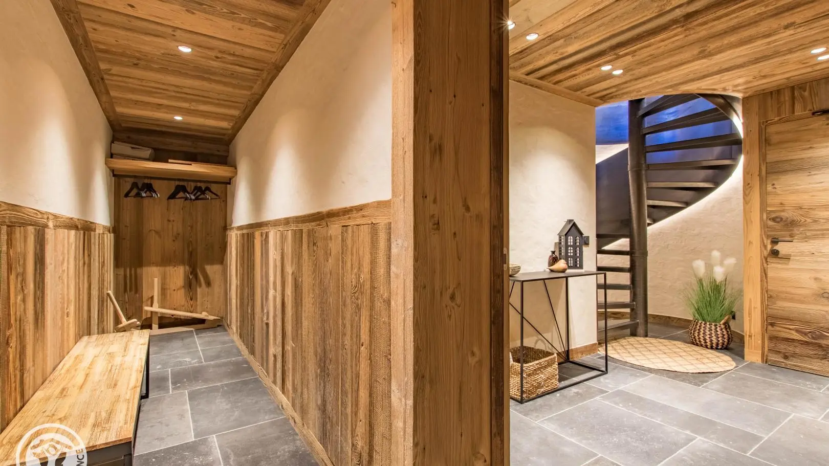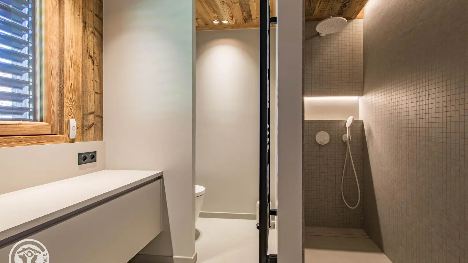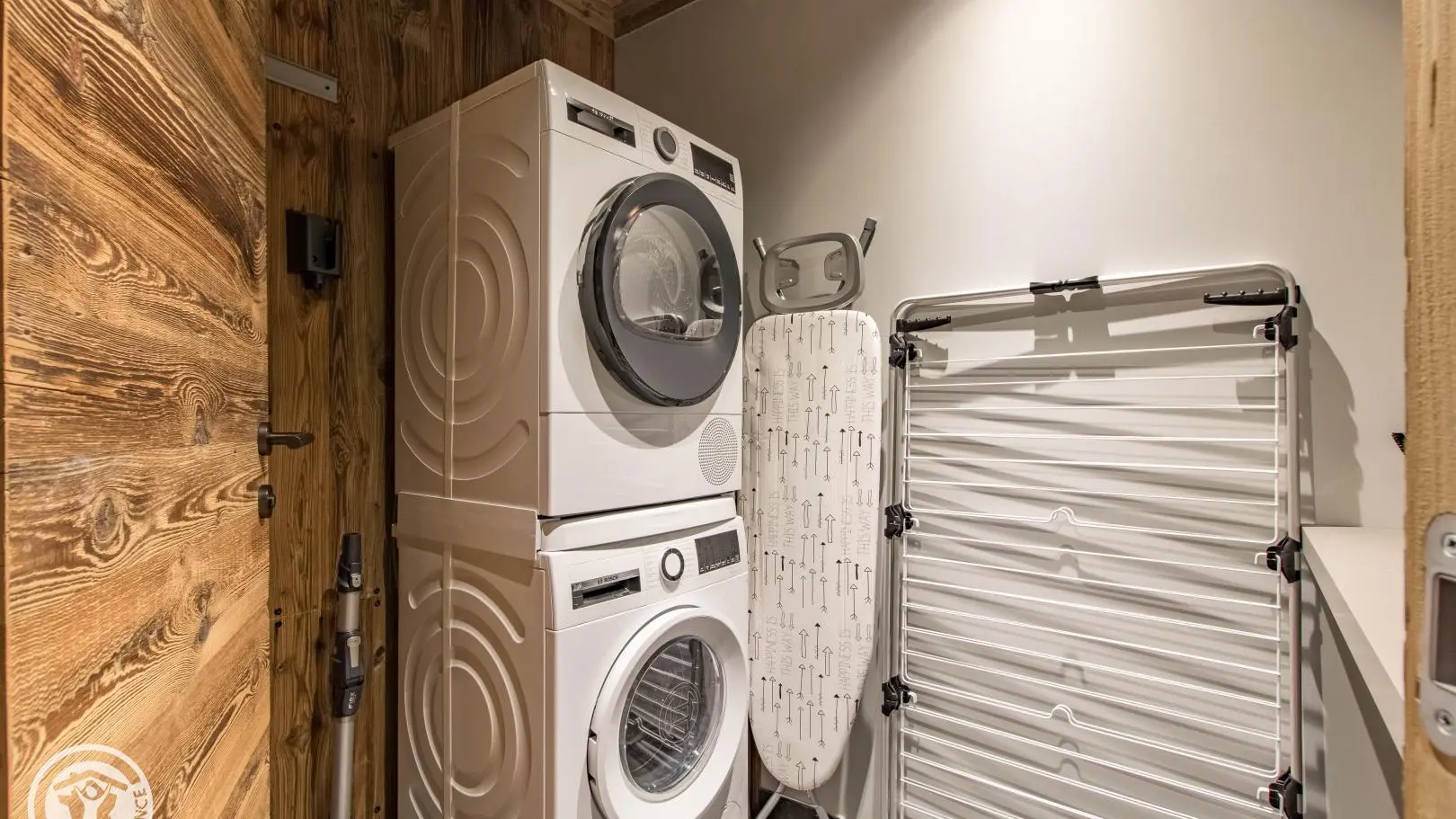 Rez-de-chaussée : hall d'entrée / skiroom, chambre 1 avec 1 lit 160x200cm, salle d'eau (douche à l'italienne), buanderie avec lave-linge et sèche-linge. 1 wc indépendant.