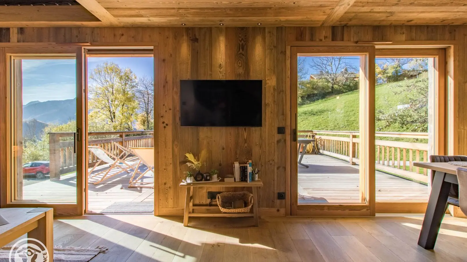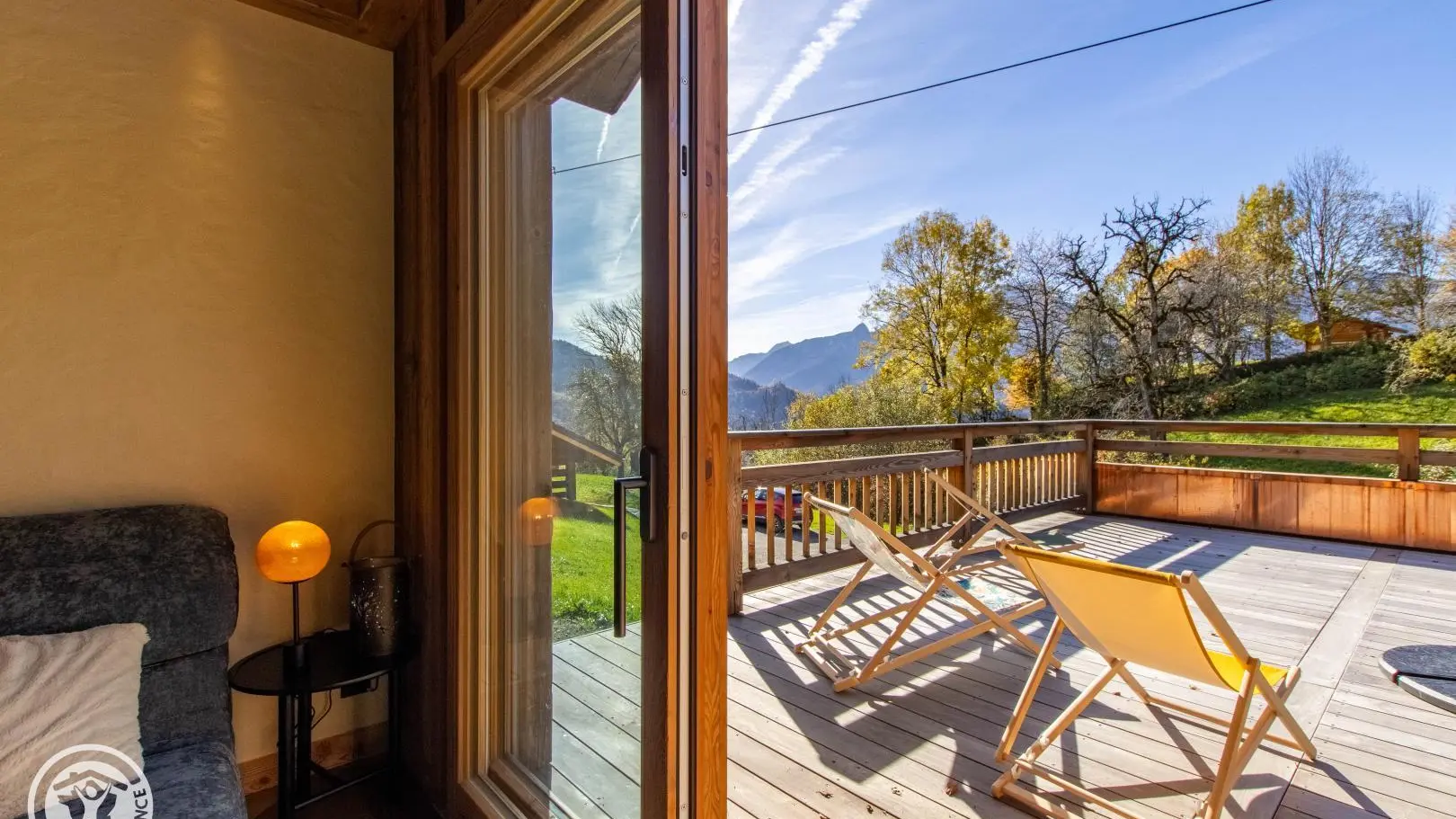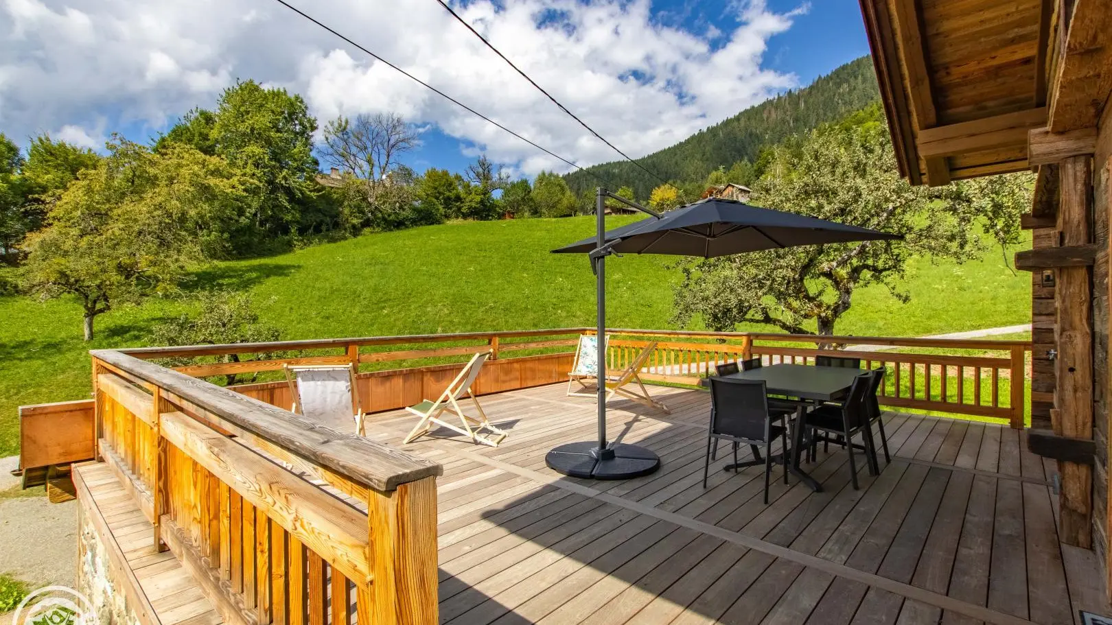 Terrasse bois Ouest avec mobilier de jardin, transats, barbecue. Terrain/jardin autour du chalet. Magnifique vue sur les montagnes.