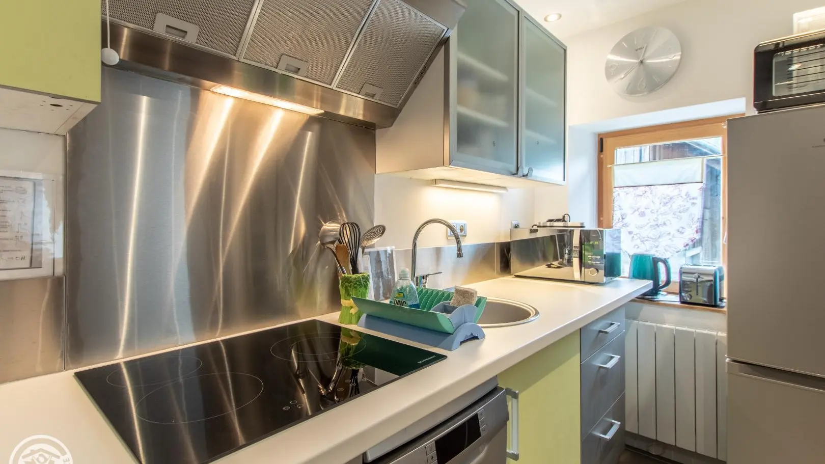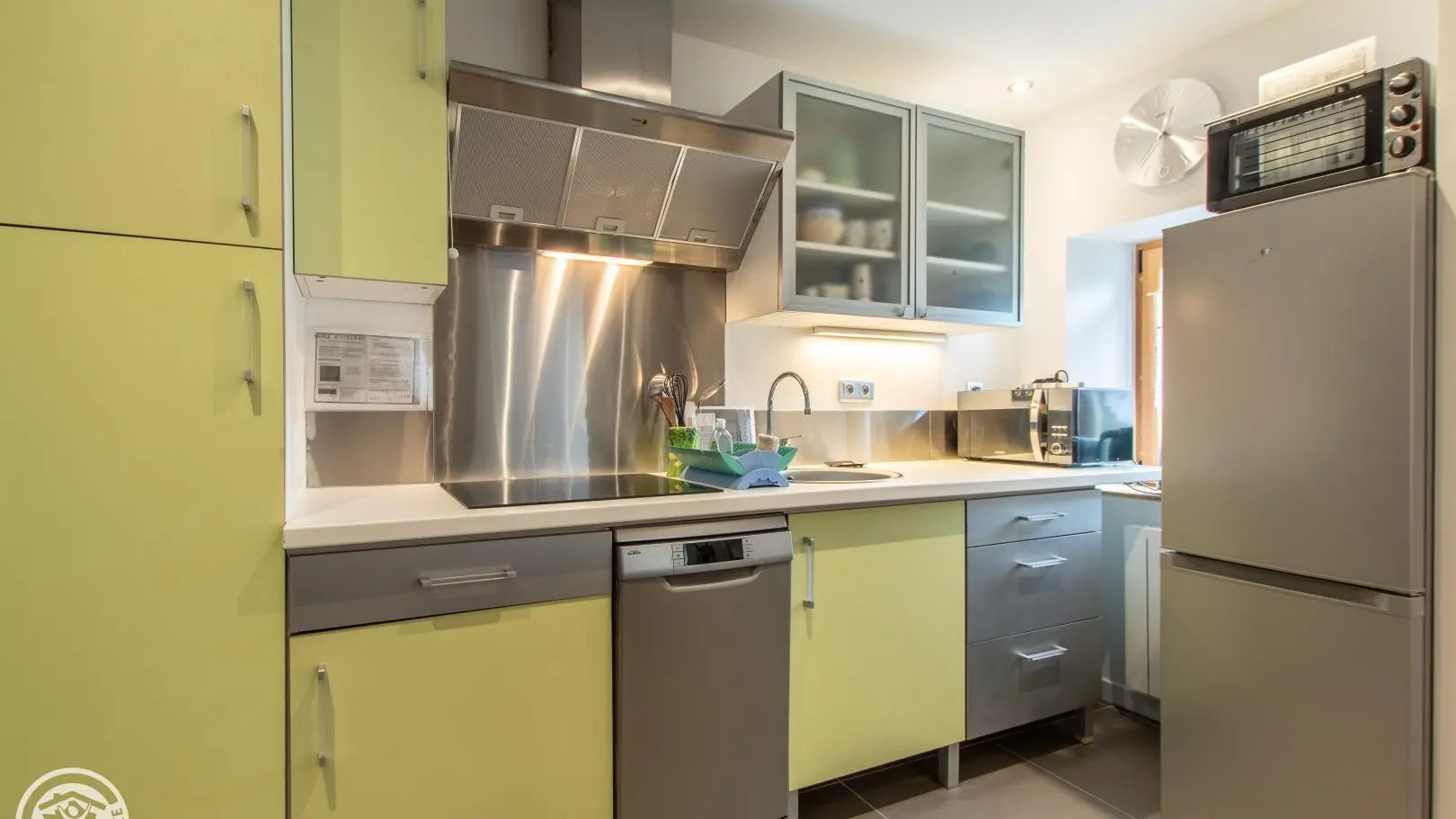 Plaque vitrocéramique, four, réfrigérateur, congélateur, hotte aspirante, lave vaisselle.