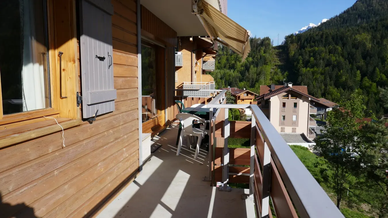 Balcon équipé d’un store ban longeant séjour et chambre. Salon de jardin.