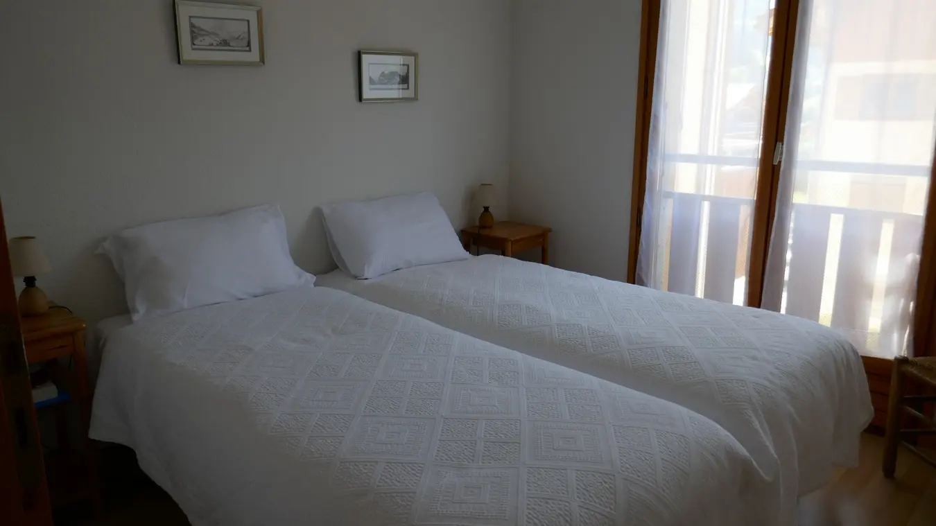 - 1 chambre avec 2 lits en 80, avec rangement et penderie.