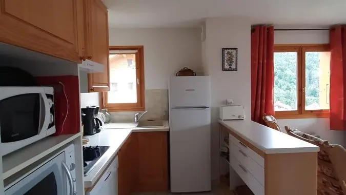 - Coin cuisine ouvert sur séjour, équipé de : lave-vaisselle, réfrigérateur congélateur, plaque de cuisson vitrocéramique 4 feux, hotte, four, micro-ondes (cafetière, bouilloire, grille-pain, autocuiseur, mixer, appareil à fondue et raclette).