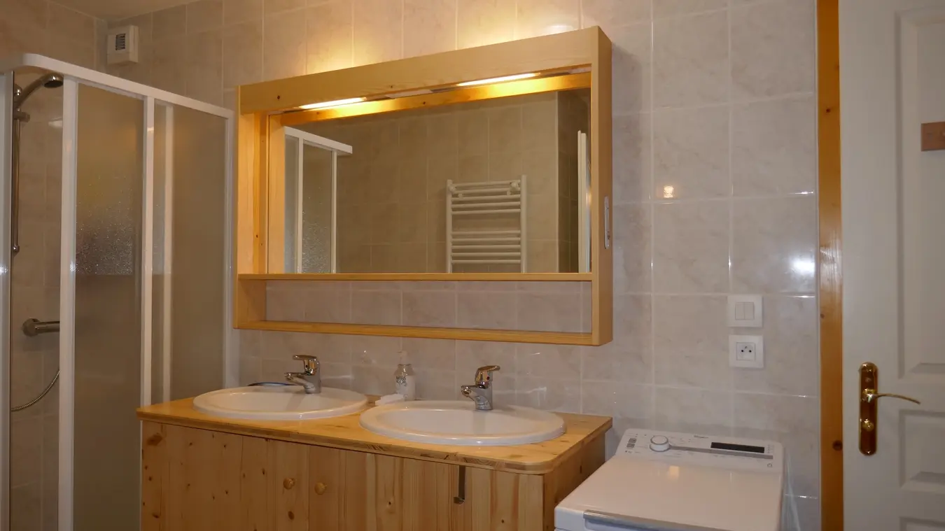 - Salle de bain avec douche, double vasque, sèche serviettes, WC, lave-linge, avec rangement (sèche cheveux, fer à repasser, planche à repasser, aspirateur)