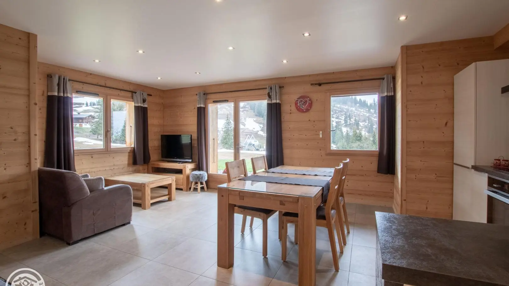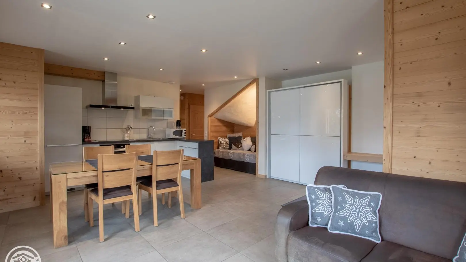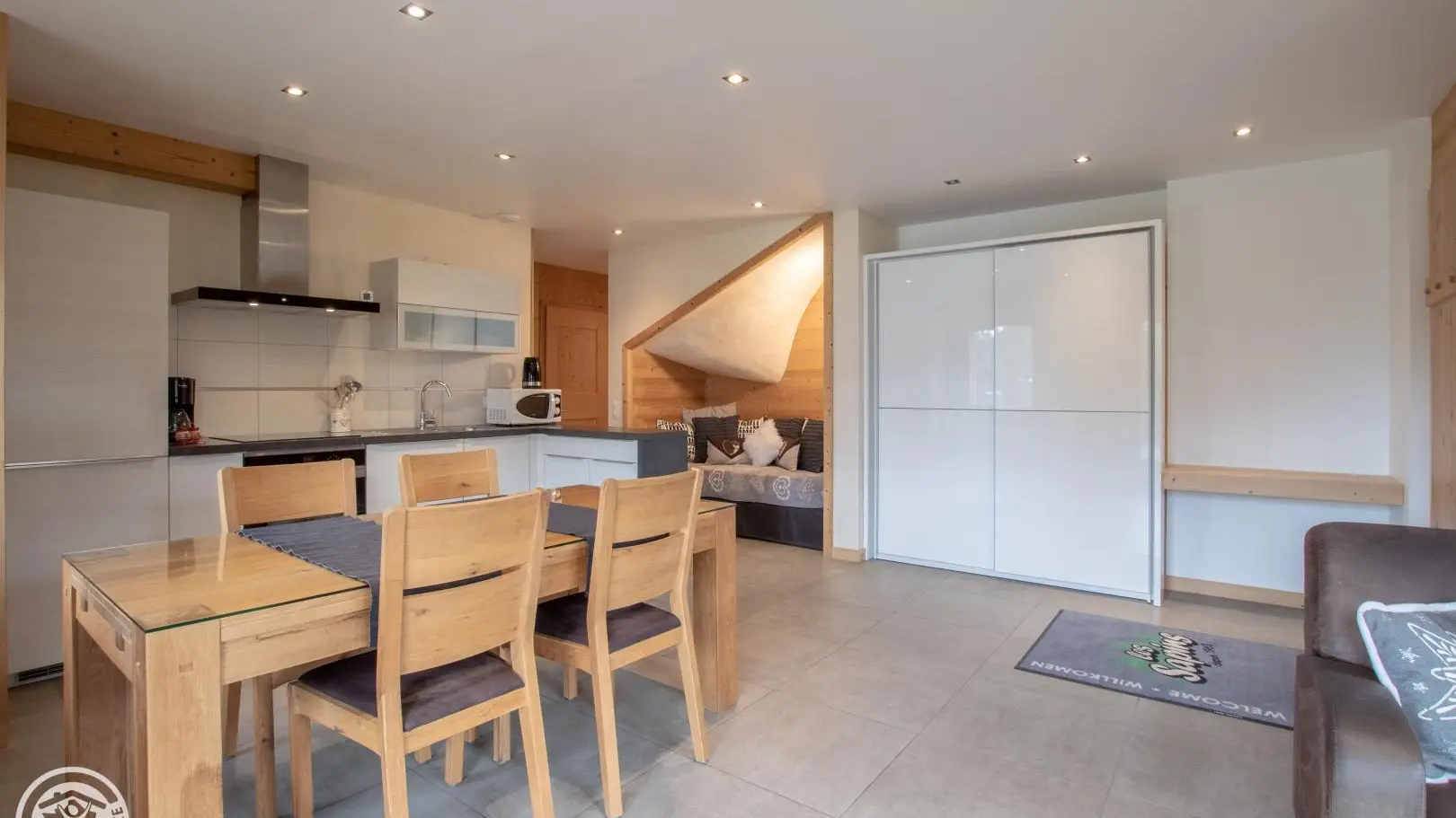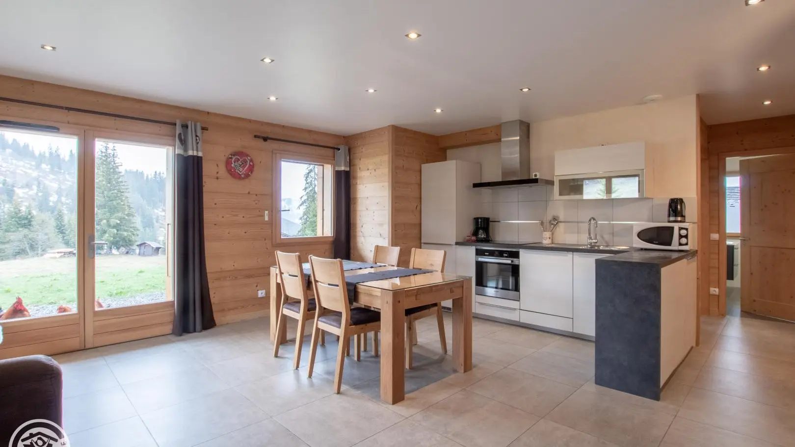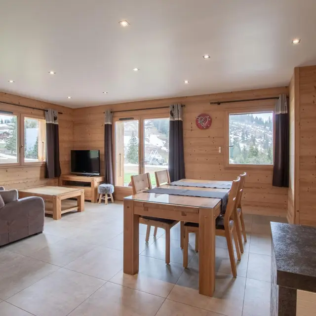Ambiance mêlant bois et modernité ou encore prestations et matériaux de grande qualité qualifient ce gite de 76m² aménagé au rez-de-jardin du chalet des propriétaires. Entrée indépendante (accès par escalier extérieur depuis le parking). Cuisine ouverte sur séjour : TV 102cm, canapé, 1 lit 90 en alcôve, accès à la terrasse avec vue panoramique sur les montagnes... 2 chambres : chambre 1 (1 lit 160x200cm), chambre 2 (2 lits 90x200cm jumelables), 1 salle de bains (baignoire balnéo) et 1 salle d'eau (douche, WC), 1 WC indépendant, buanderie à côté du gite (lave et sèche-linge, rangement skis, vélos). Les draps et serviettes sont fournis. Terrasse avec mobilier de jardin, barbecue. Parking. Accès illimité à l'espace bien-être avec piscine intérieure de l'hôtel-restaurant des propriétaires situé à côté du chalet (selon dates et horaires d'ouverture). Activités : Ski (La Croix Fry-Merdassier relié au domaine La Clusaz) sur place, Lac Annecy, plages à 27km, Annecy à 33km. Nombreuses randos été/hiver au départ du chalet. Tous commerces à La Clusaz à 8km.