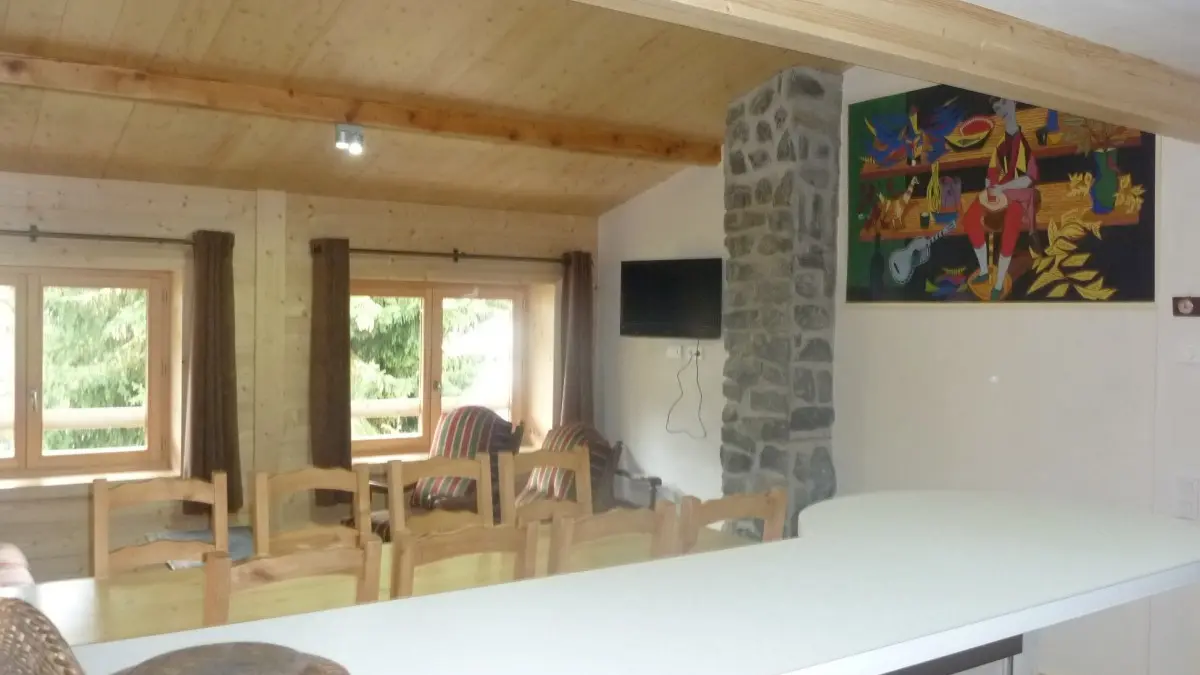 - Pièce de vie : grande cuisine équipée, coin salon avec télévision, coin repas