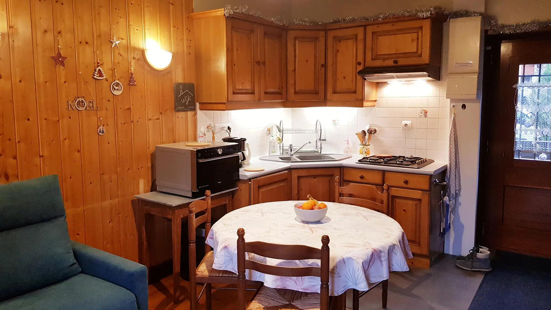 ● Coin cuisine dans le séjour exposée sud. Bouilloire, cafetière, four, hotte aspirante, lave linge, micro-ondes, réfrigérateur.