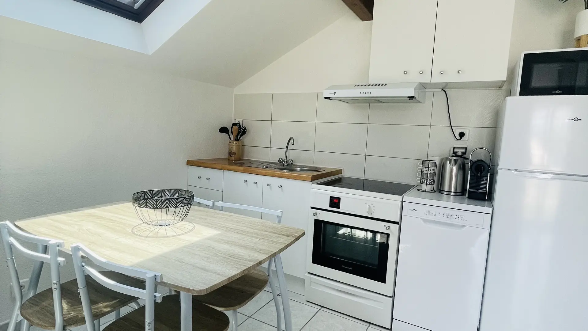 La cuisine est entièrement équipée et possède de nombreux appareils utiles (lave vaisselle, grille-pain, bouilloire, micro-onde, frigo, congélateur, four, plaque vitro céramique, appareil à fondue, appareil à raclette, machine à café Nespresso...) ou intéressants (à découvrir sur place).