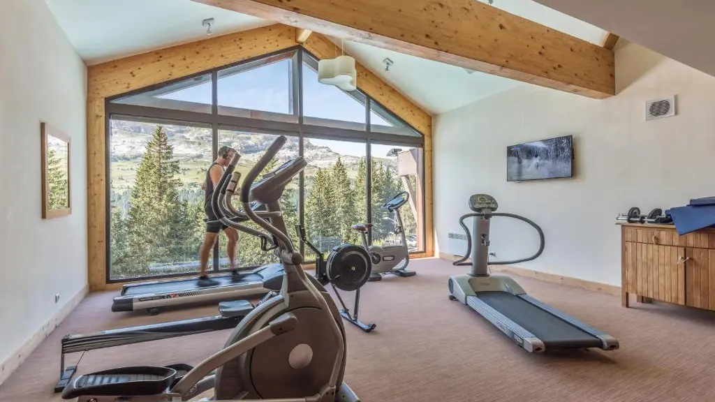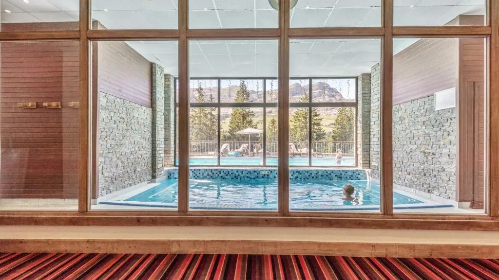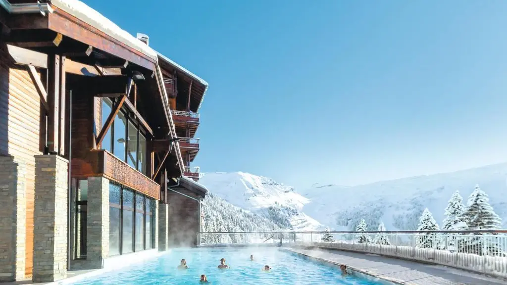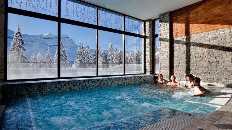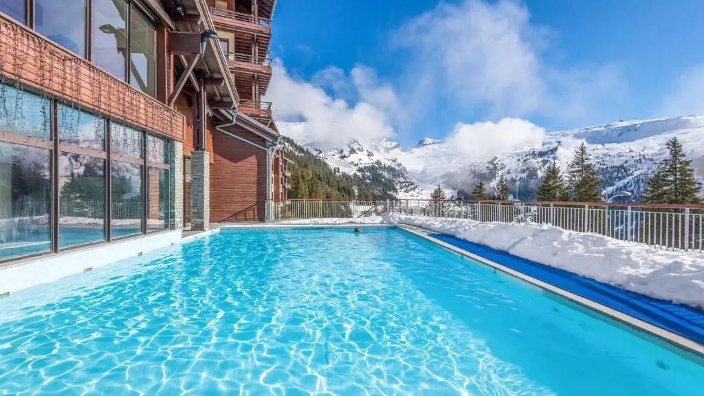 Prestations proposées dans la résidence : piscine extérieure chauffée face aux montagnes, hammam, sauna, et bain à remous.