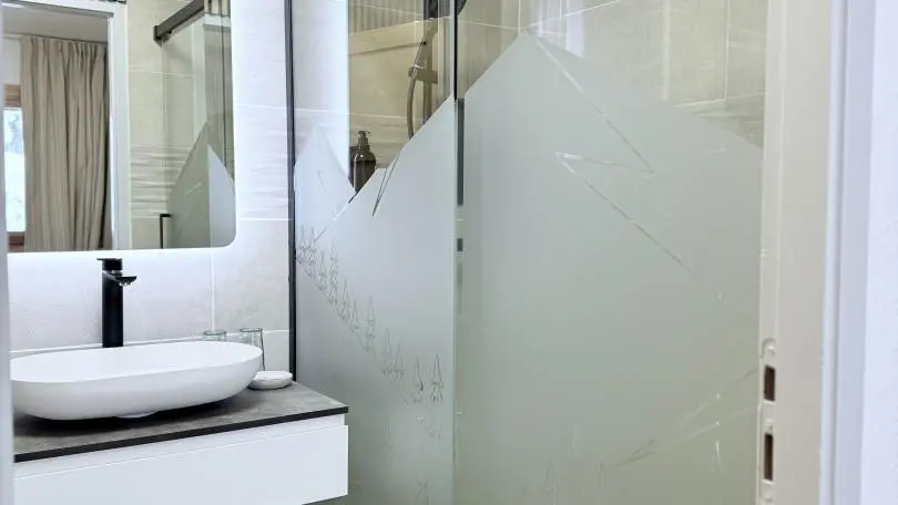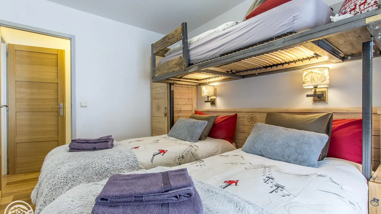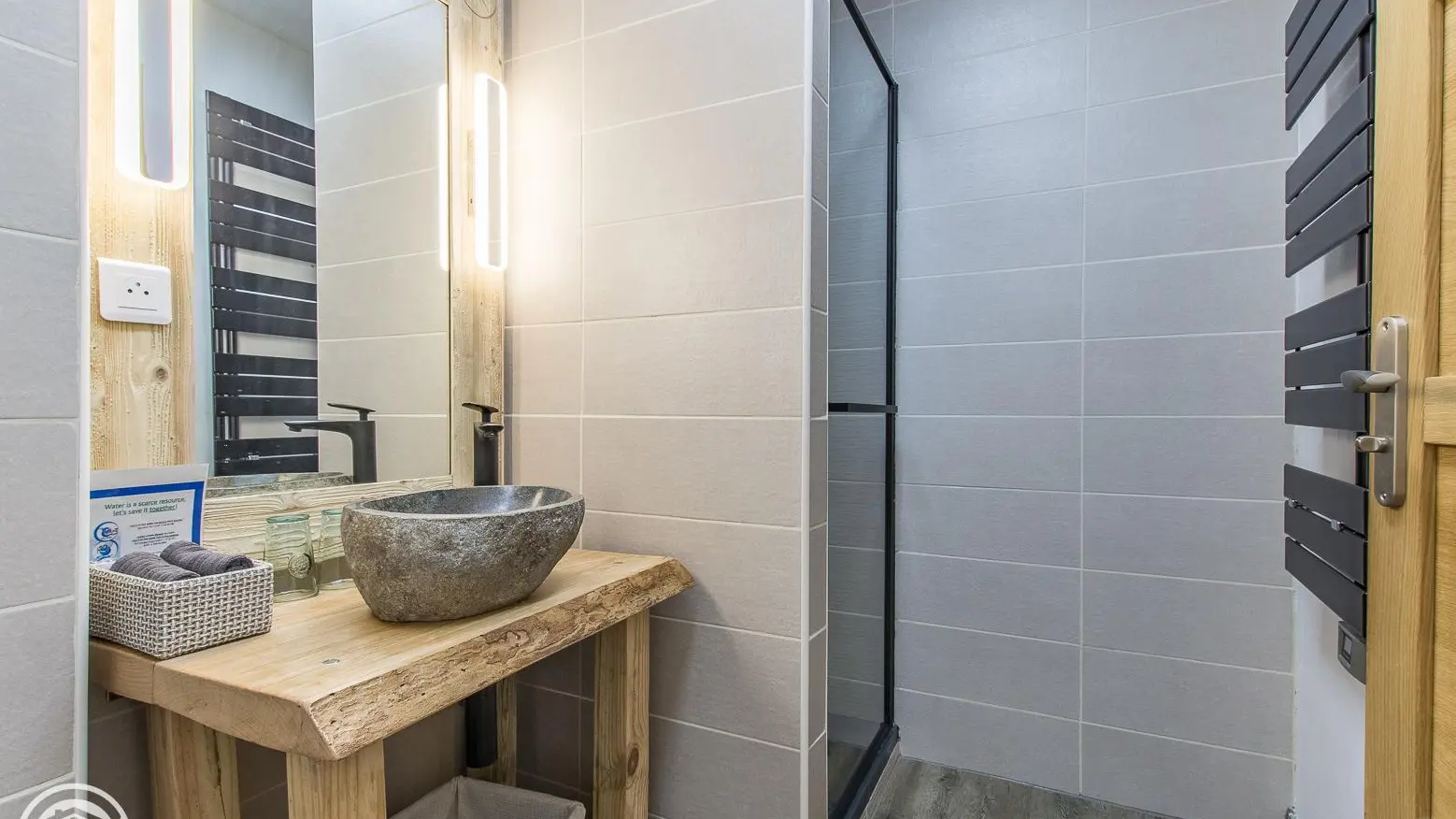 Dans le gîte : cuisine intégrée ouverte sur la partie séjour/salon (Tv, coin repas, canapé convertible offrant un confortable couchage d'appoint 160x200cm), chambre 1 (1 lit 160x200cm, salle de bains privative avec grande douche et wc), chambre 2 (3 lits 90x200cm, dont 1 en hauteur), salle d'eau (douche, wc).