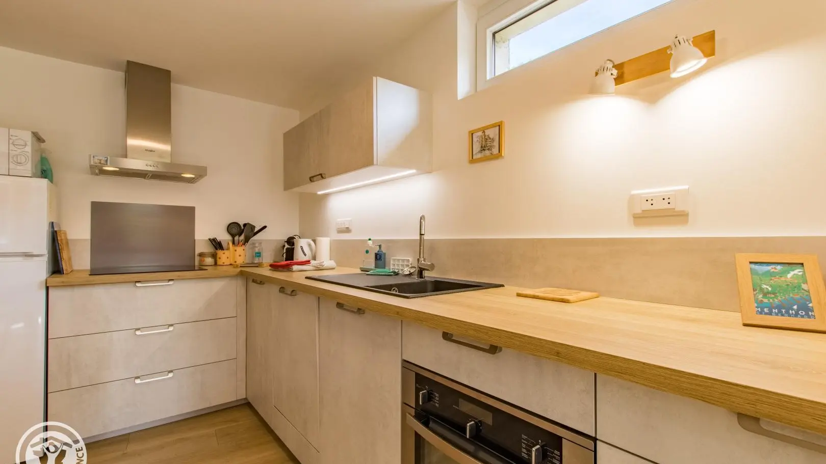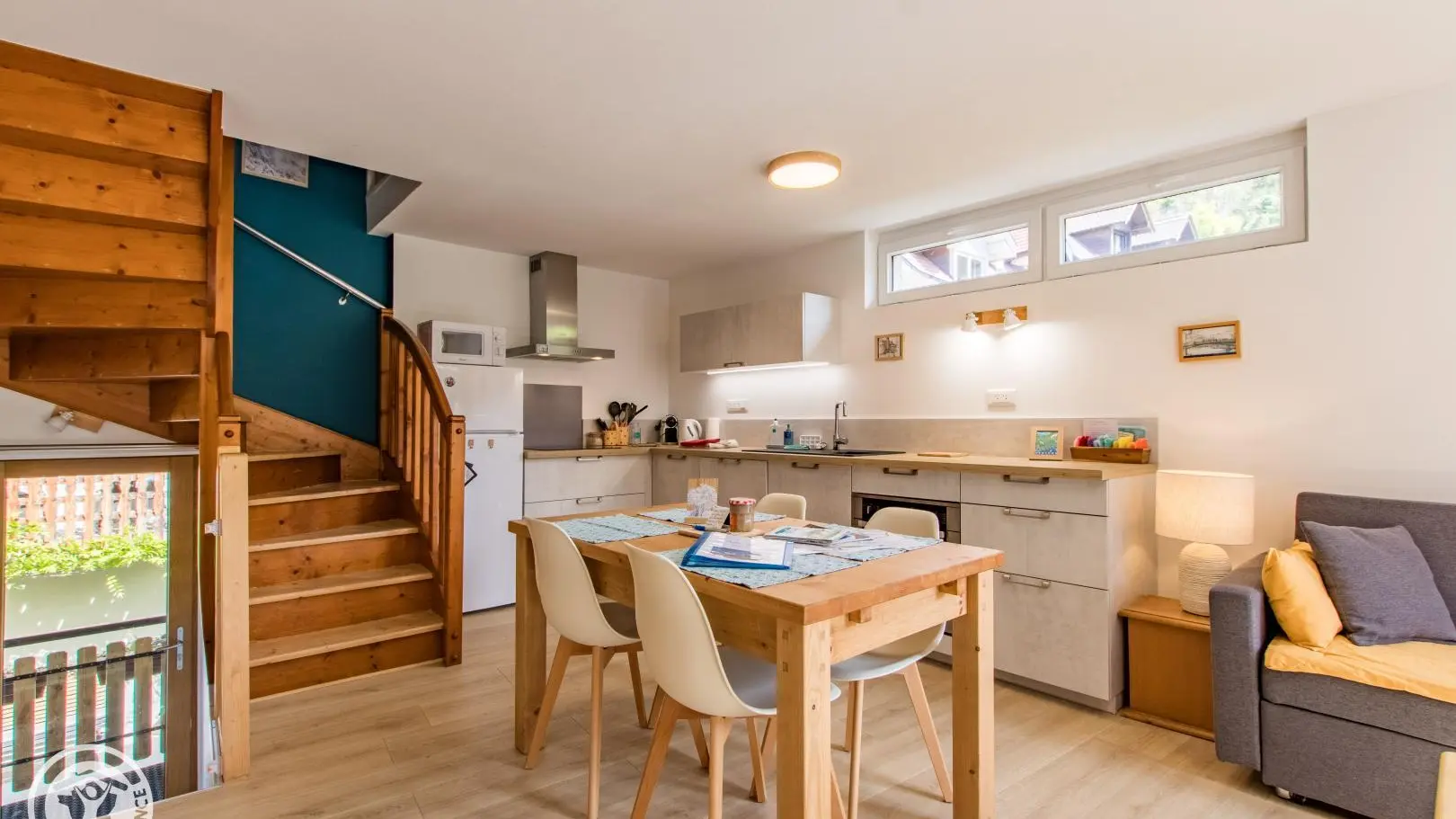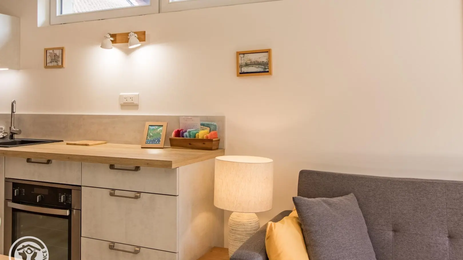 Cuisine équipée ouverte sur le séjour (table pour les repas, canapé d'angle, télévision), wc indépendant avec vasque sur meuble.