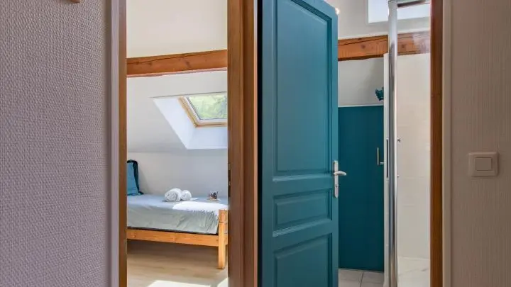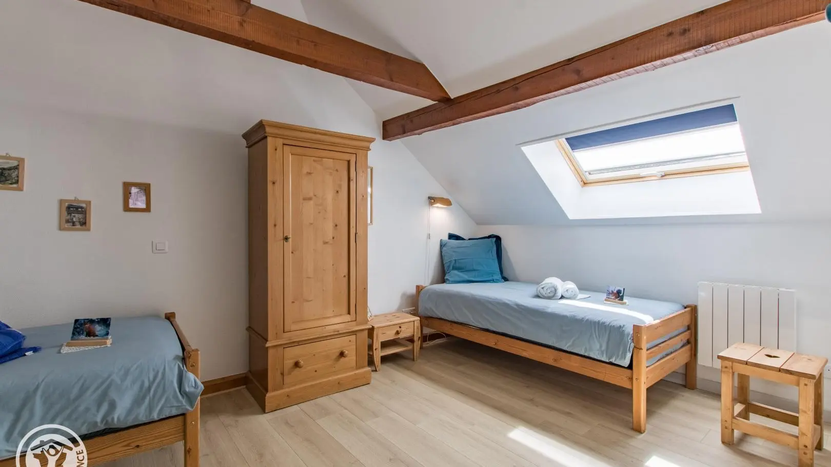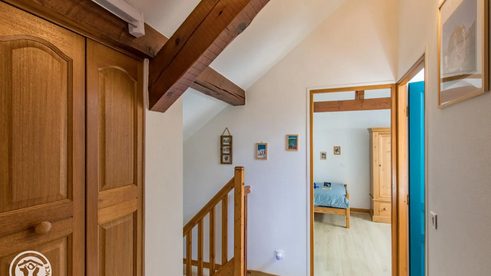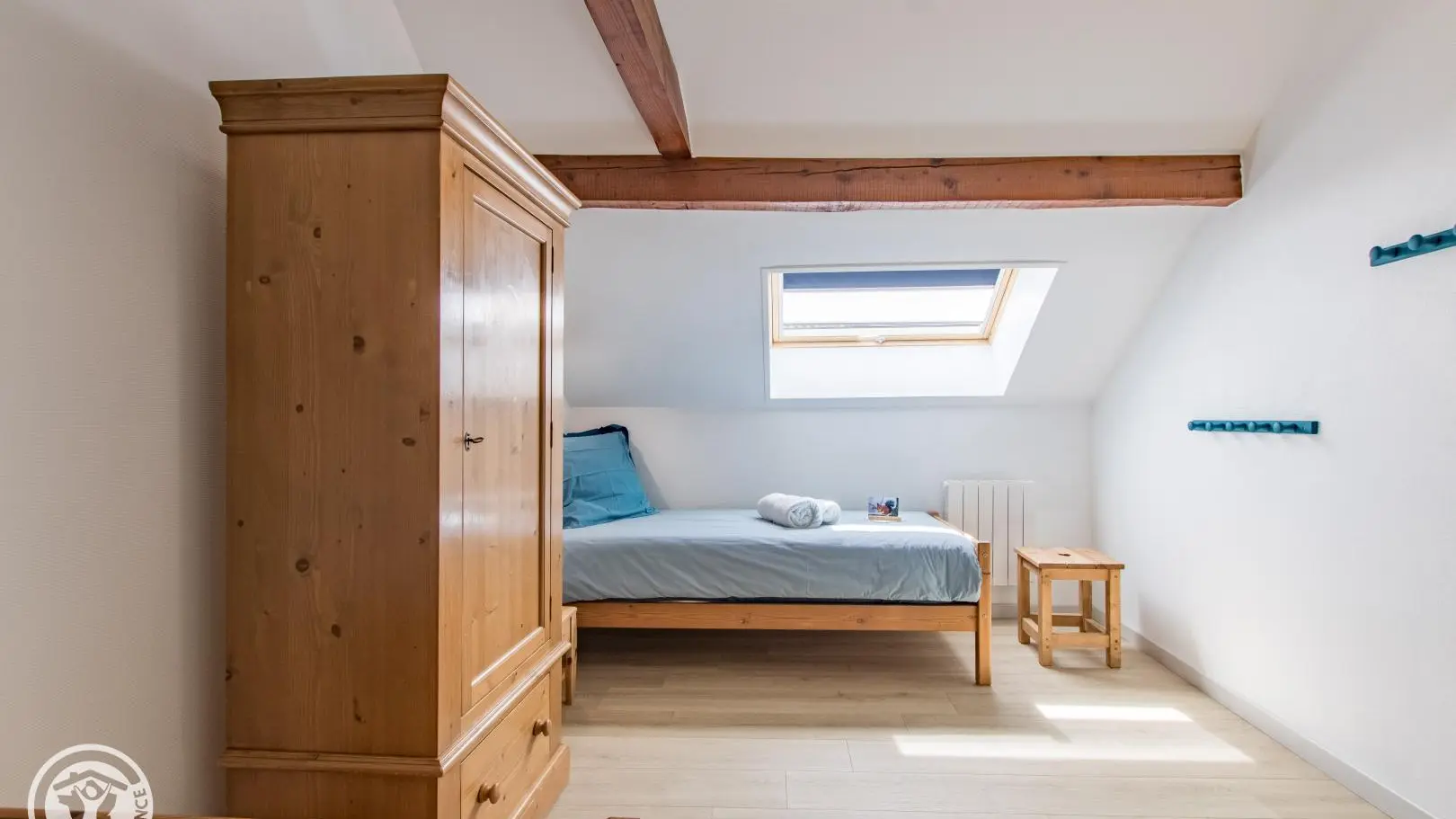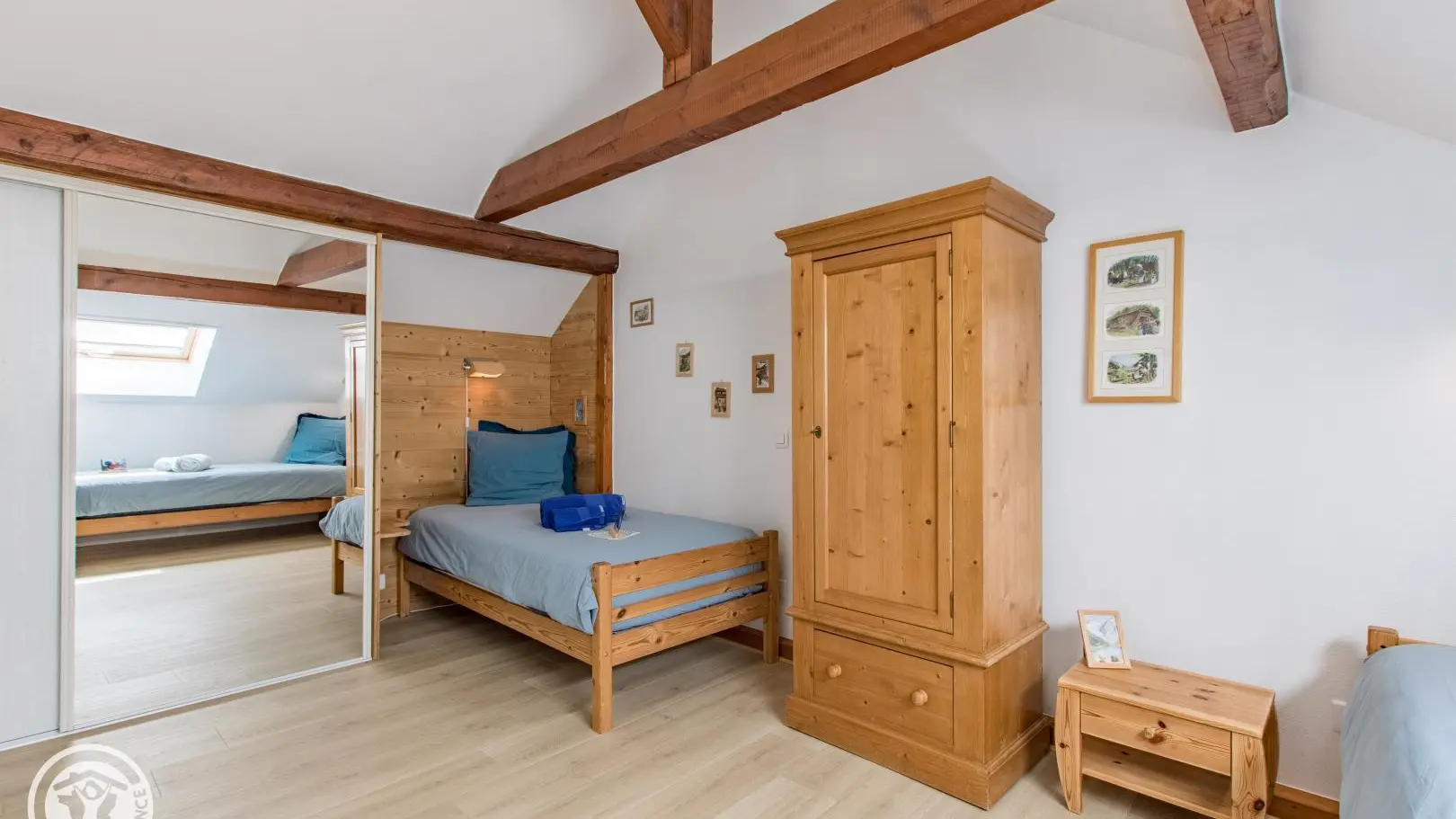 En duplex, 2 chambres : chambre 1 (1 lit 140x190cm), chambre 2 (2 lits 90x190cm). Salle d'eau avec douche et vasque sur meuble. 1 wc indépendant.