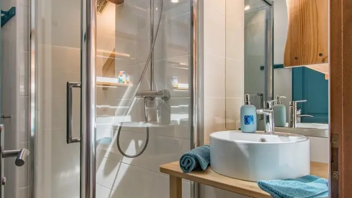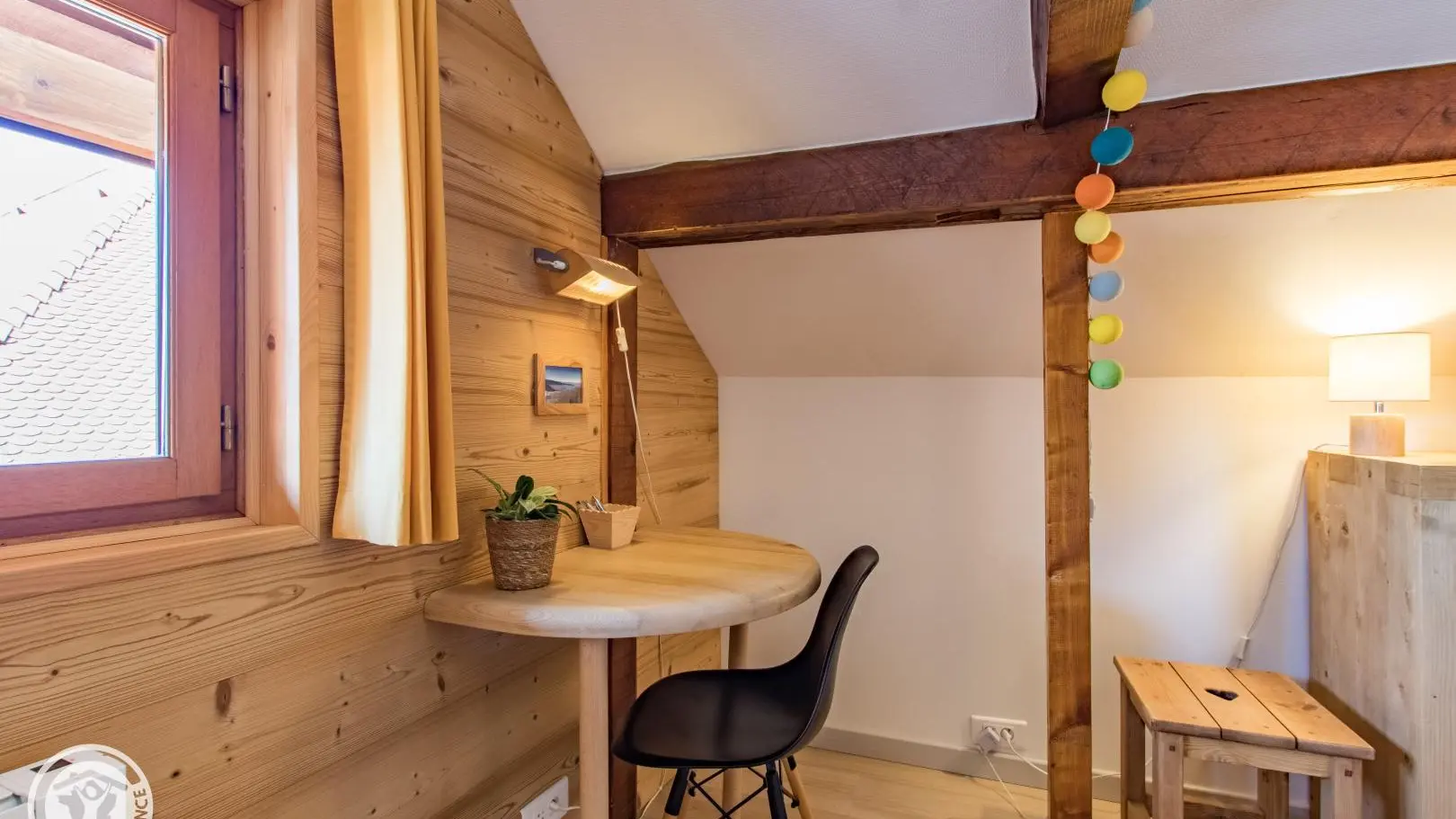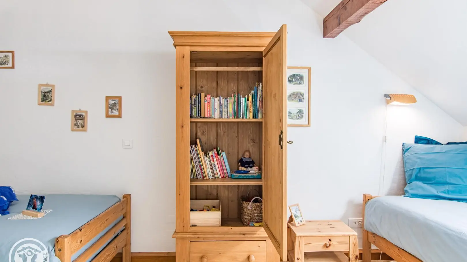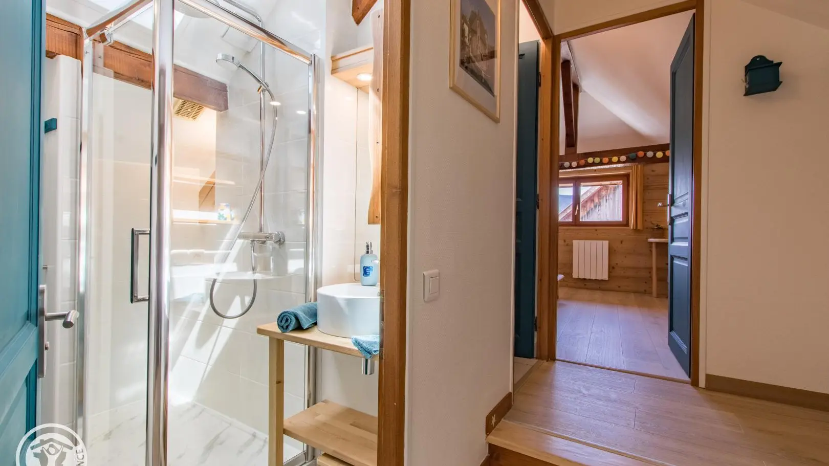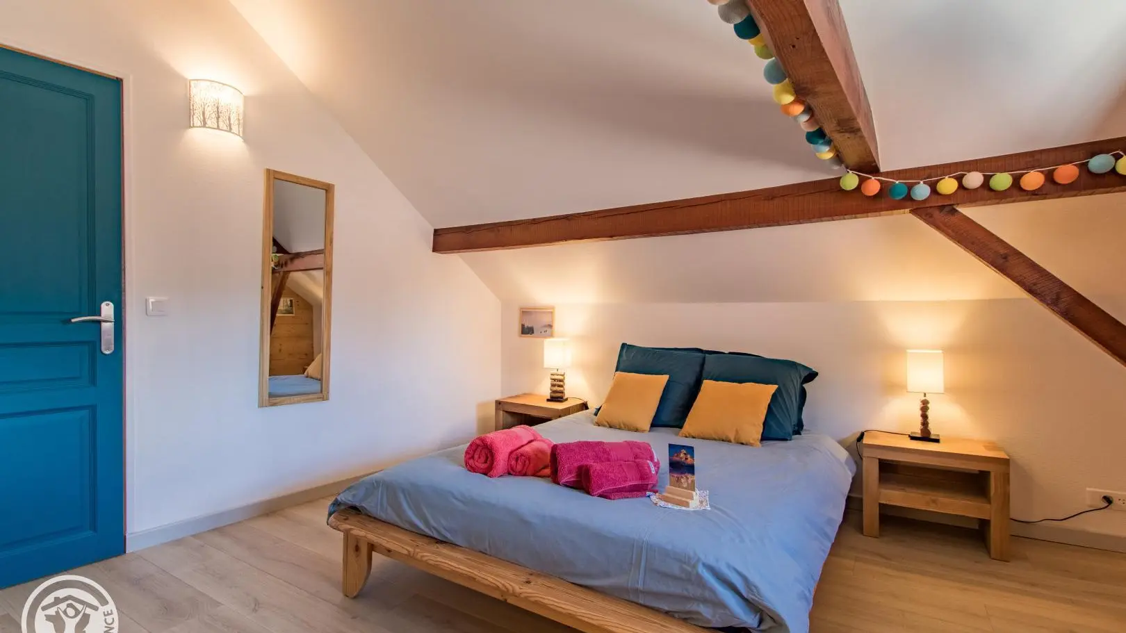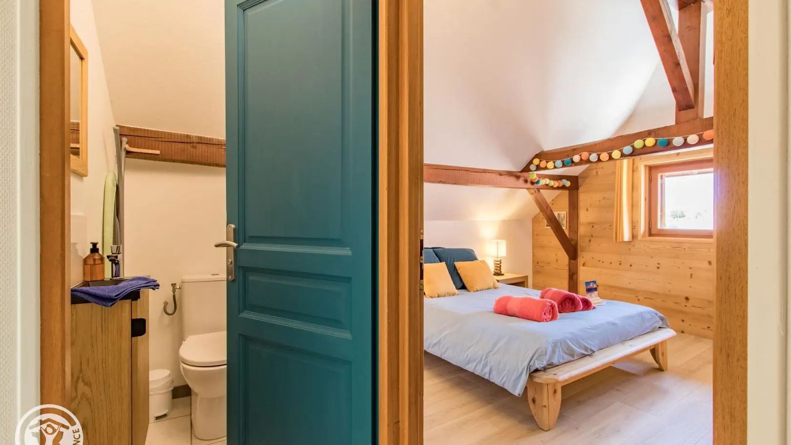 En duplex, 2 chambres : chambre 1 (1 lit 140x190cm), chambre 2 (2 lits 90x190cm). Salle d'eau avec douche et vasque sur meuble. 1 wc indépendant.
