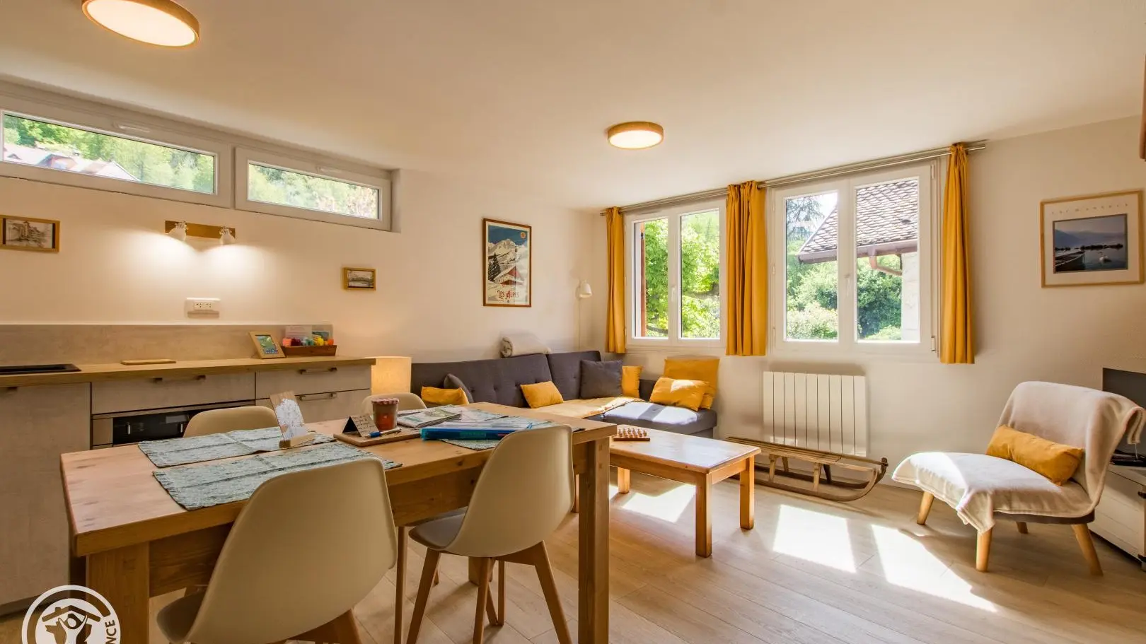 Centre de Menthon-Saint-Bernard à 15 minutes à pied (900m) : petits commerces, supérette, piste cyclable, arrêt bus permettant de rejoindre Annecy et les communes autour du lac. Plage de Menthon / Lac d'Annecy à 2km. Talloires à 4km avec son golf. Col de la Forclaz (randos, départ parapente, panorama sur le lac) à 12km.