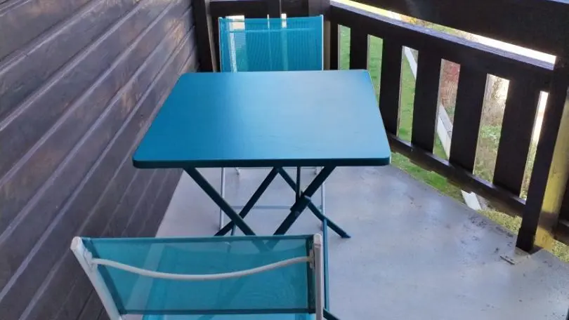 Balcon/terrasse avec table, chaises et parasol.