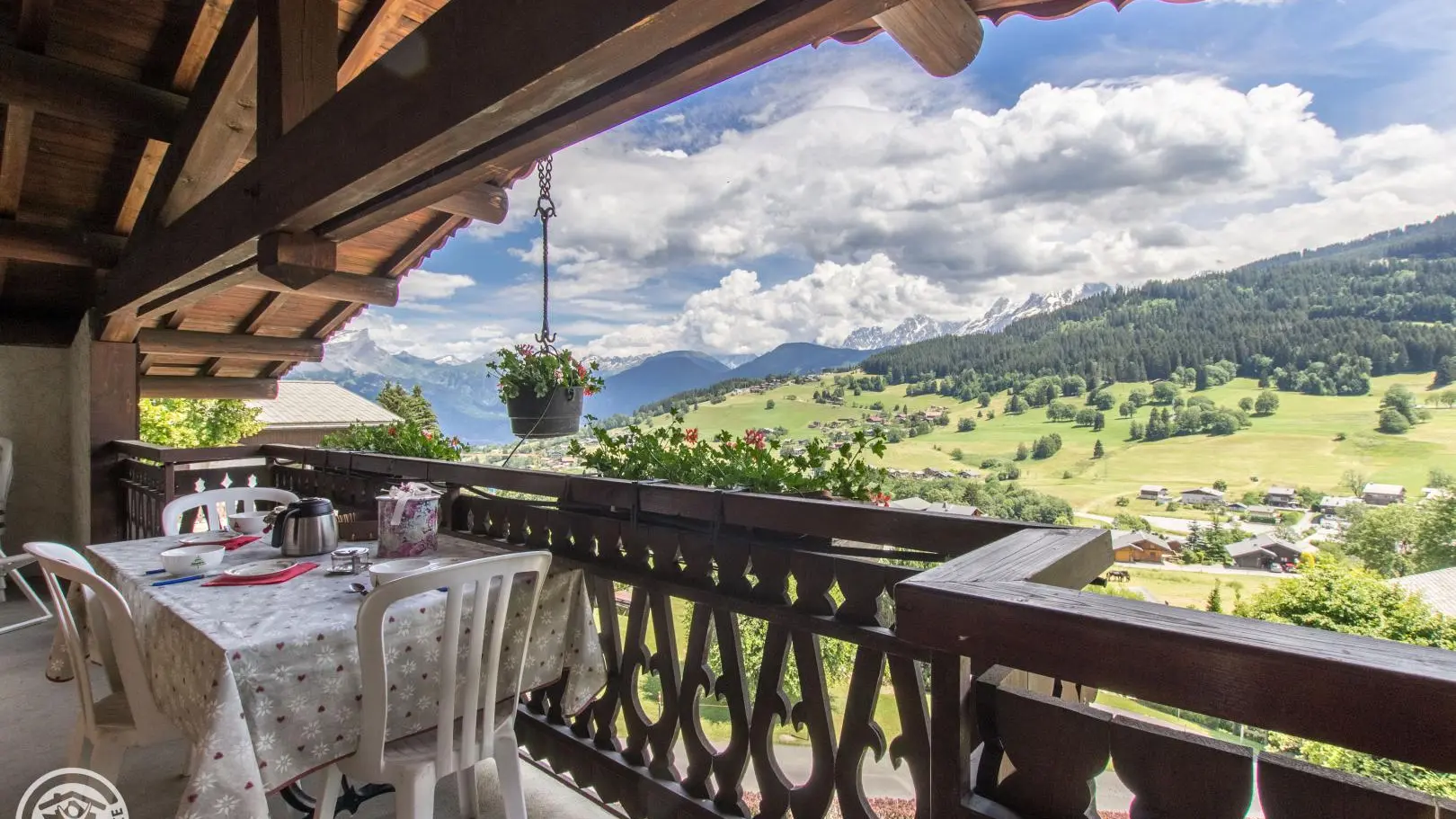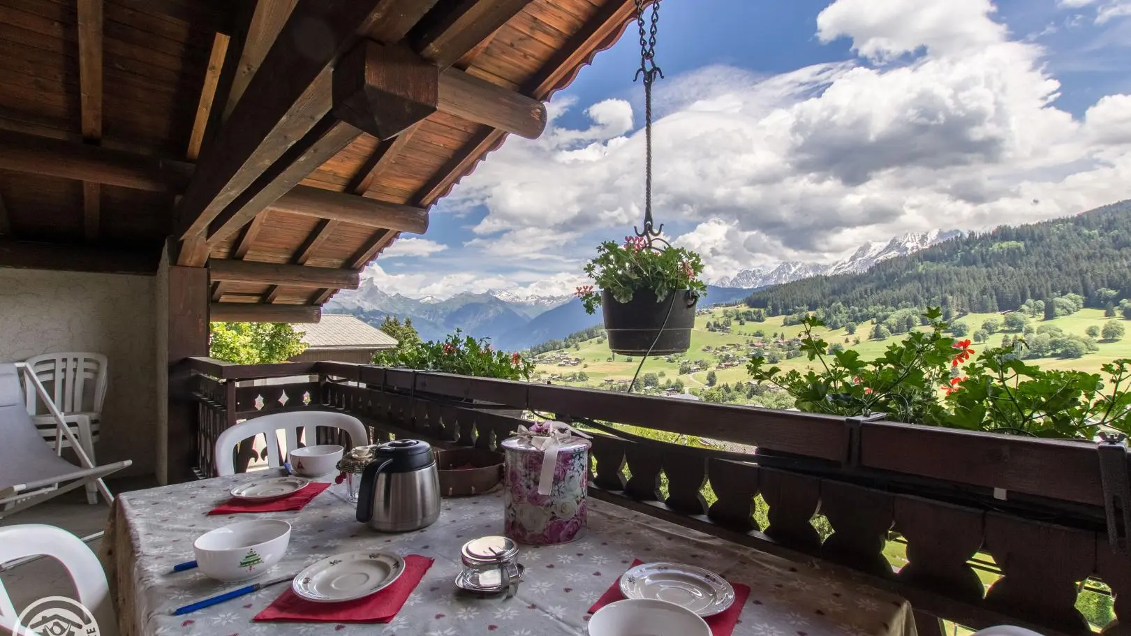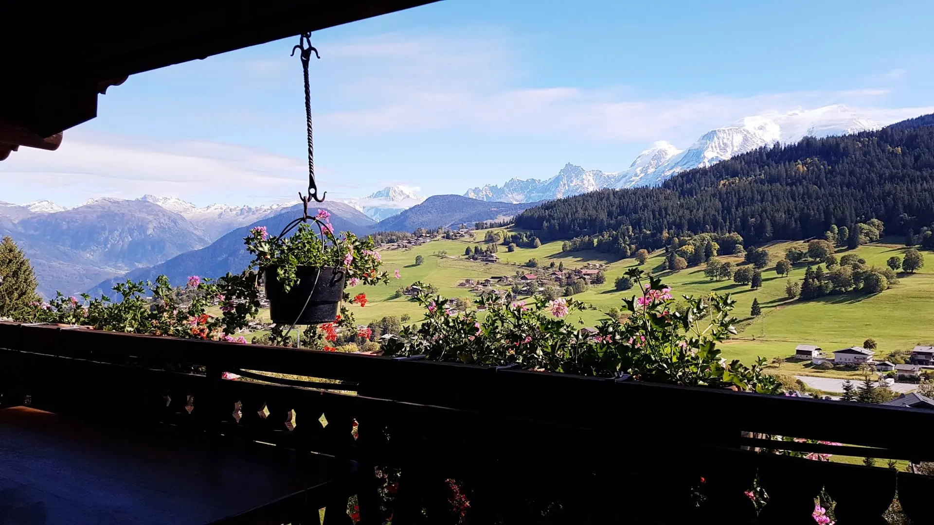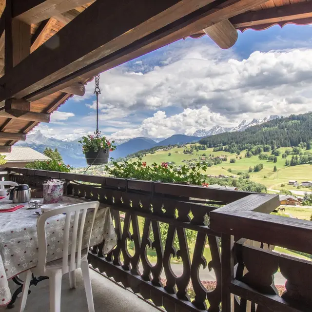 Très bel espace balcon/terrasse (table et chaises), accessible depuis la chambre et le séjour, et offrant une vue à 180° sur le Mont-Blanc et les montagnes environnantes. Internet wifi. Possibilité de louer les draps et le ligne de toilette. Local à skis.
