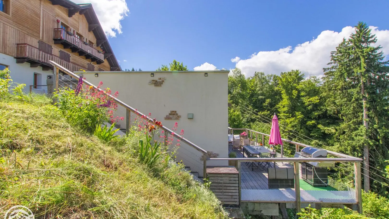 Stationnement privatif au-dessus du gîte (en haut de l'escalier). Possibilité de ranger vos skis ou vélos dans une remise annexe.