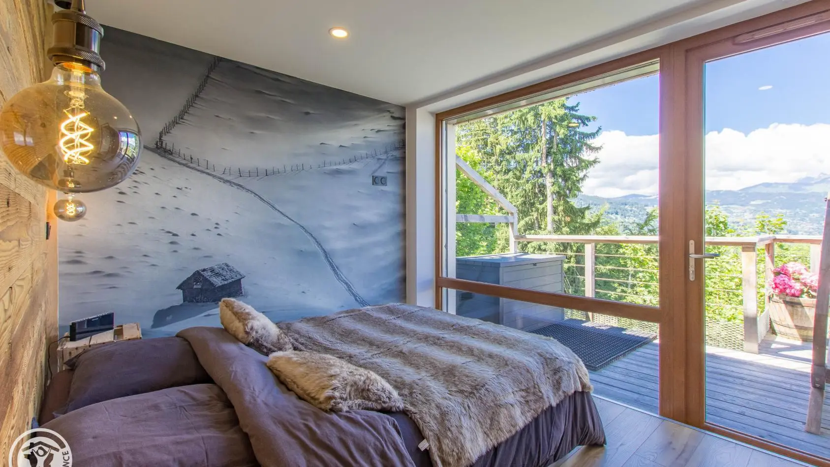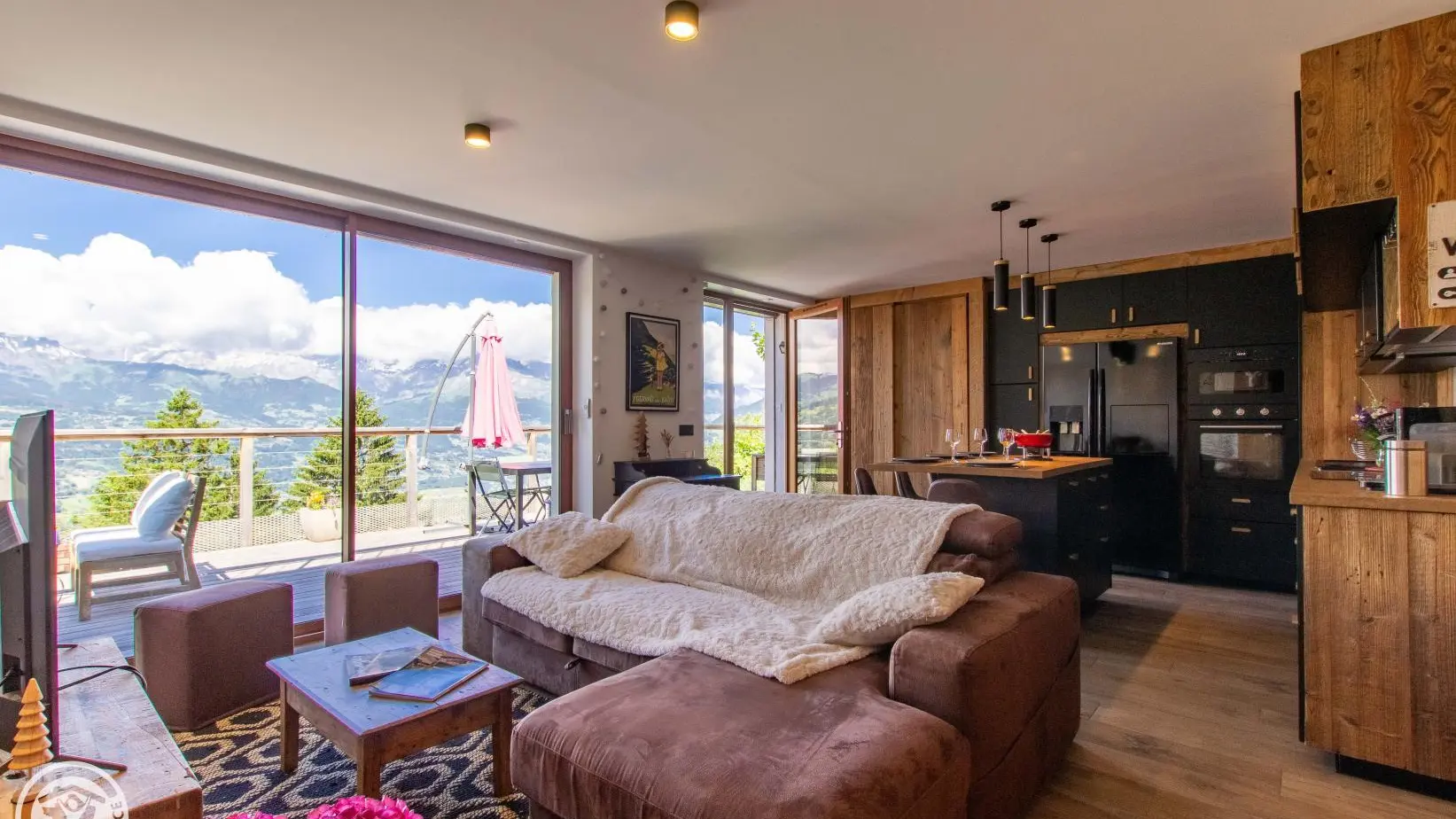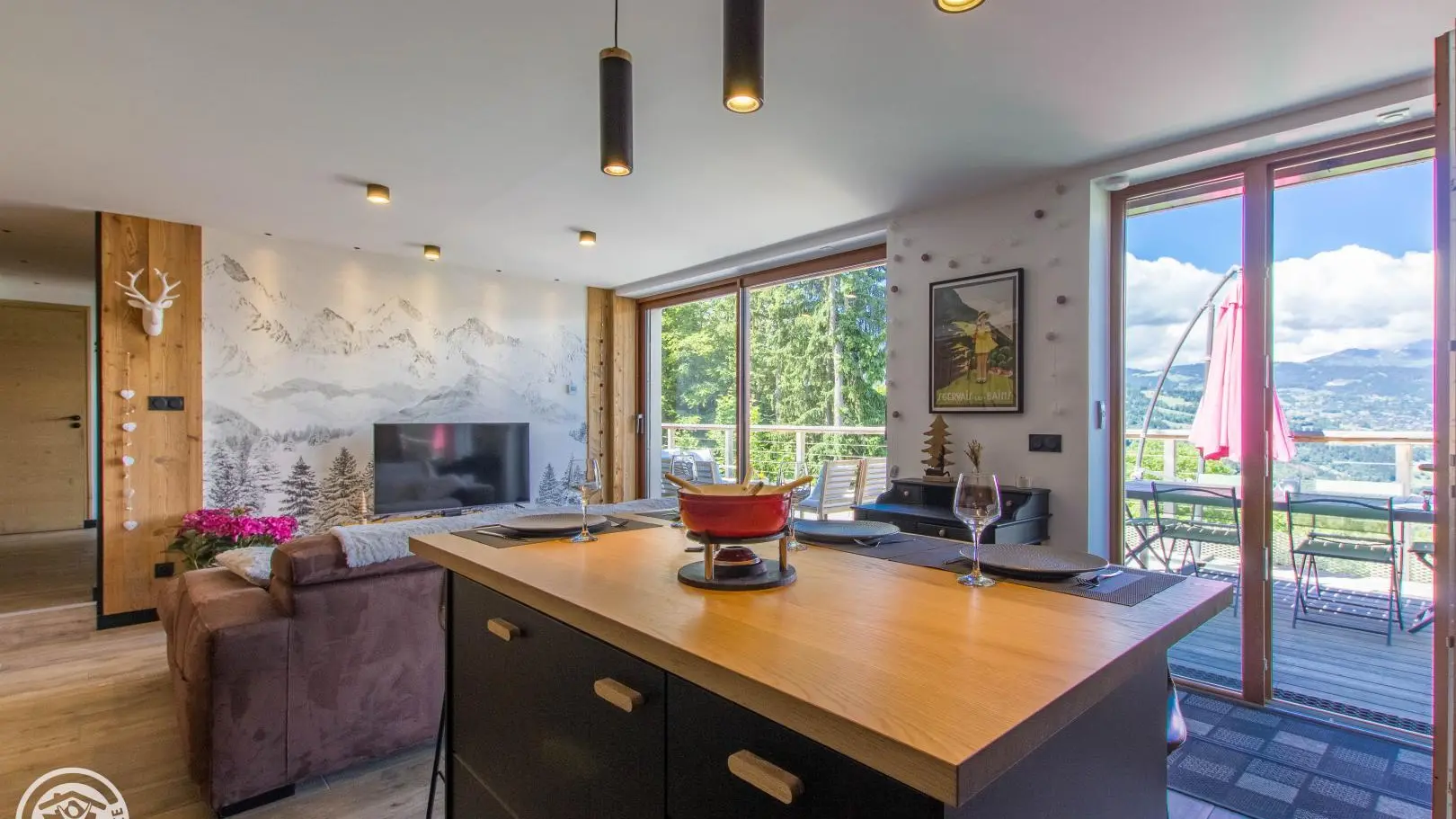 Aménagé dans la pente de la montagne, le gîte surplombe la vallée, et offre une vue panormique exceptionelle sur la chaîne des Aravis et la cime des arbres. Le gîte est composé d’une belle pièce à vivre avec cuisine intégrée ouverte sur la partie séjour/salon (Tv, canapé), chambre 1 (1 lit 140x190cm), chambre 2 (1 lit 140x190cm + 1 lit 90x190cm superposé), salle d'eau (douche), wc indépendant.