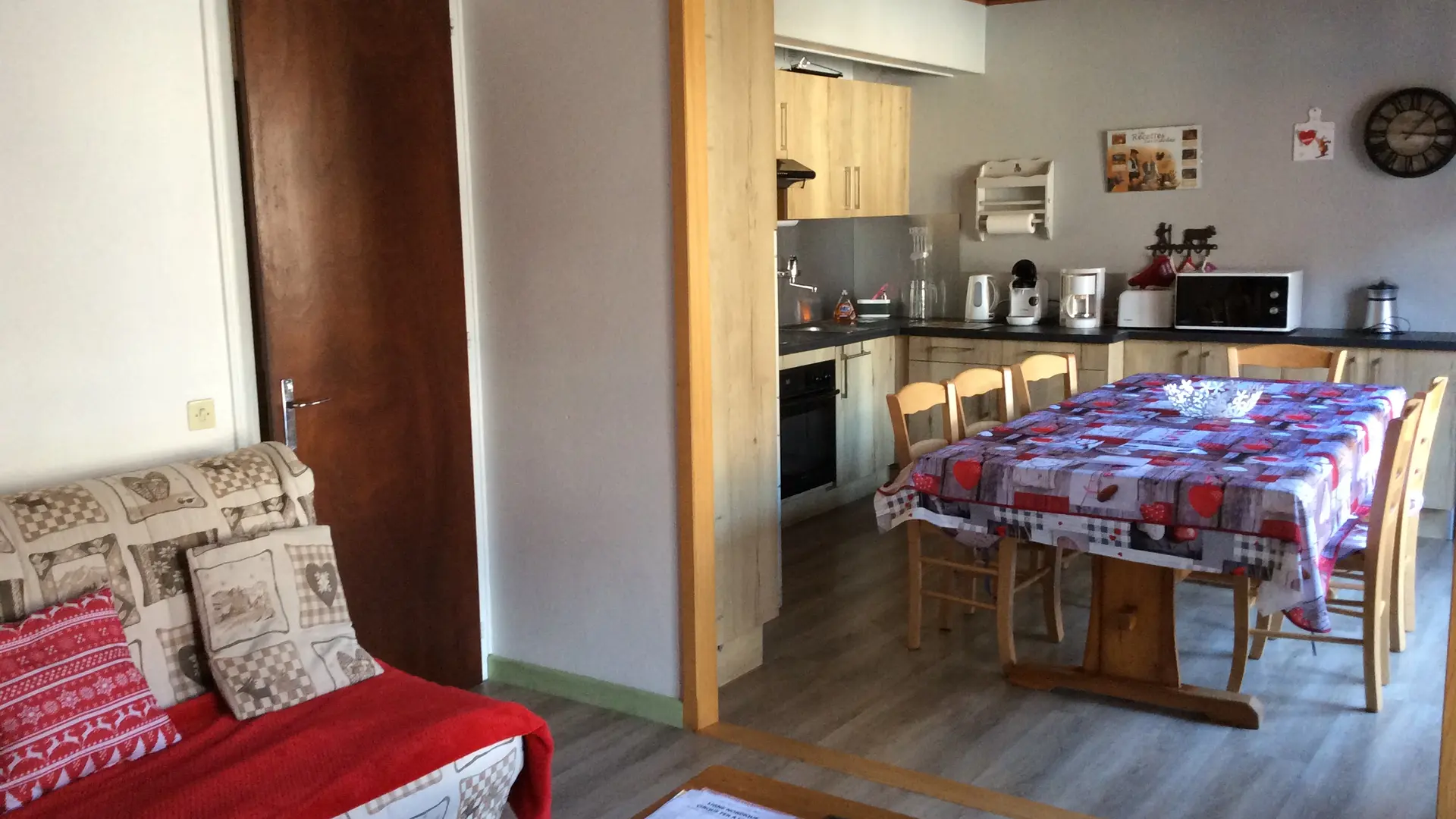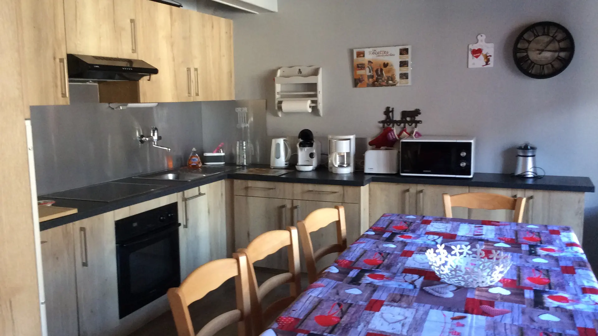 Coin cuisine sejour avec plaque 4 feux,four, micro-ondes et lave vaisselle.