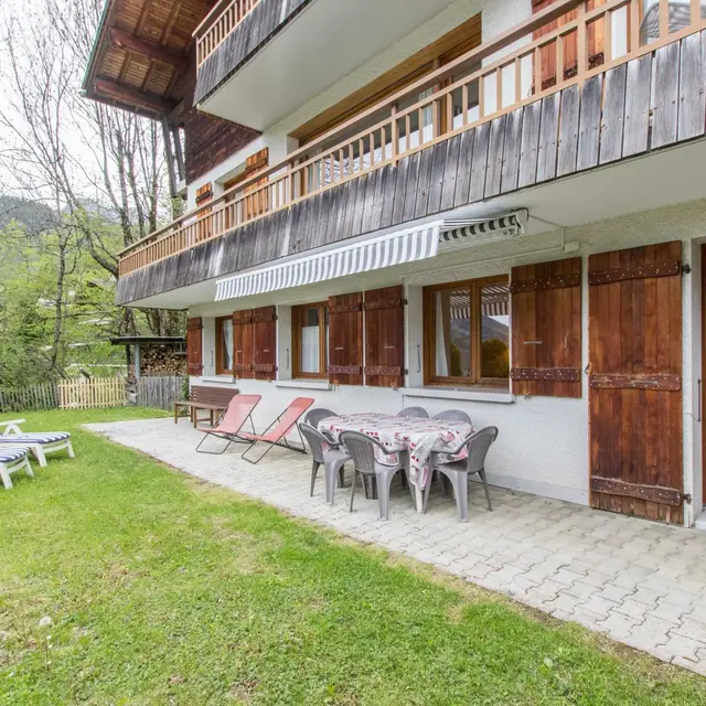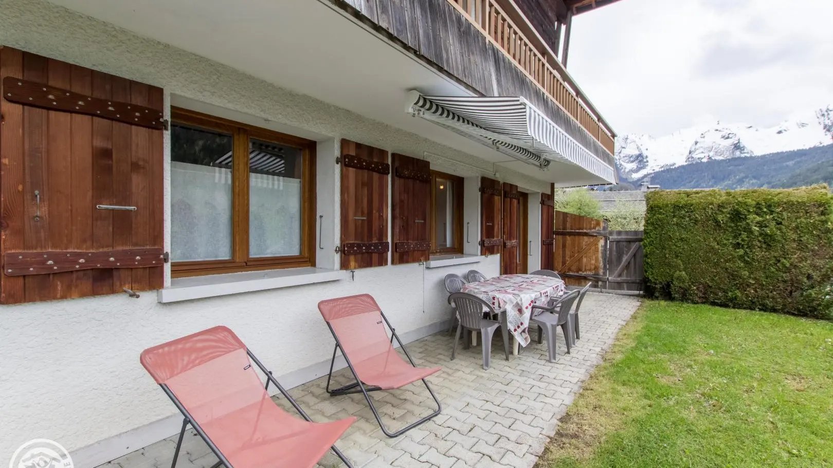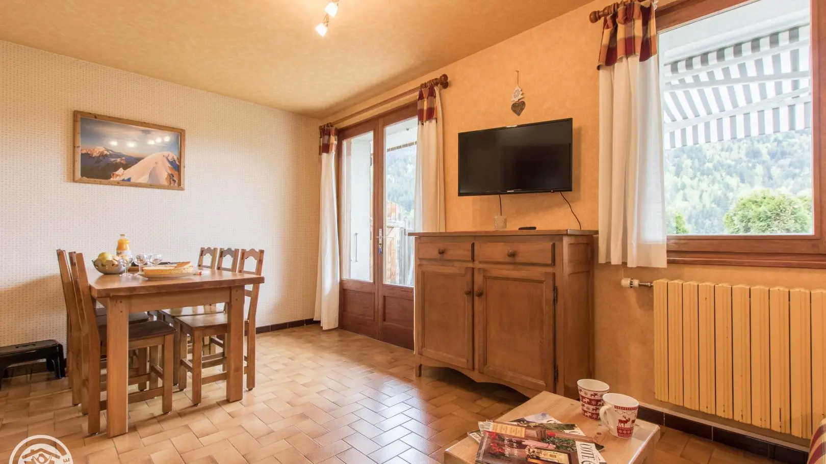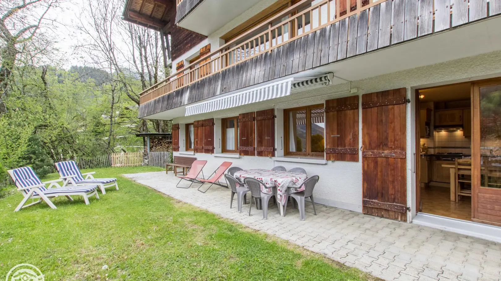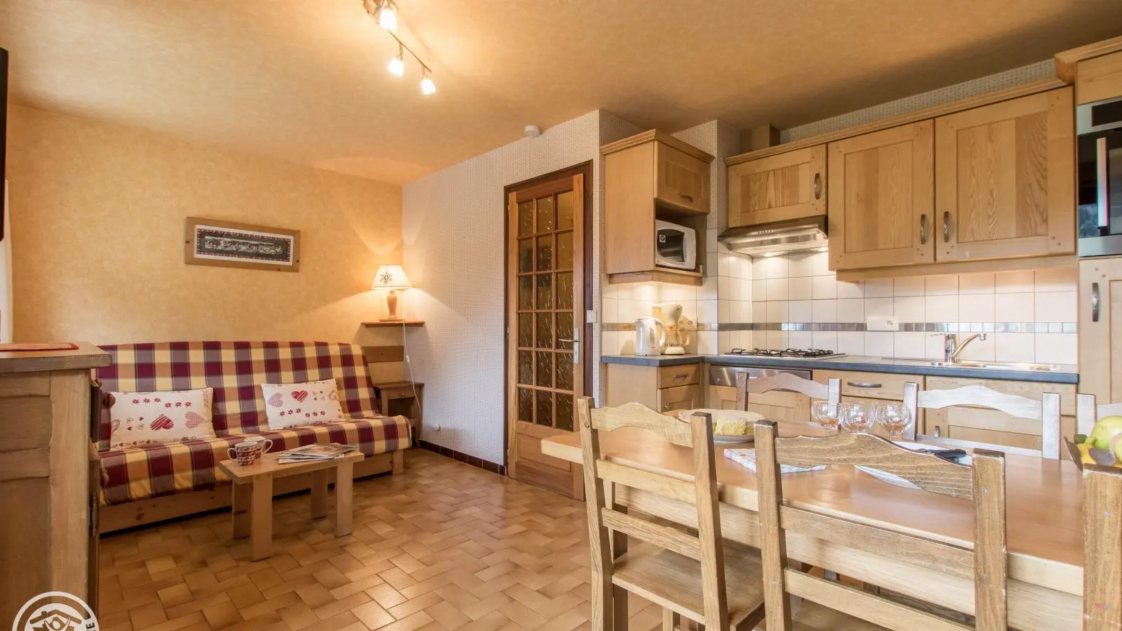 Appartement de 50m² avec 2 chambres aménagé au rez-de-chaussée d'un chalet comprenant 2 autres locations et 1 logement propriétaire. Entrée indépendante. Capacité 4 à 6 personnes. Hall d'entrée, coin cuisine ouvert sur le séjour (table repas, canapé convertible clic-clac, télévision), accès à la terrasse et au jardin.