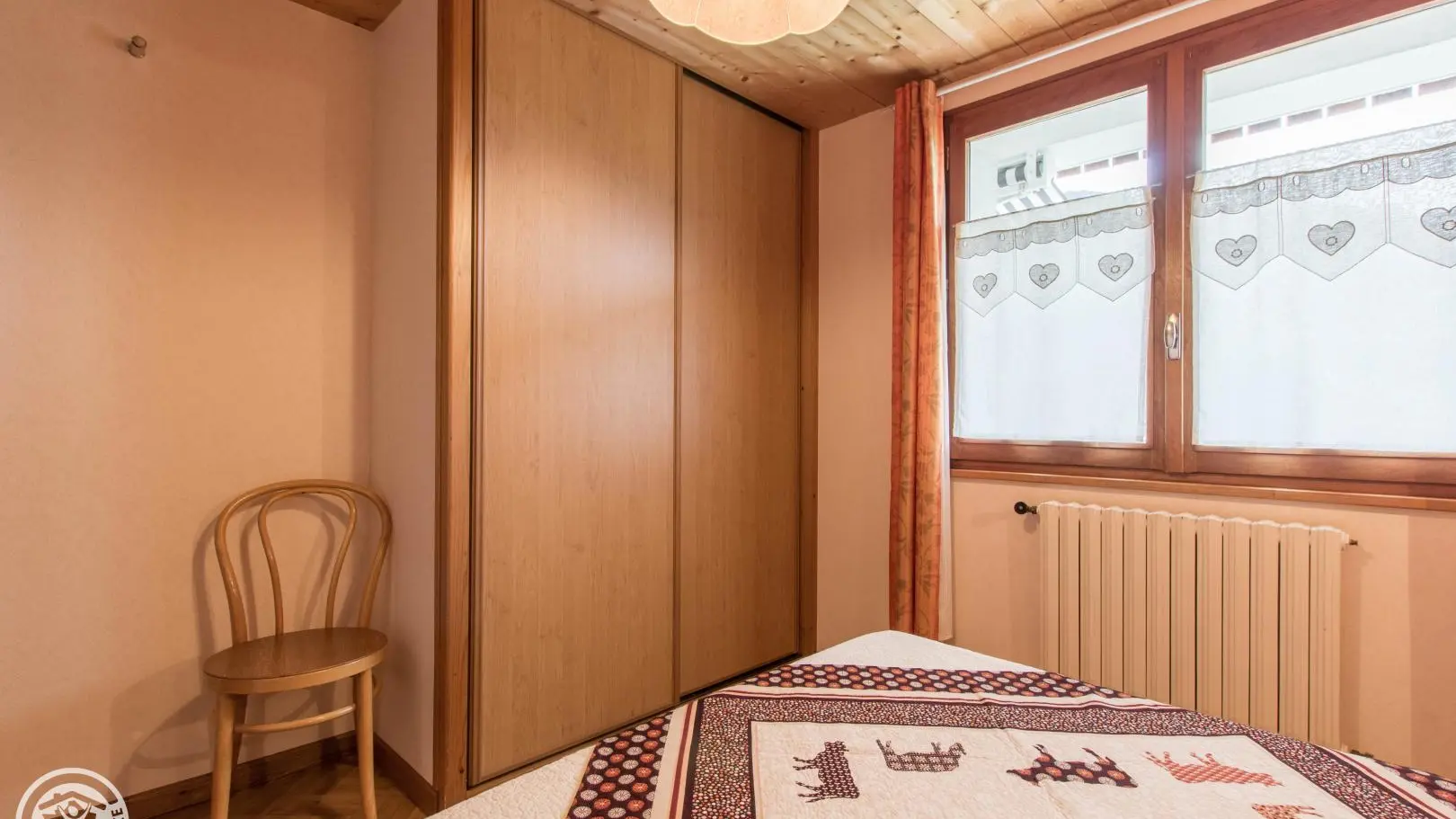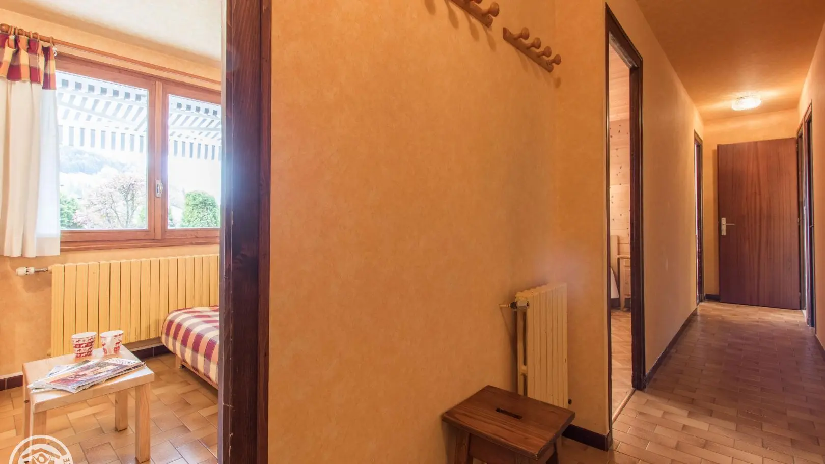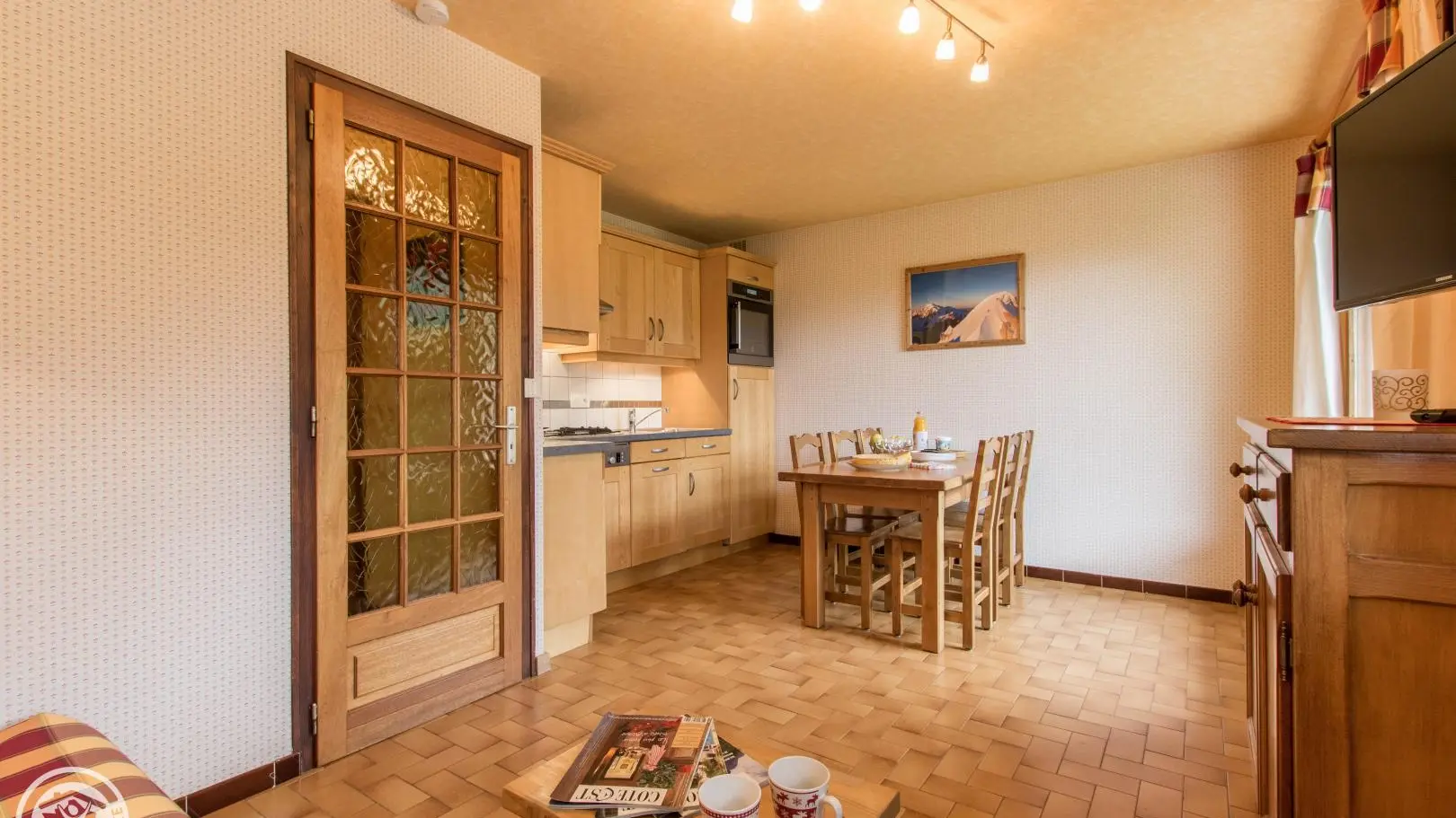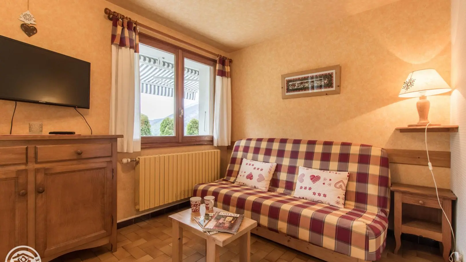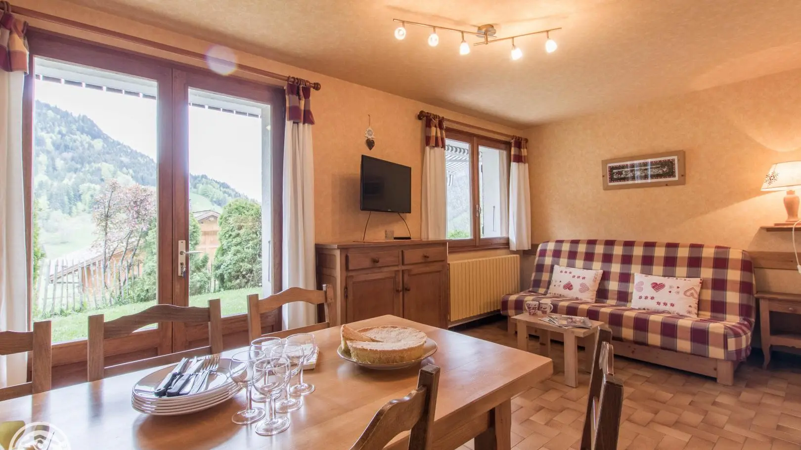 Appartement de 50m² avec 2 chambres aménagé au rez-de-chaussée d'un chalet comprenant 2 autres locations et 1 logement propriétaire. Entrée indépendante. Capacité 4 à 6 personnes. Hall d'entrée, coin cuisine ouvert sur le séjour (table repas, canapé convertible clic-clac, télévision), accès à la terrasse et au jardin.