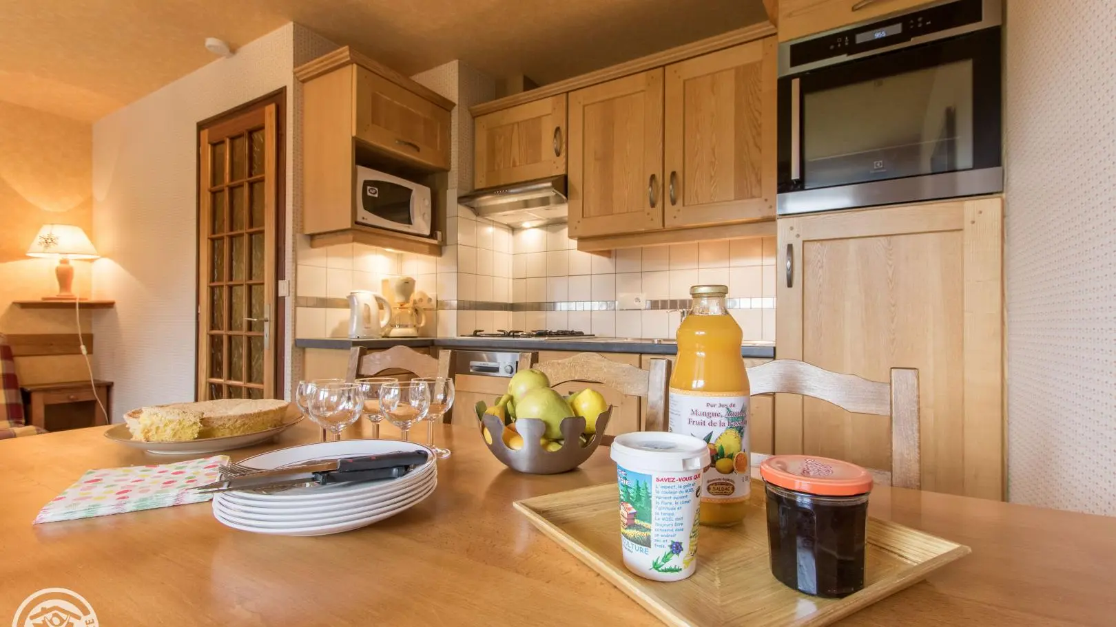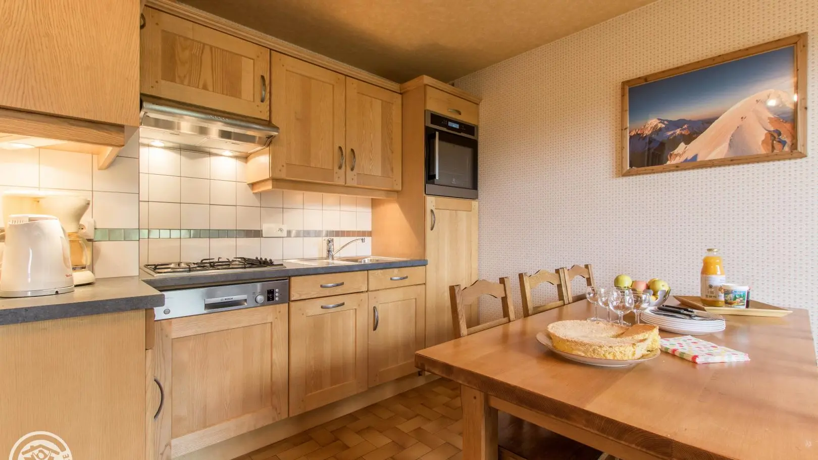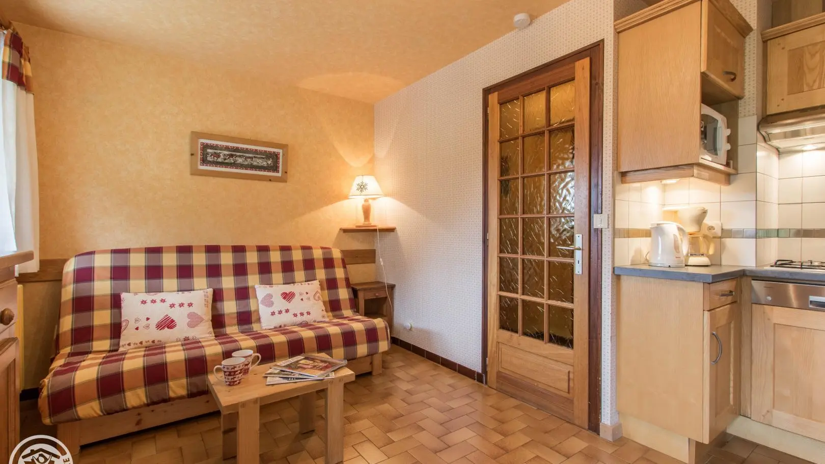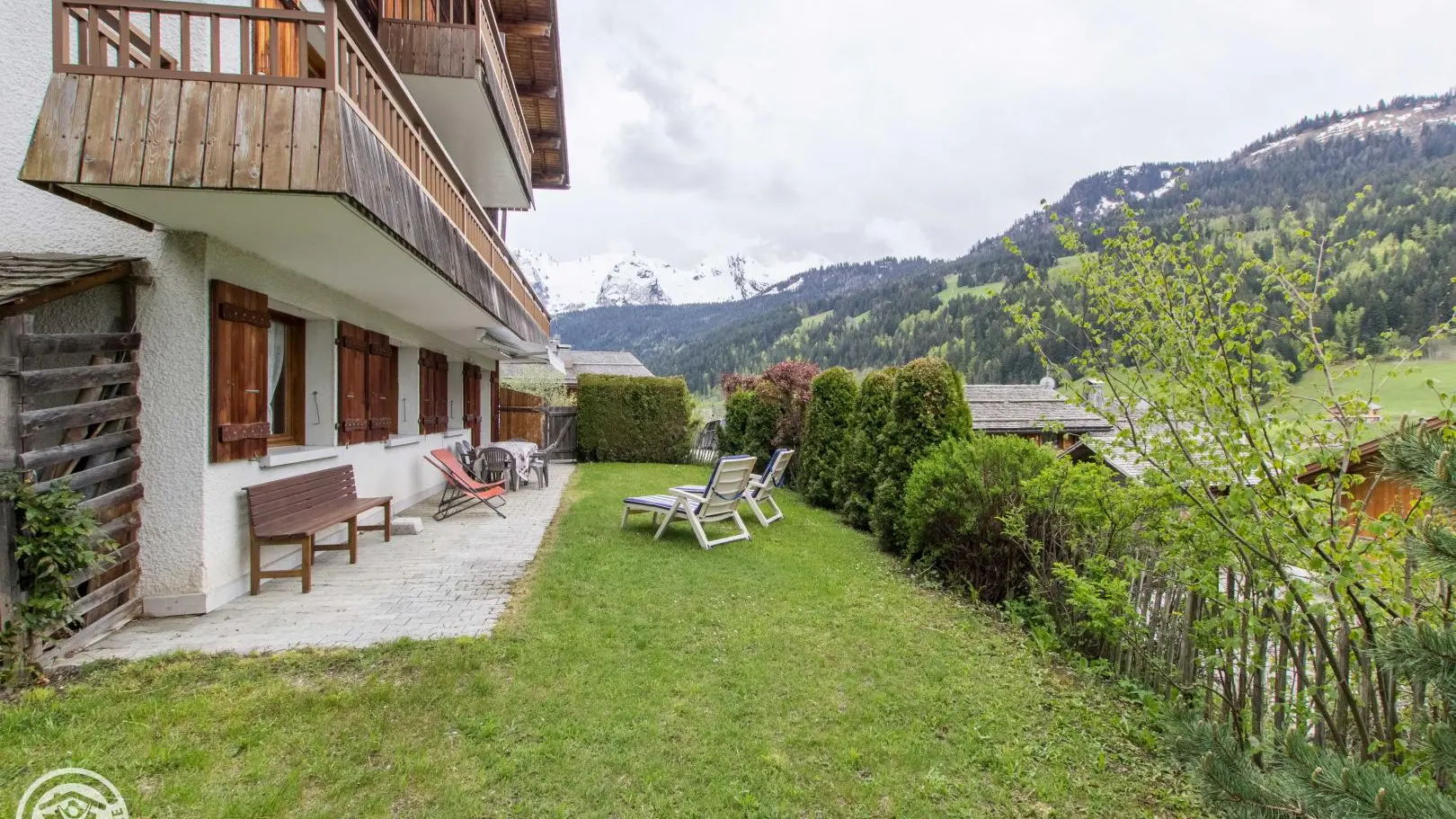 Appartement de 50m² avec 2 chambres aménagé au rez-de-chaussée d'un chalet comprenant 2 autres locations et 1 logement propriétaire. Entrée indépendante. Capacité 4 à 6 personnes. Hall d'entrée, coin cuisine ouvert sur le séjour (table repas, canapé convertible clic-clac, télévision), accès à la terrasse et au jardin.