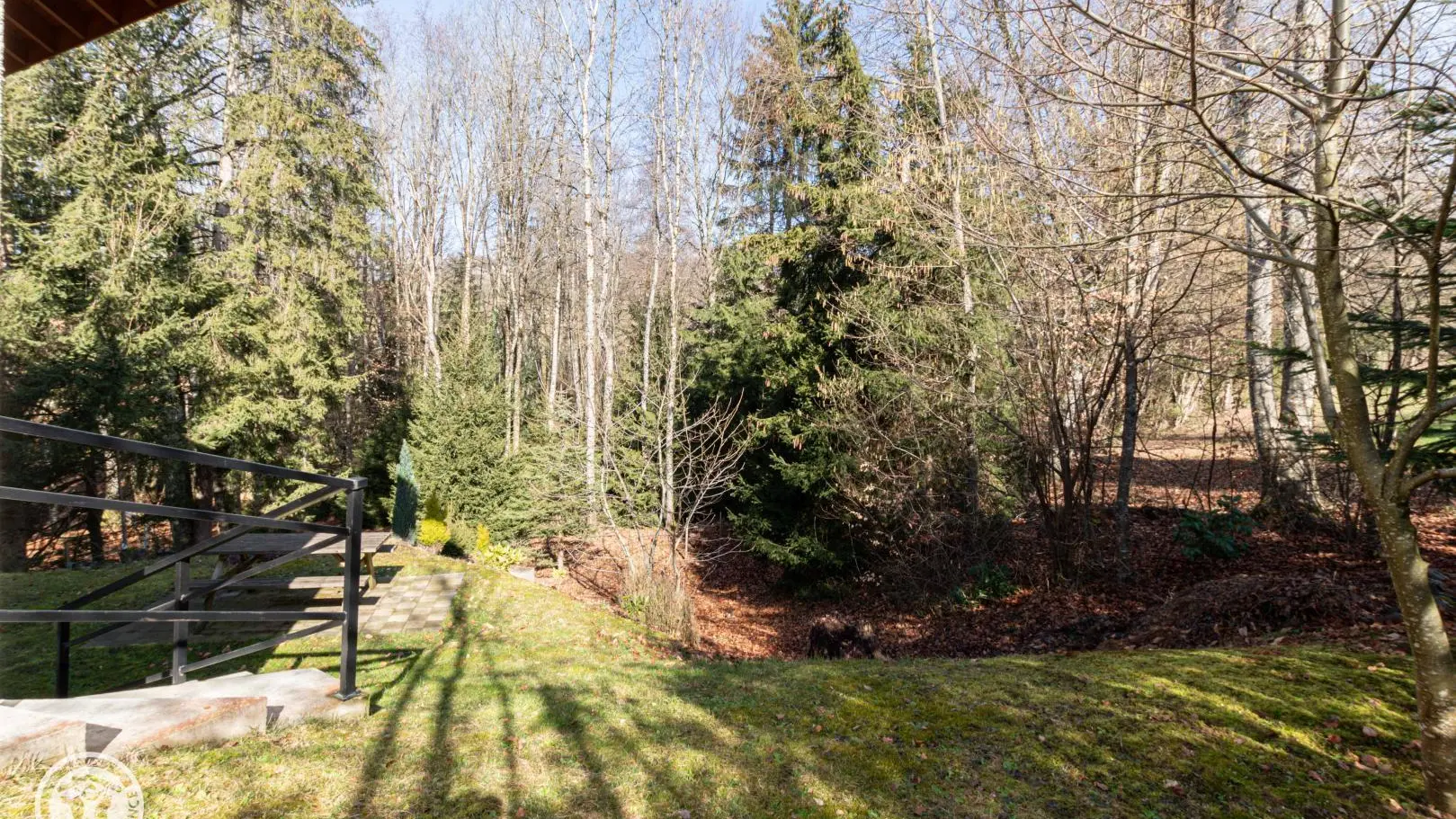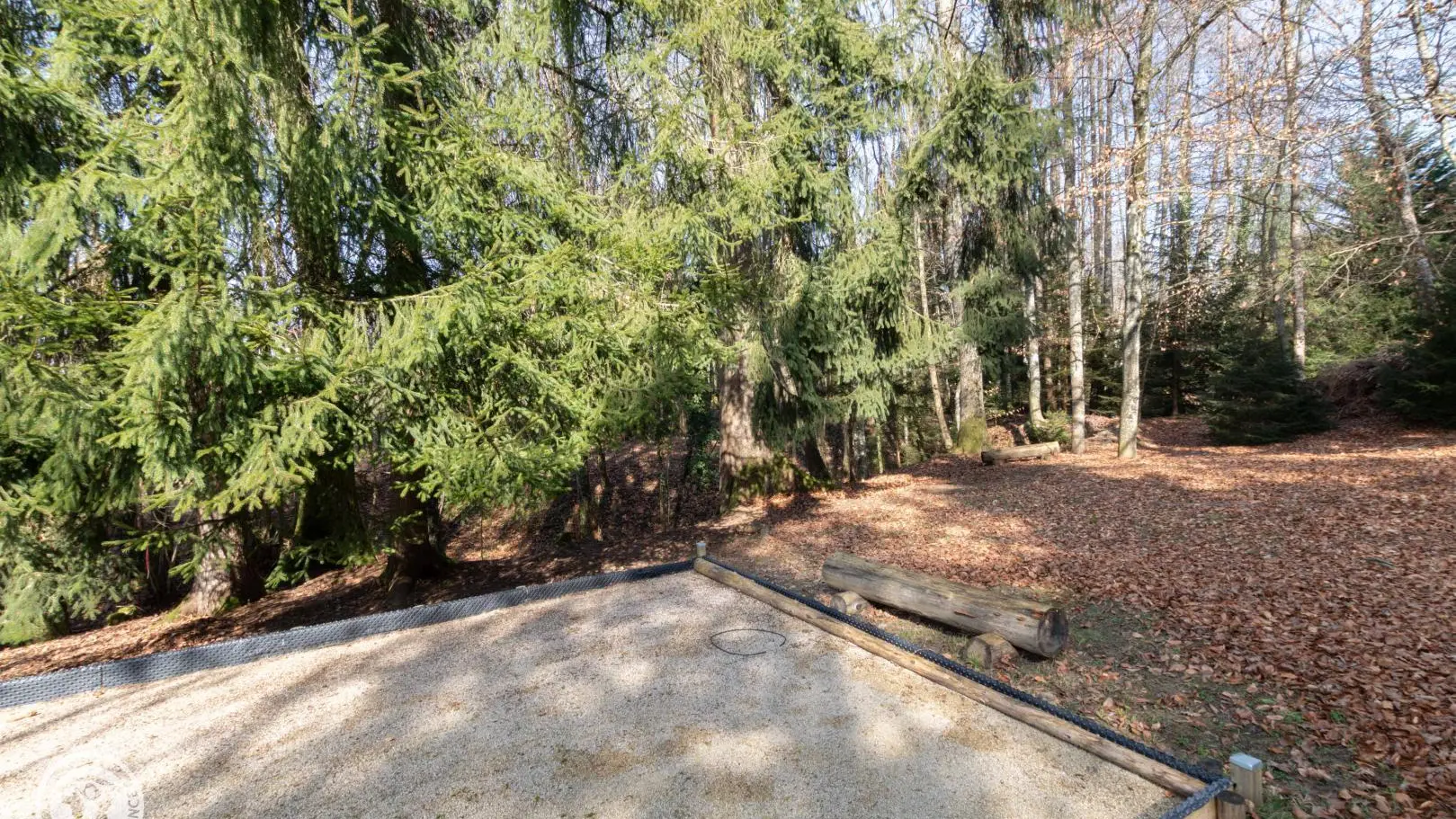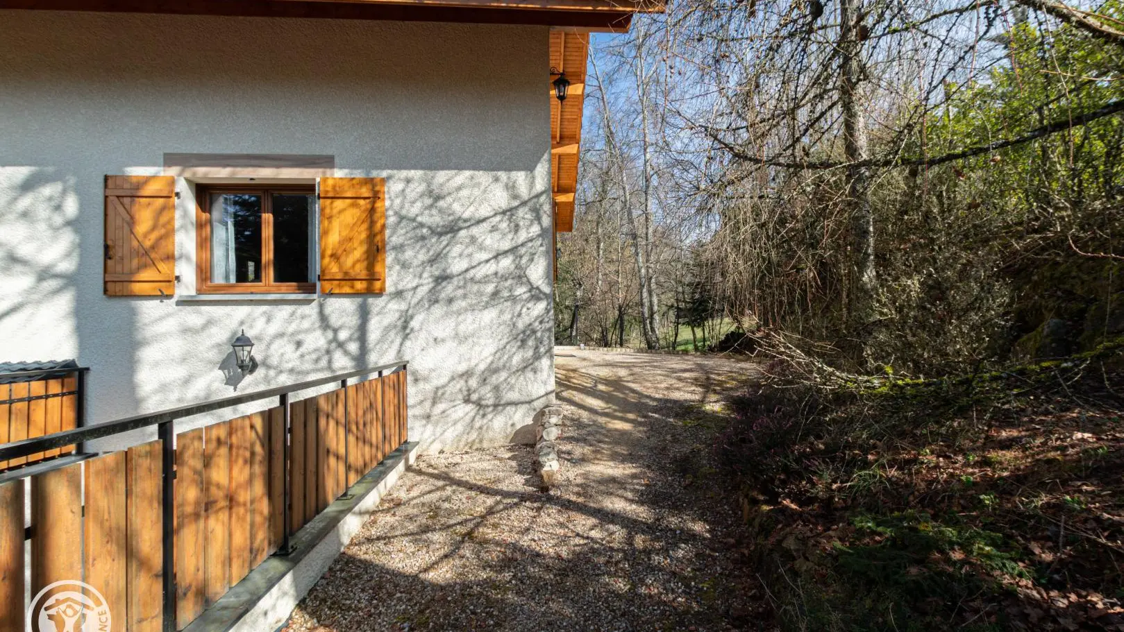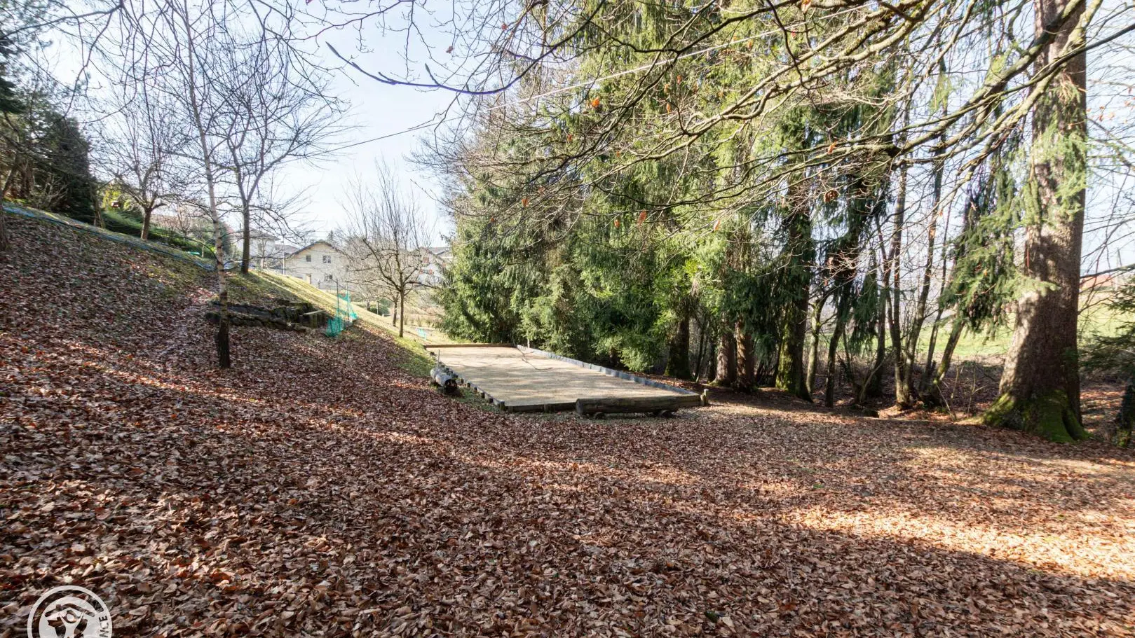 Un escalier extérieur permet d'accéder à la terrasse puis un cheminement dirige vers la zone de promenade (forêt, espace jeux avec terrains de boules…).