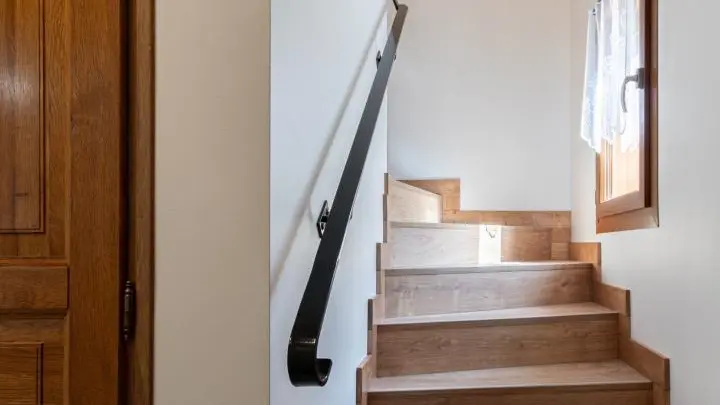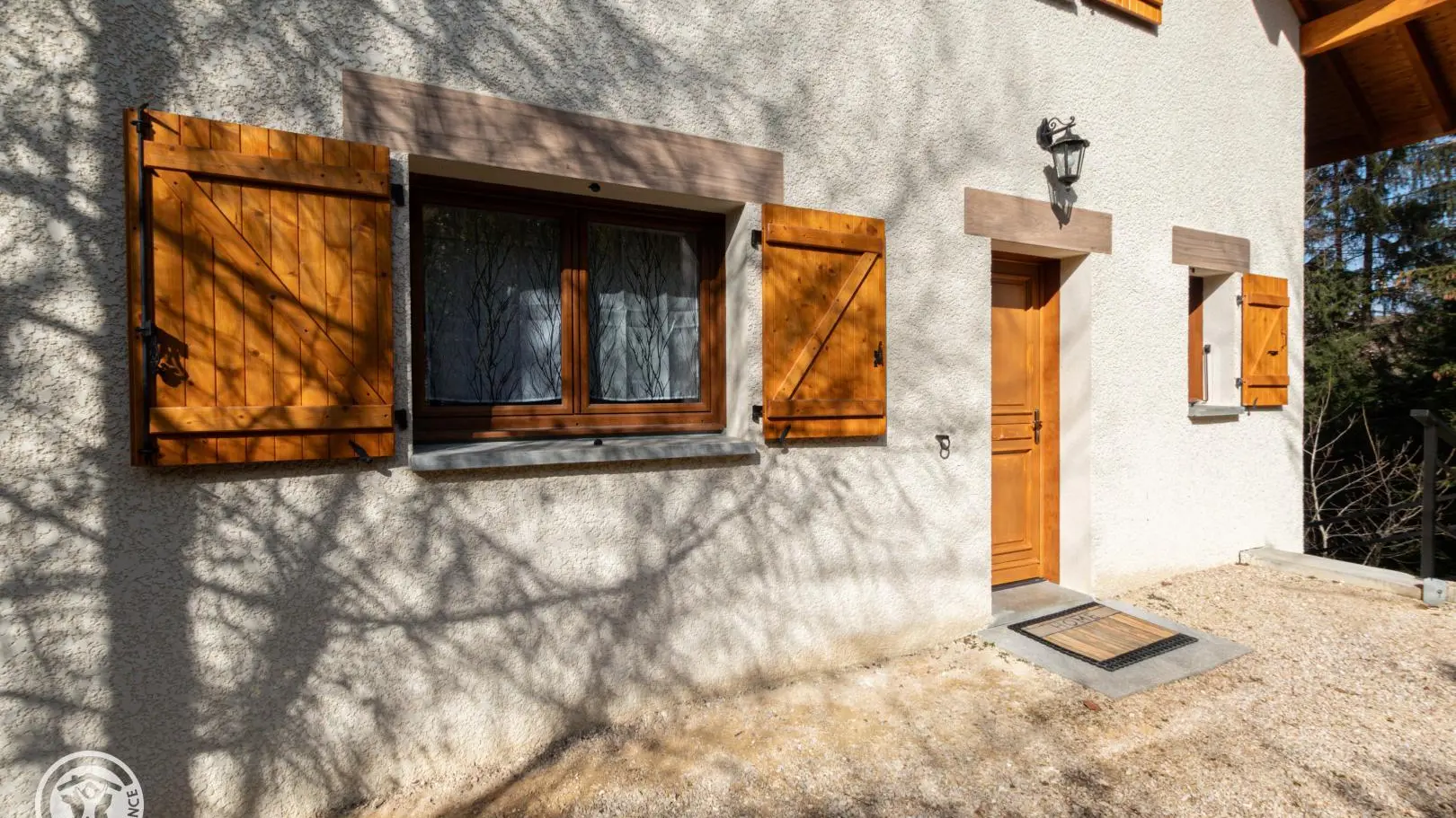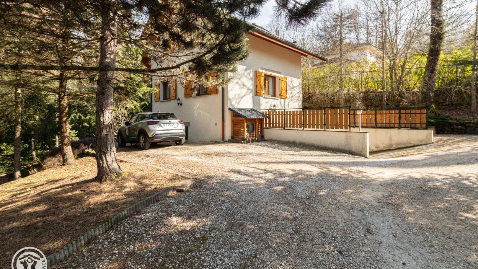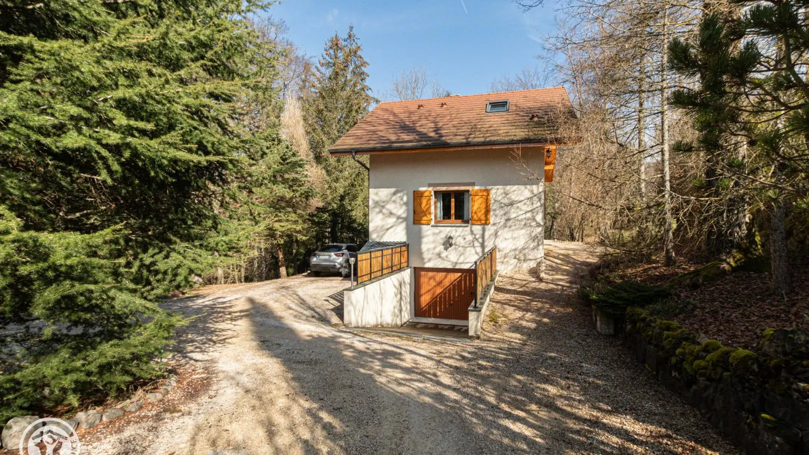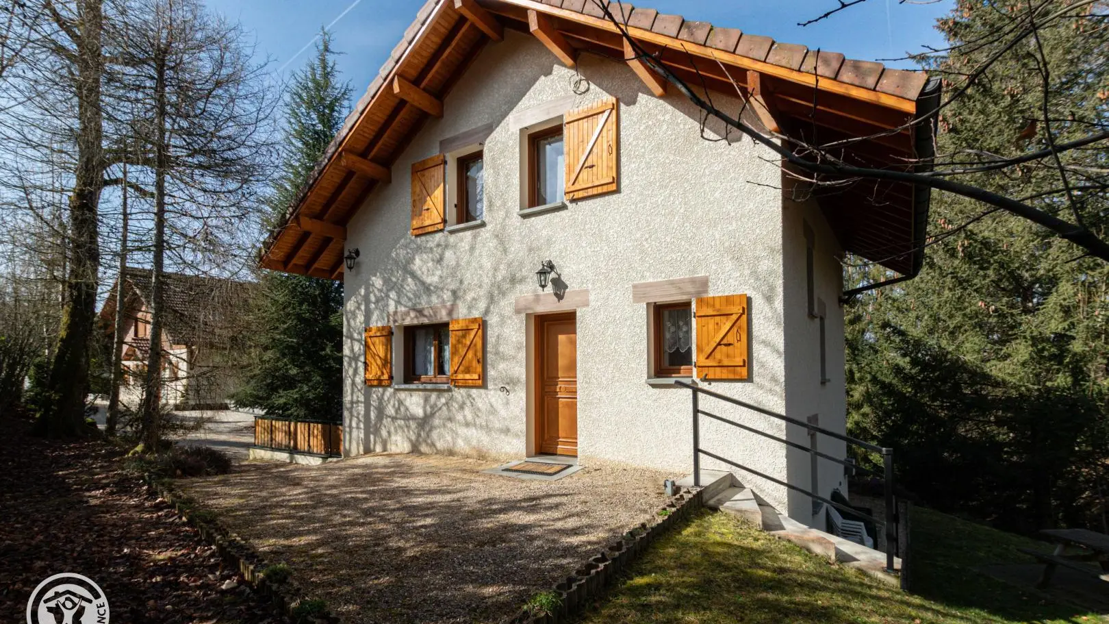 Un escalier extérieur permet d'accéder à la terrasse puis un cheminement dirige vers la zone de promenade (forêt, espace jeux avec terrains de boules…).